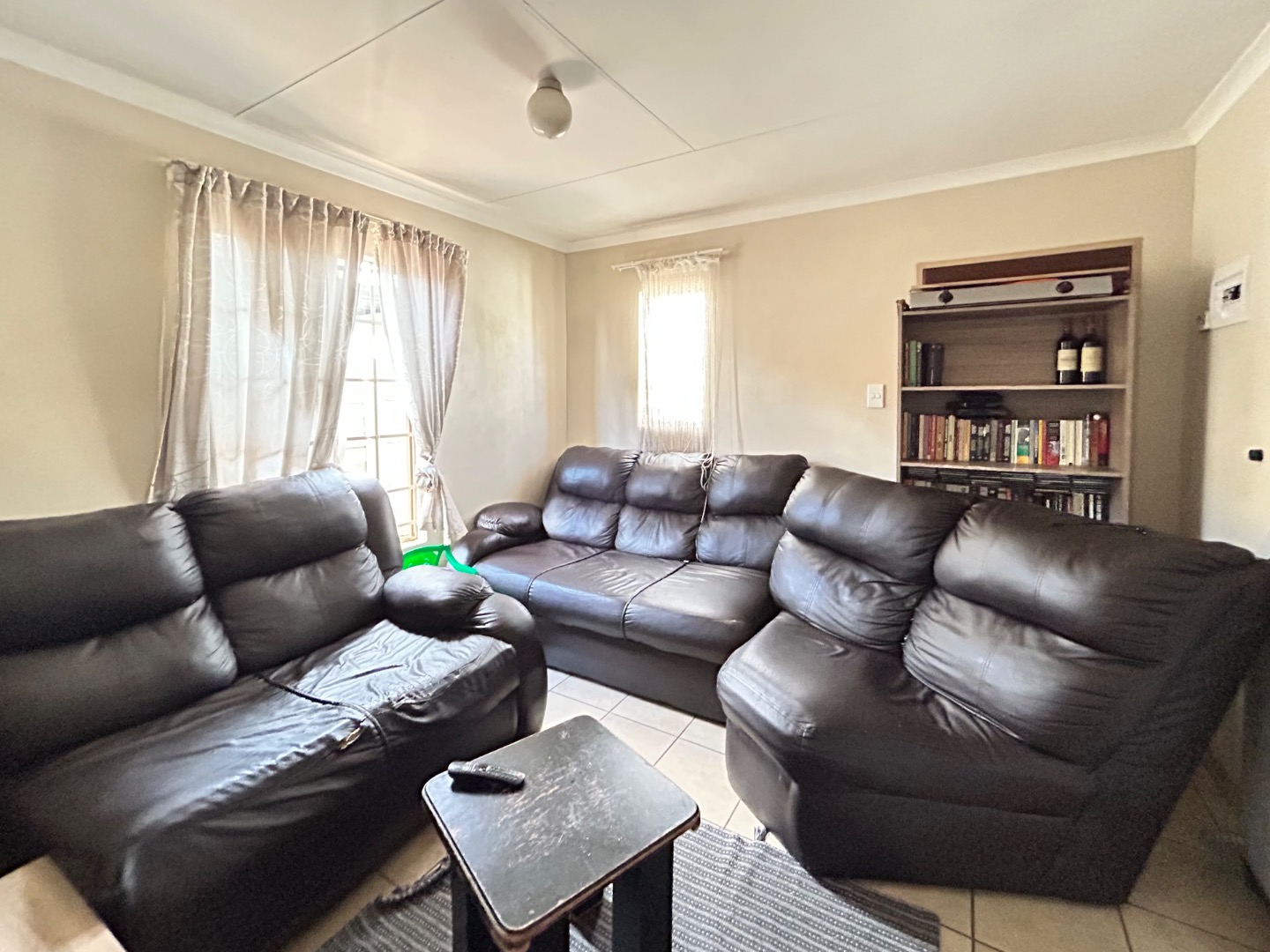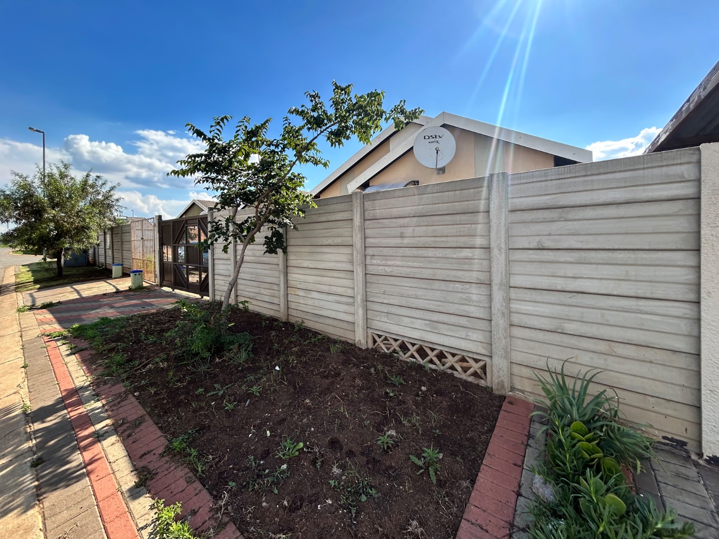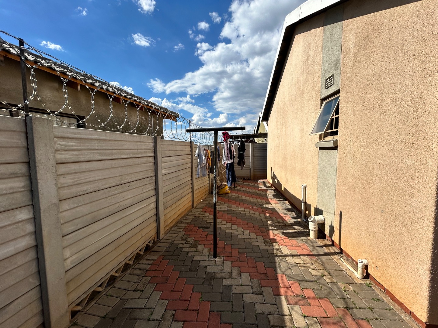 This inviting 3-bedroom, 2-bathroom residential property in the suburban heart of Sky City, Alberton, offers a practical and secure living environment. From the moment you arrive, the property presents a well-defined kerb appeal with sturdy precast concrete fencing and a functional access gate, ensuring privacy and security. The neatly paved front walkway and driveway, featuring attractive red and grey pavers, lead to the entrance, while the surrounding garden area, though currently undeveloped, offers a blank canvas for future landscaping and personal touches. The house exterior appears well-maintained, providing a solid first impression.