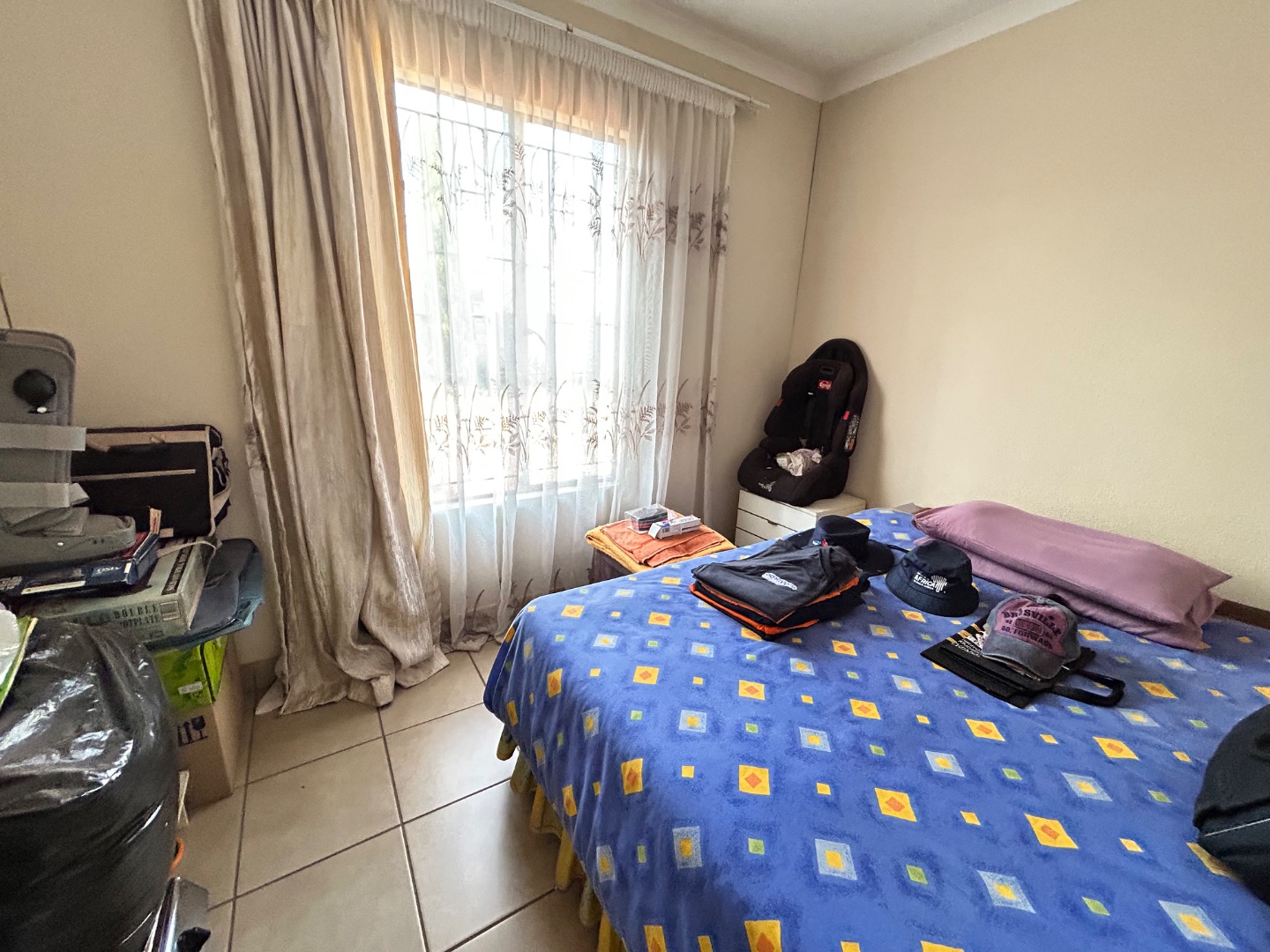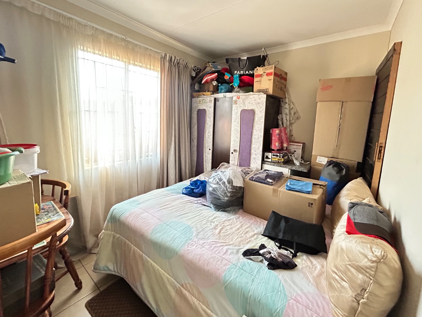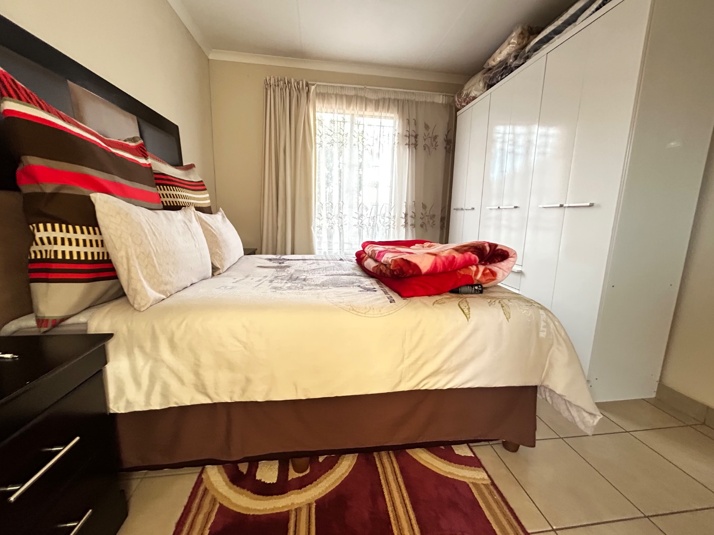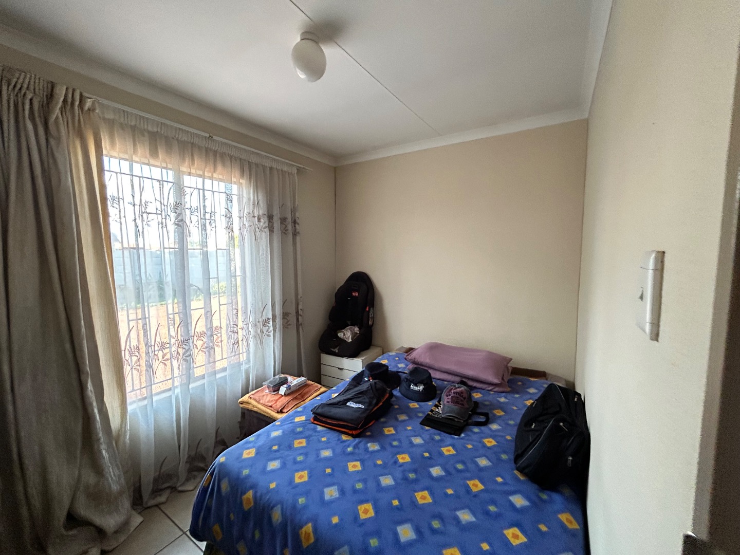 Nestled in the suburban community of Sky City, Alberton, this property offers a practical living solution in a developing area of South Africa. The single-story residence features a welcoming peach-colored exterior and a well-maintained tiled roof. Security is paramount, with fitted security bars on windows and a robust security gate on the main door, complemented by a concrete perimeter fence for privacy.