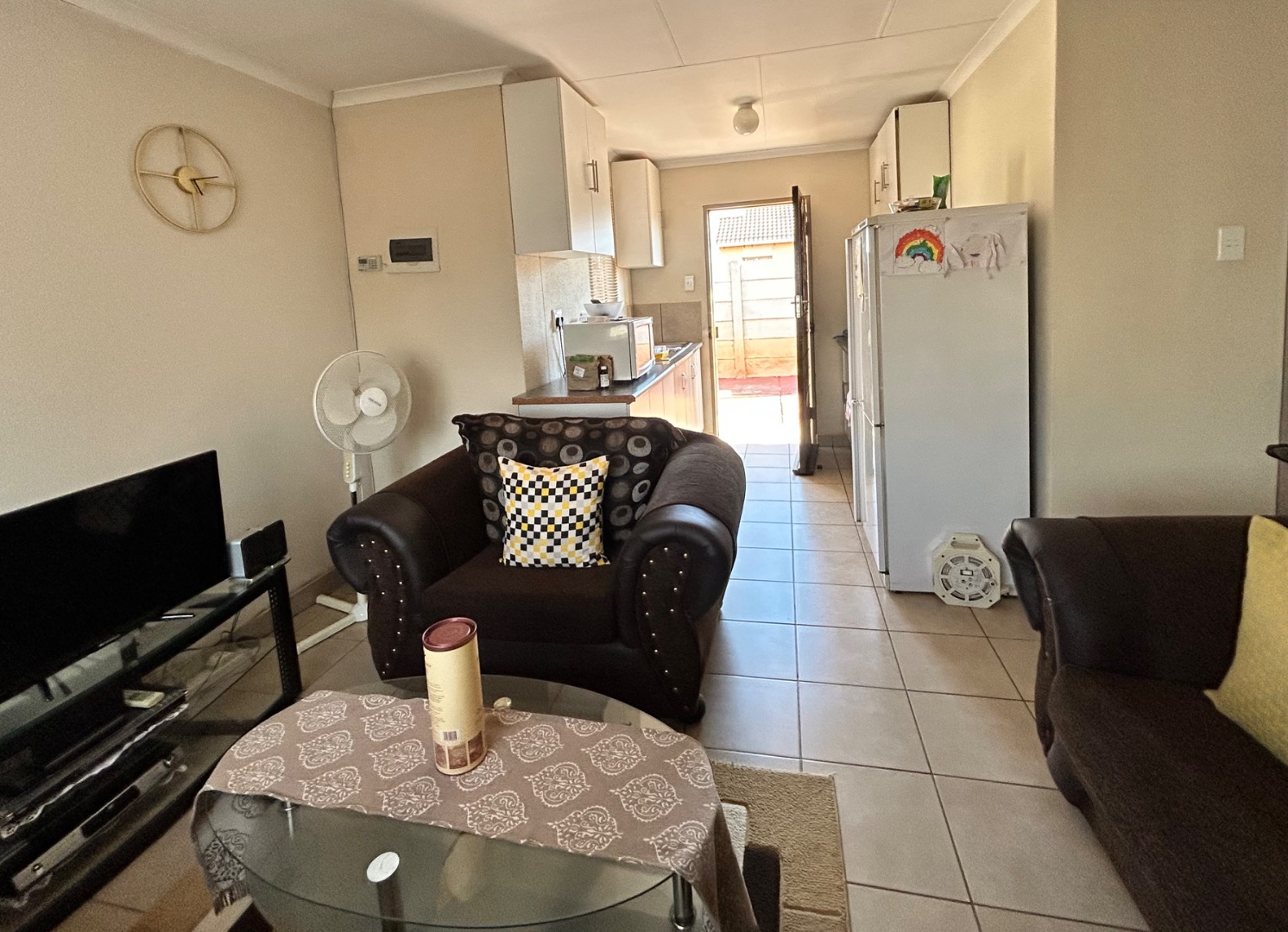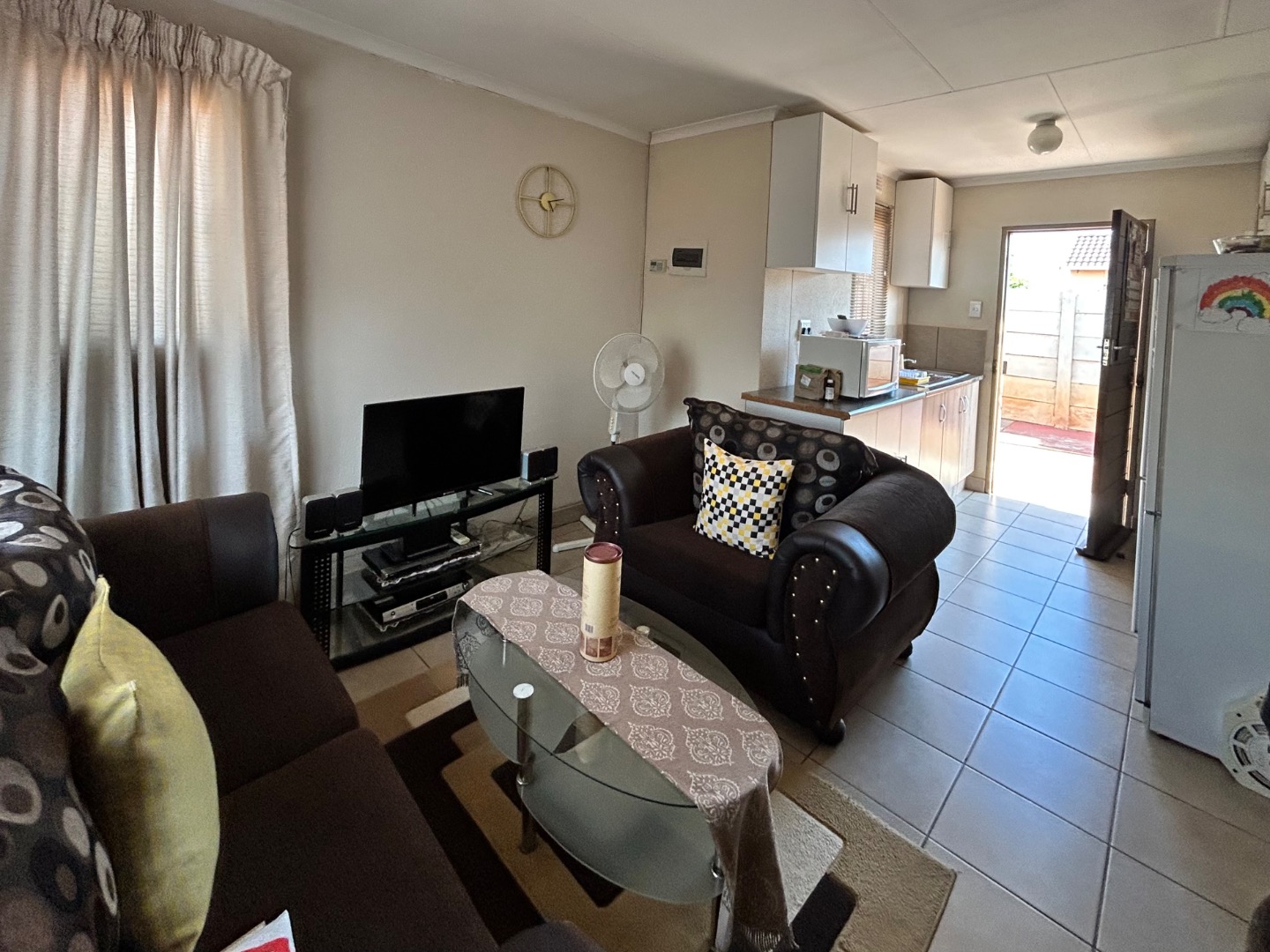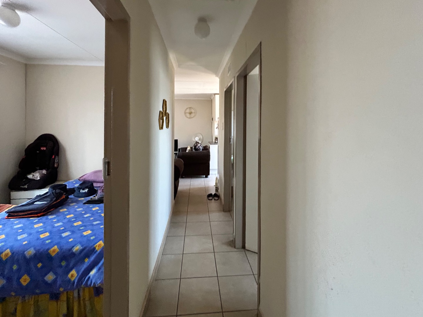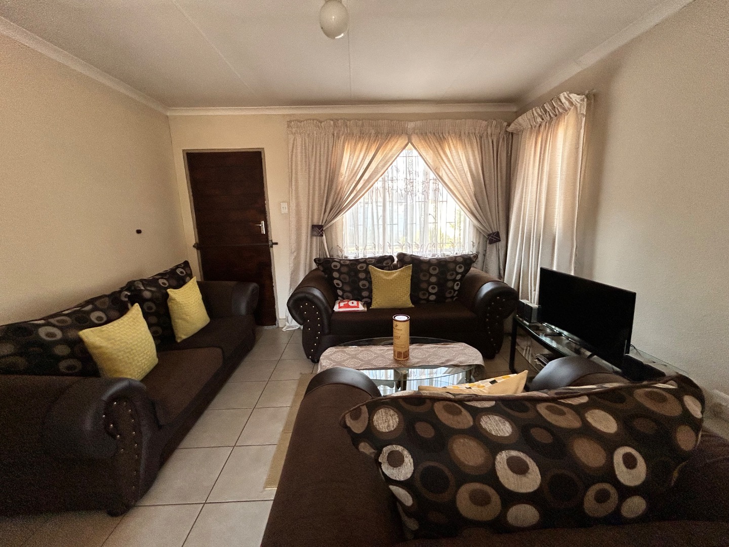 Nestled in the suburban community of Sky City, Alberton, this property offers a practical living solution in a developing area of South Africa. The single-story residence features a welcoming peach-colored exterior and a well-maintained tiled roof. Security is paramount, with fitted security bars on windows and a robust security gate on the main door, complemented by a concrete perimeter fence for privacy.