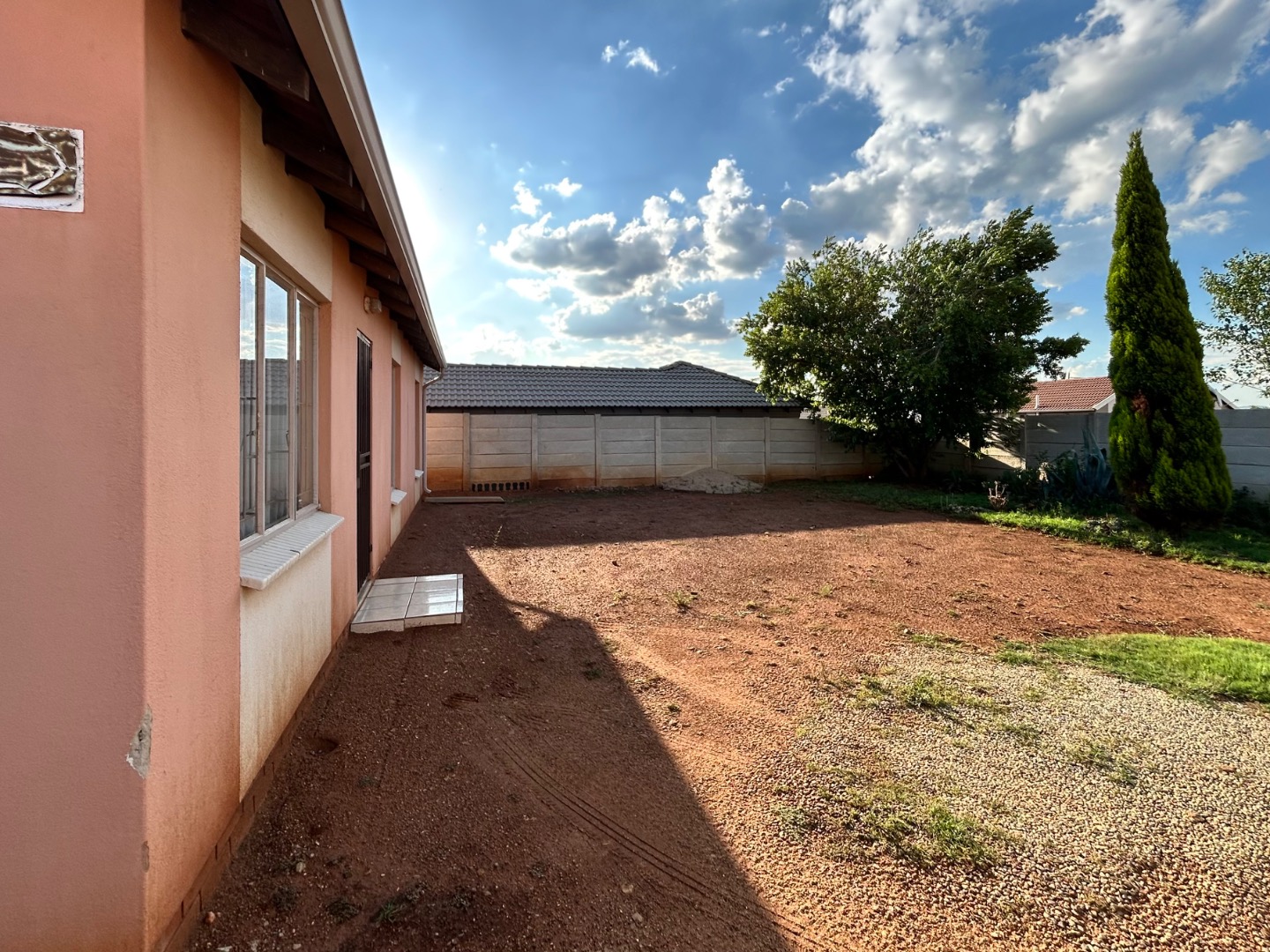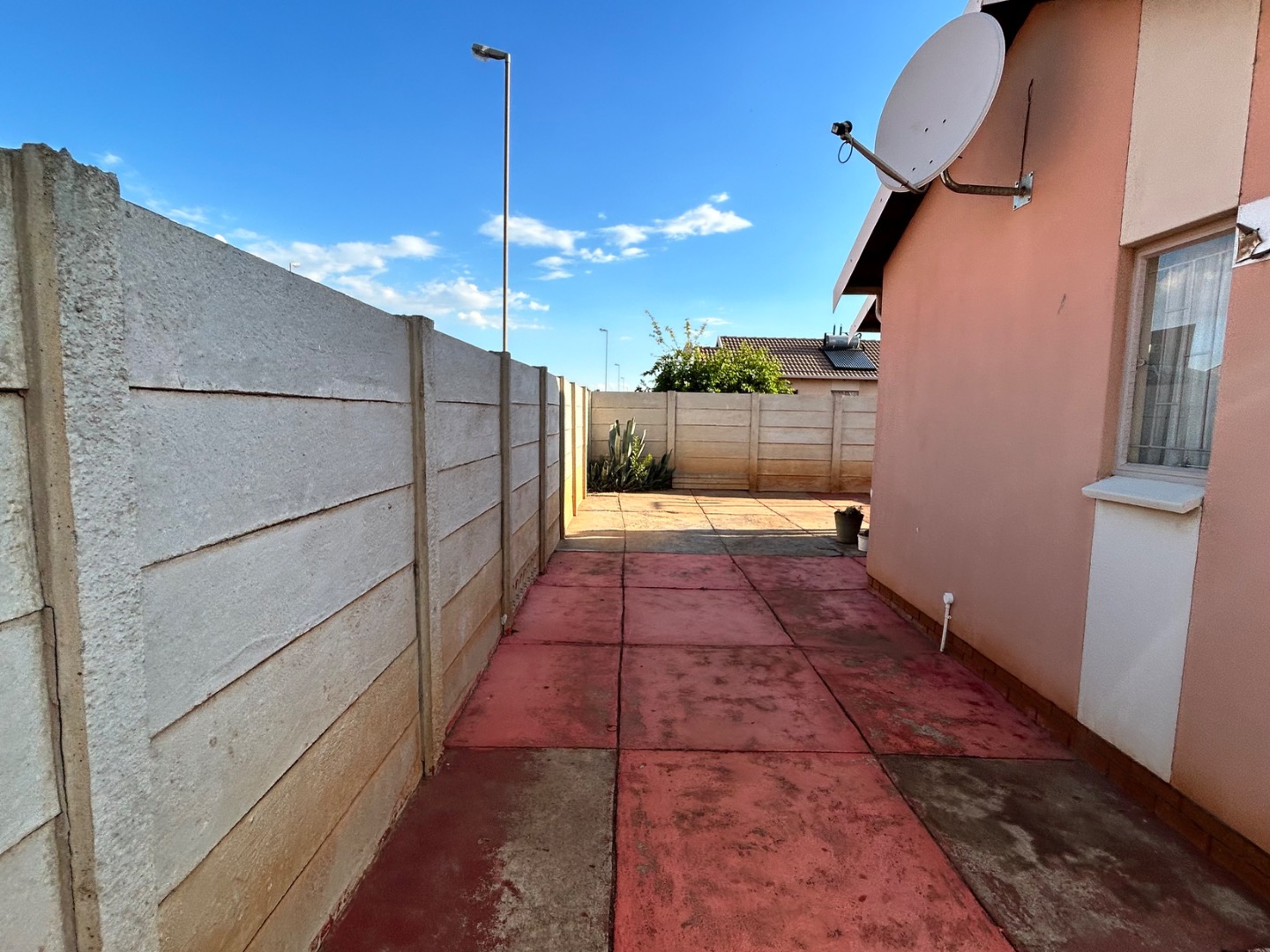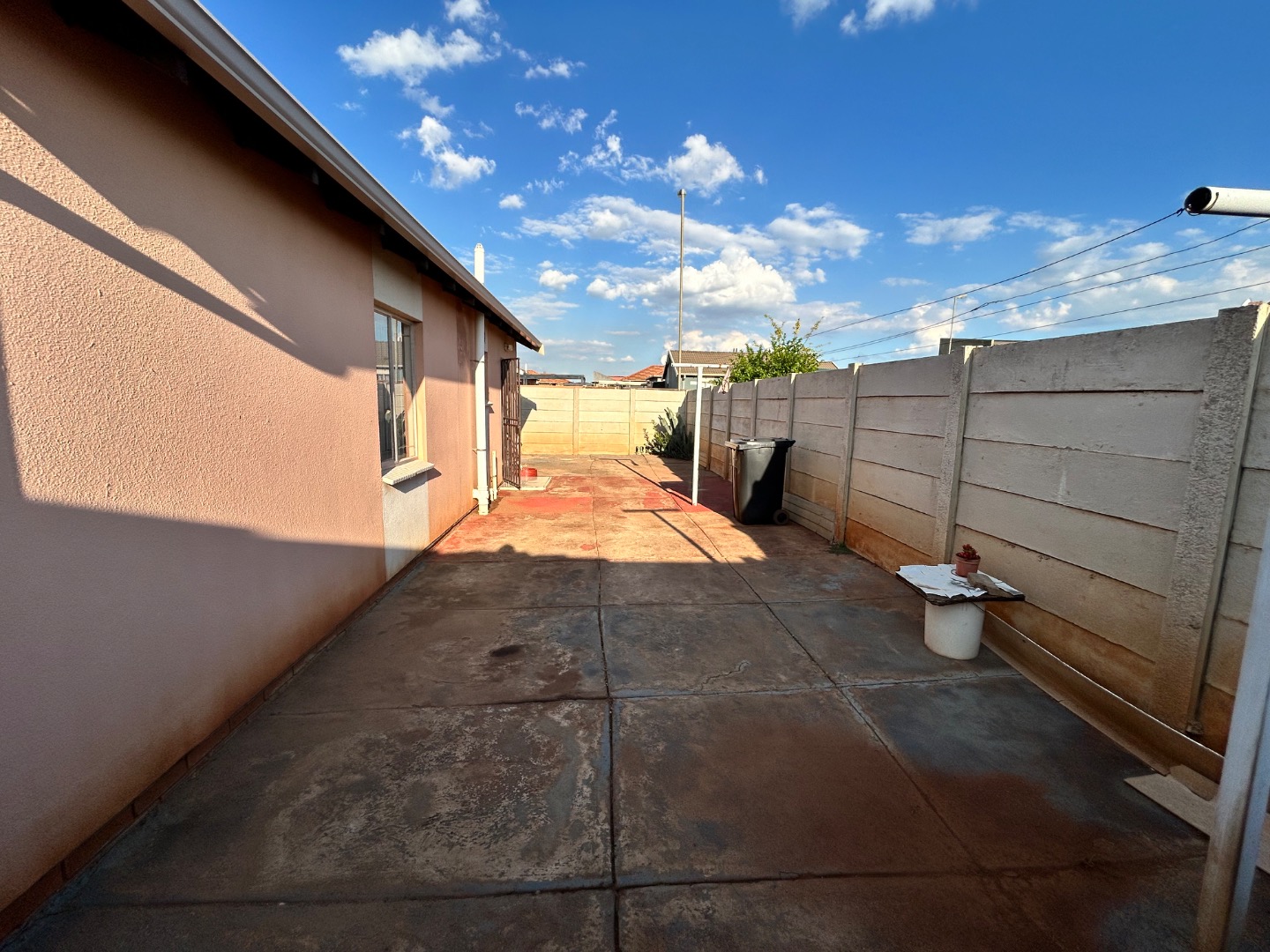 The expansive 333 sqm erf presents a significant opportunity for outdoor development. Currently featuring a largely undeveloped yard of soil and gravel, it awaits creative landscaping to transform it into a personalized garden oasis. A paved side yard, enclosed by high concrete boundary walls, offers a low-maintenance utility space, complete with a clothesline for convenience. The inclusion of a solar geyser further enhances the home's appeal, contributing to energy efficiency and reduced utility costs.