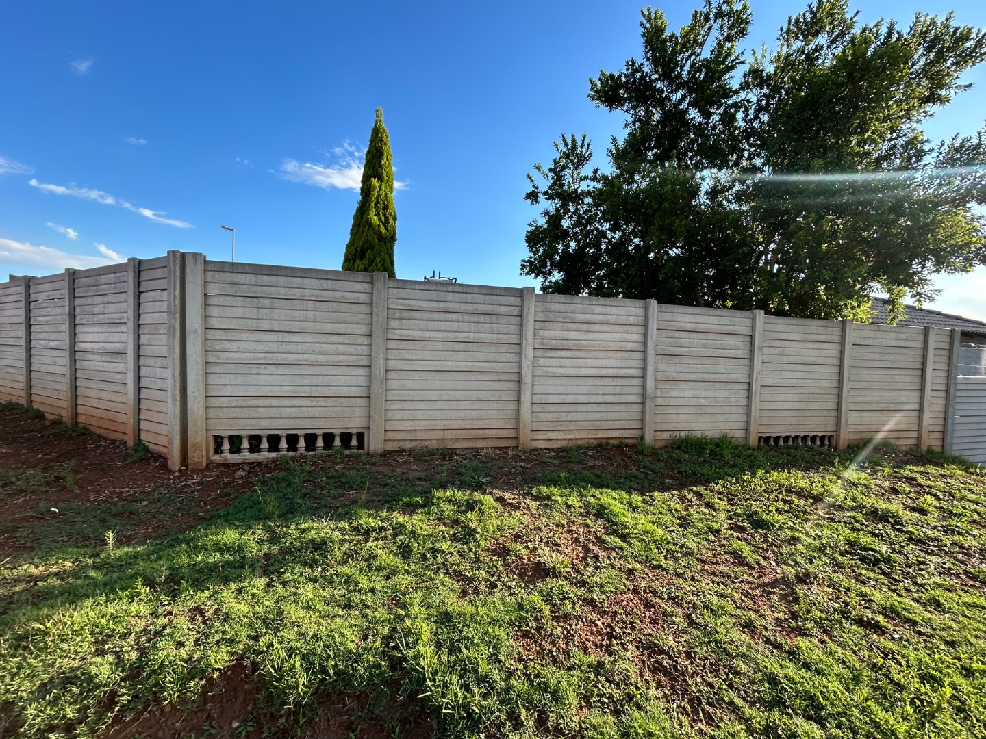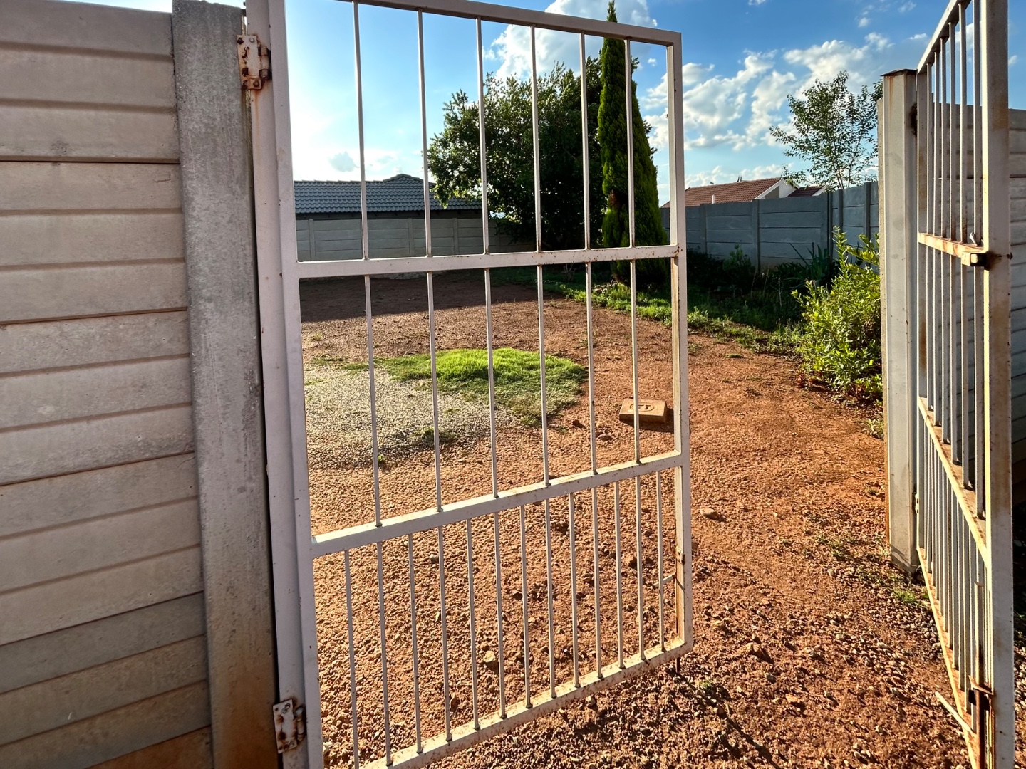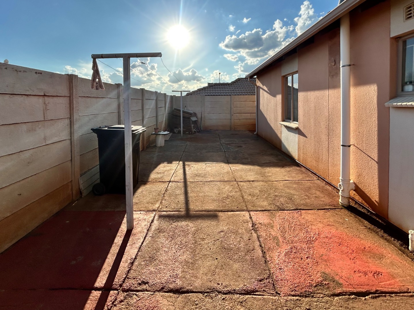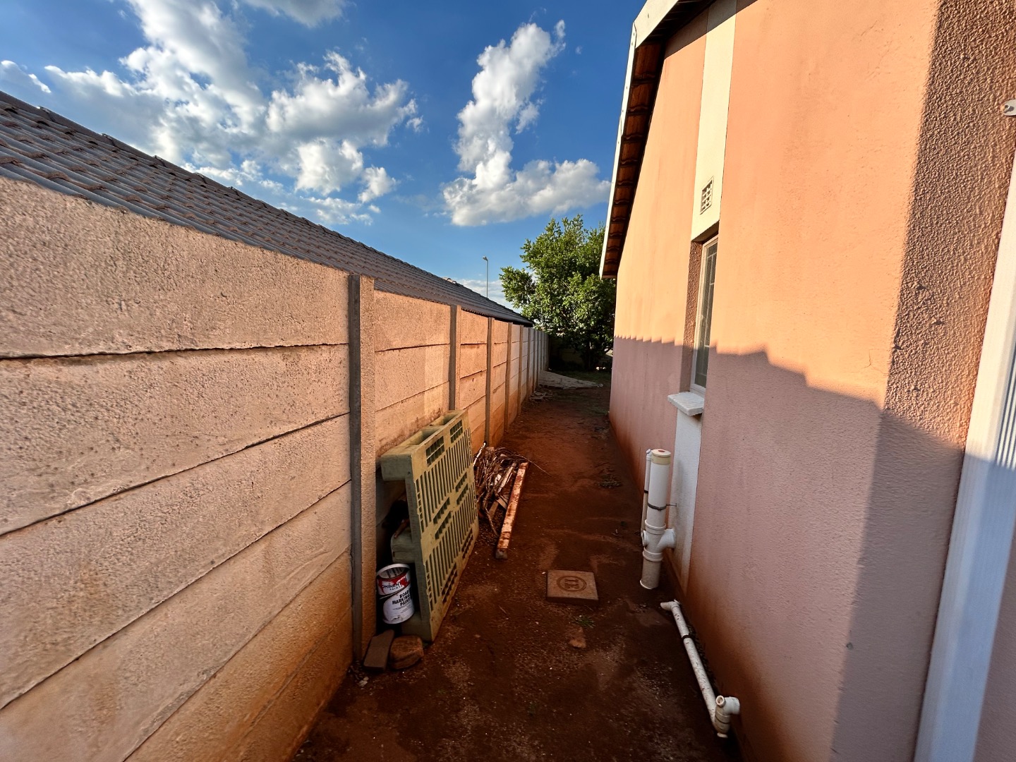 The expansive 333 sqm erf presents a significant opportunity for outdoor development. Currently featuring a largely undeveloped yard of soil and gravel, it awaits creative landscaping to transform it into a personalized garden oasis. A paved side yard, enclosed by high concrete boundary walls, offers a low-maintenance utility space, complete with a clothesline for convenience. The inclusion of a solar geyser further enhances the home's appeal, contributing to energy efficiency and reduced utility costs.