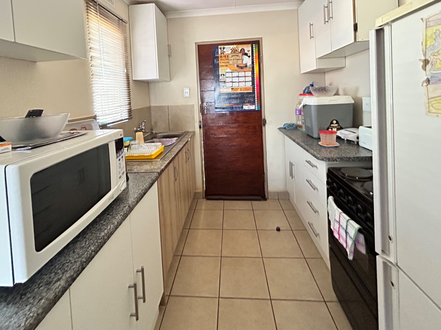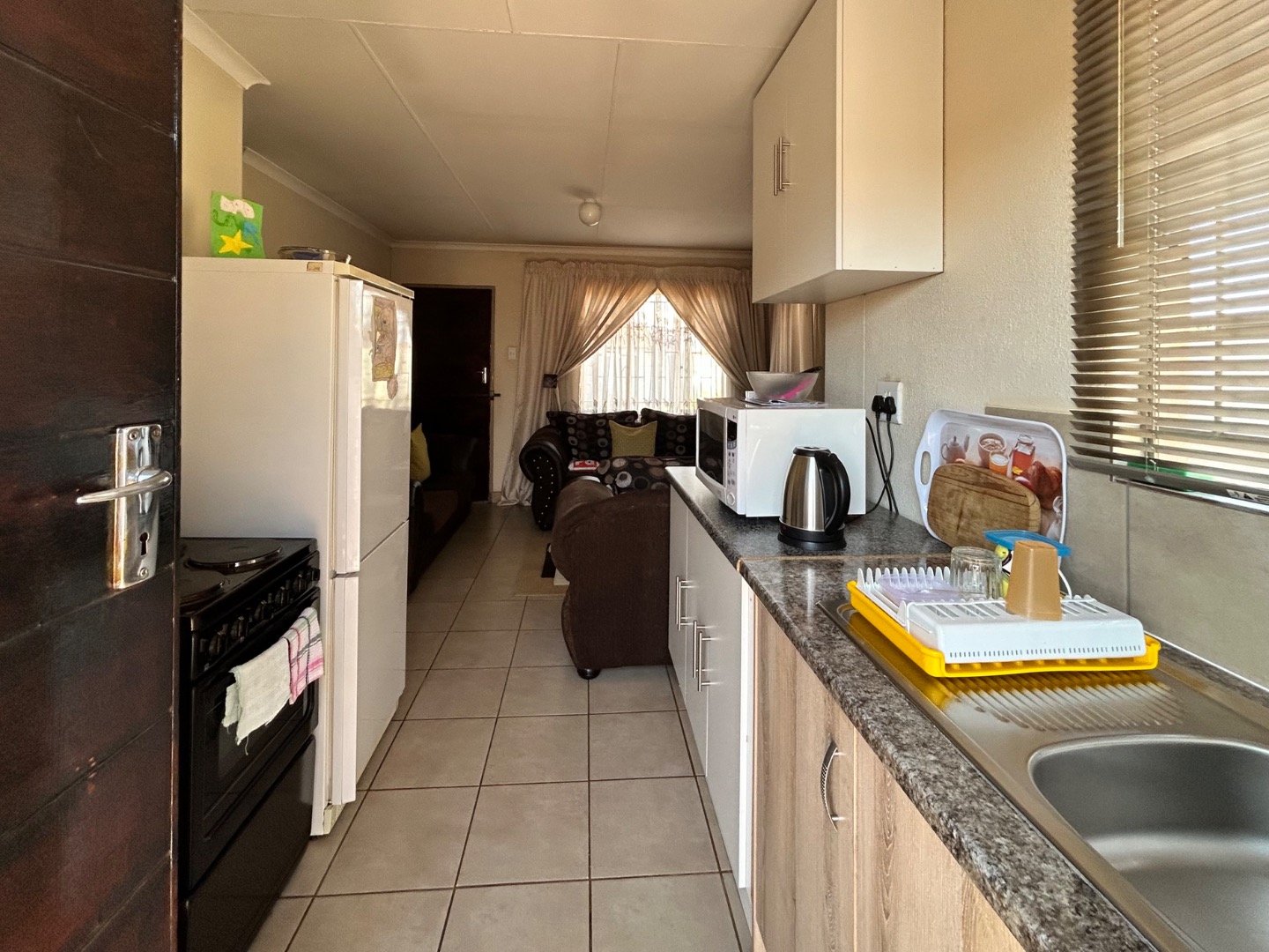 Inside, the home presents a practical open-plan layout, seamlessly connecting the kitchen and living areas. Tiled flooring extends throughout these spaces, ensuring easy maintenance. The functional galley-style kitchen is equipped with ample upper and lower cabinet storage, granite-look countertops, and a sink, providing sufficient space for freestanding appliances. The living room is brightened by natural light from a large window, offering a versatile space with neutral walls.