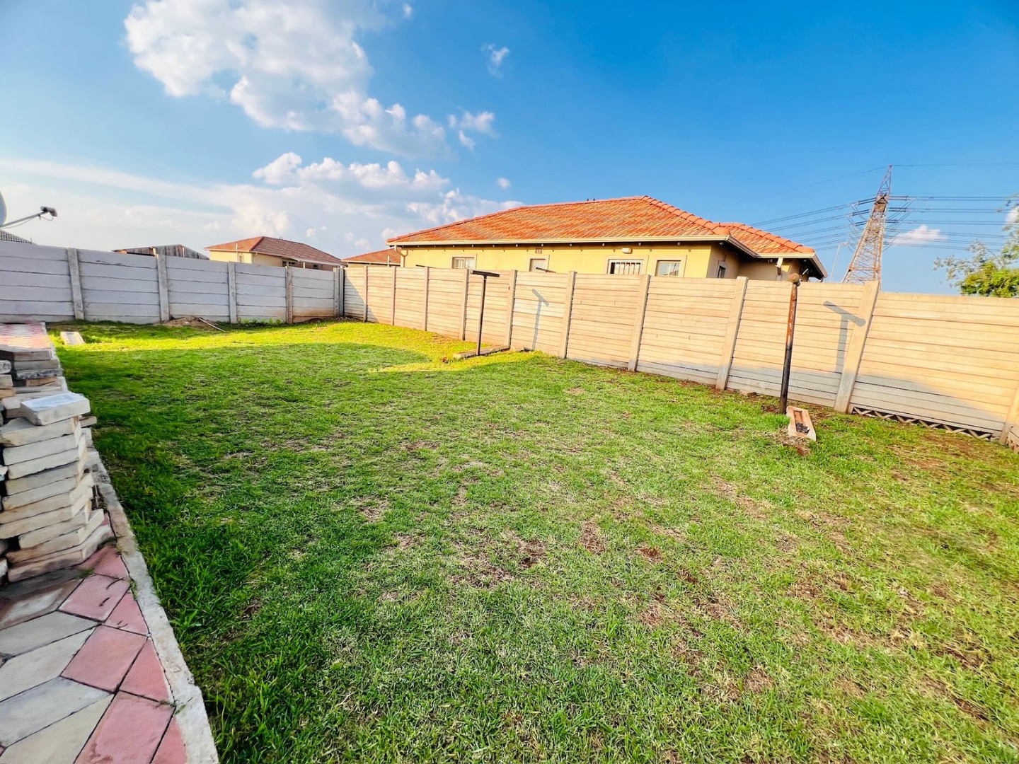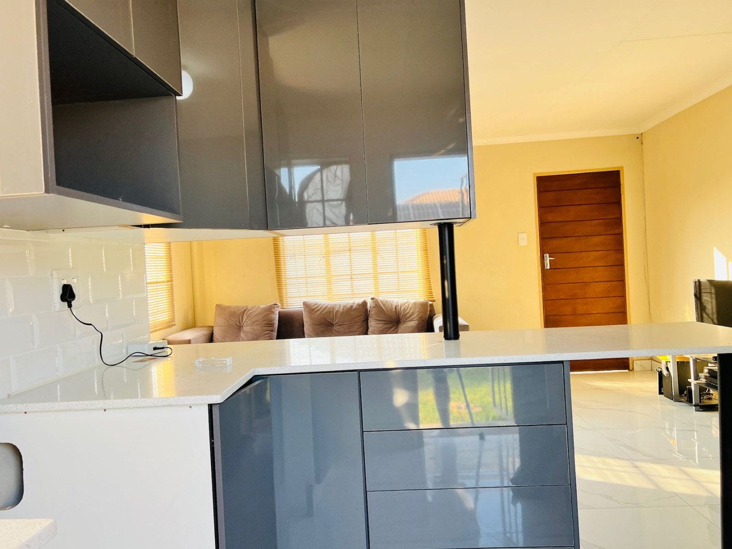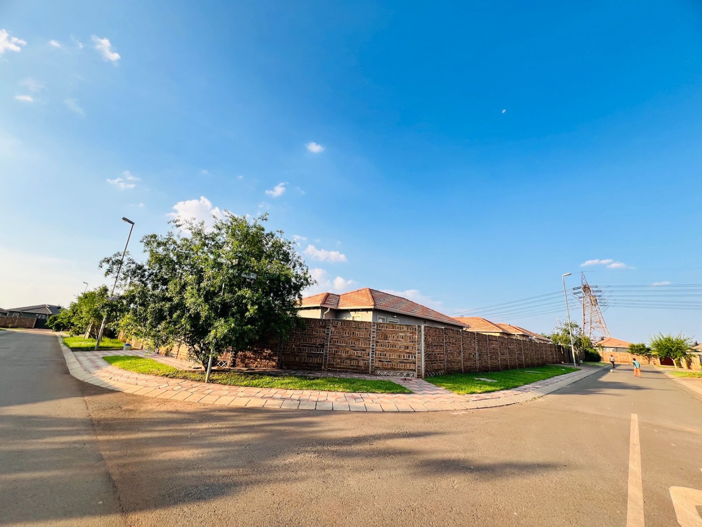 This inviting family home in Sky City, Alberton, offers a blend of modern living and practical features. The interior boasts an open-plan layout, seamlessly connecting the contemporary kitchen to the living and dining areas. The kitchen is a highlight, featuring sleek grey cabinetry, white subway tile backsplash, light countertops, and new large format tiled flooring, creating a fresh and functional space for daily life and entertaining. Neutral wall colours and good natural light enhance the overall ambiance. The residence comprises three well-proportioned bedrooms, each with durable tiled flooring and neutral walls, providing a versatile canvas for personal style. The two bathrooms are practical, featuring neutral tiling, a full bathtub, and a window for natural light and ventilation. A modern, light-colored tiled hallway connects the various living spaces, ensuring a cohesive flow throughout the home. Externally, the property is designed for low maintenance and security. It features an extensive, geometrically patterned paved yard, complemented by small, manicured lawn areas. A covered carport provides sheltered parking, in addition to the three garages. Security is paramount, with burglar bars on windows, a security gate, and high perimeter fencing ensuring peace of mind. The home also benefits from a solar water heater, contributing to energy efficiency. Located in the vibrant Sky City, Alberton, this property offers convenient living in a well-established South African community. Its kerb appeal is enhanced by a well-maintained exterior and a durable tiled roof. Key Features: * 3 Bedrooms, 2 Bathrooms * Modern Open-Plan Kitchen * Extensive Paved Yard * Covered Carport & 3 Garages * Solar Water Heater * Enhanced Security Features * Tiled Flooring Throughout * 350 sqm Erf Size