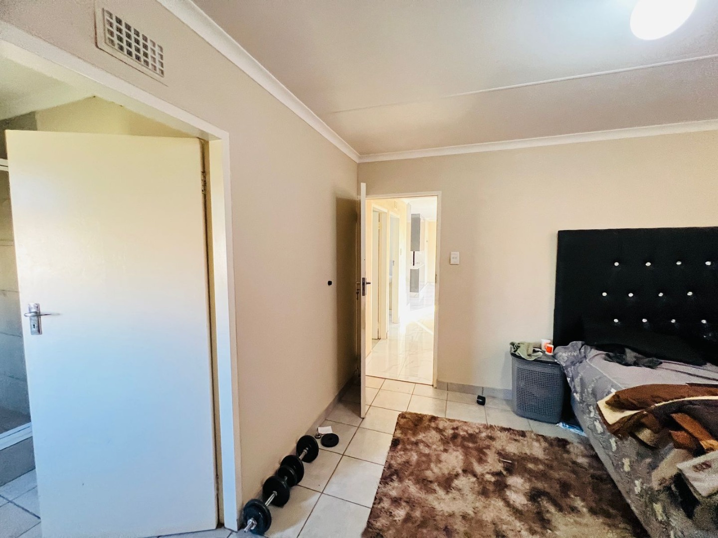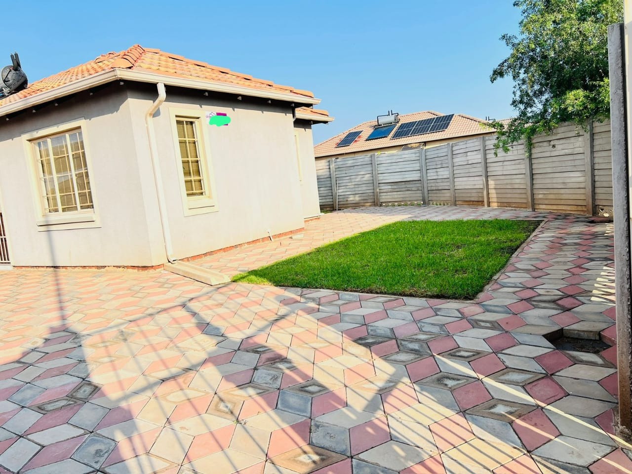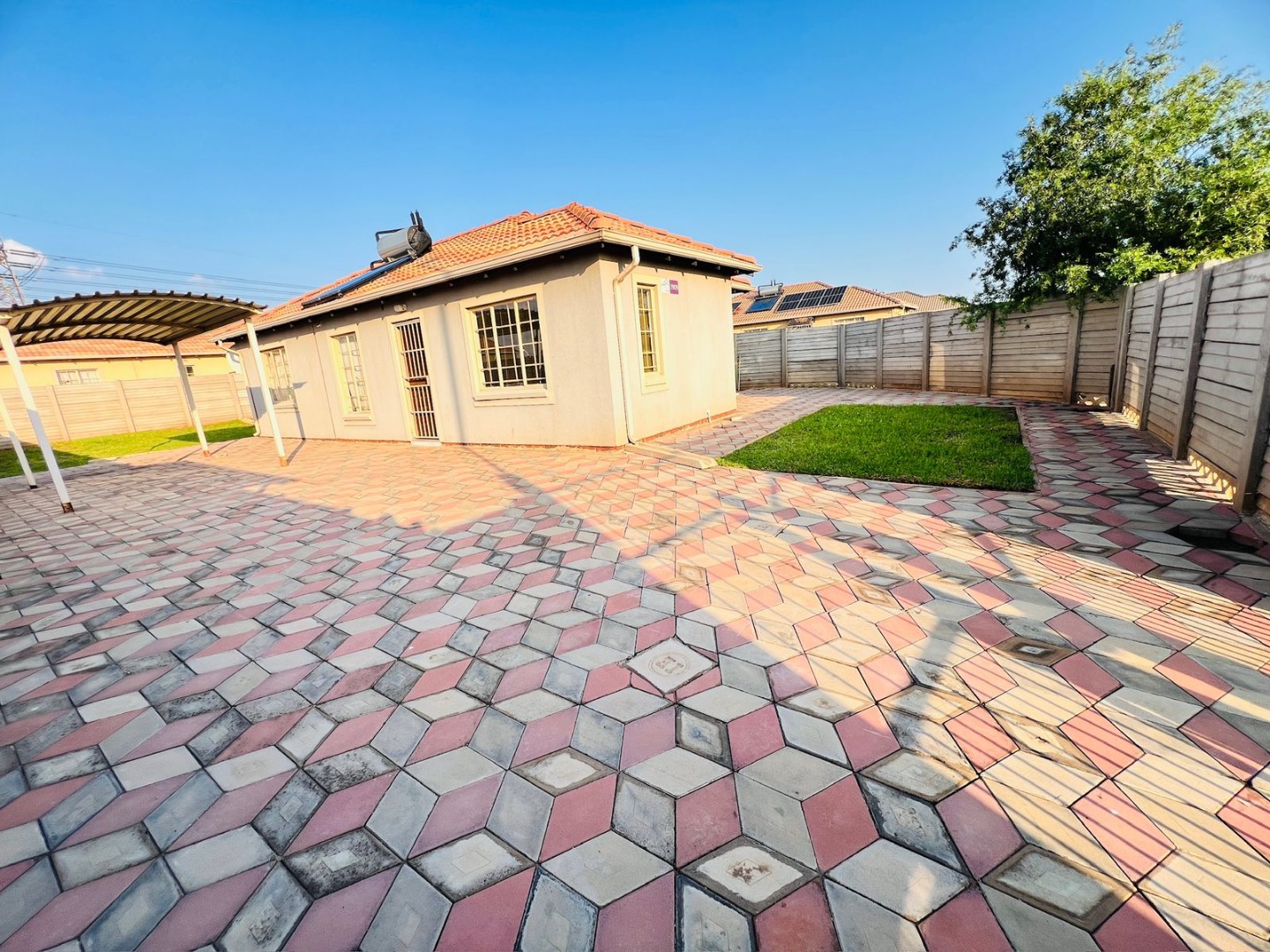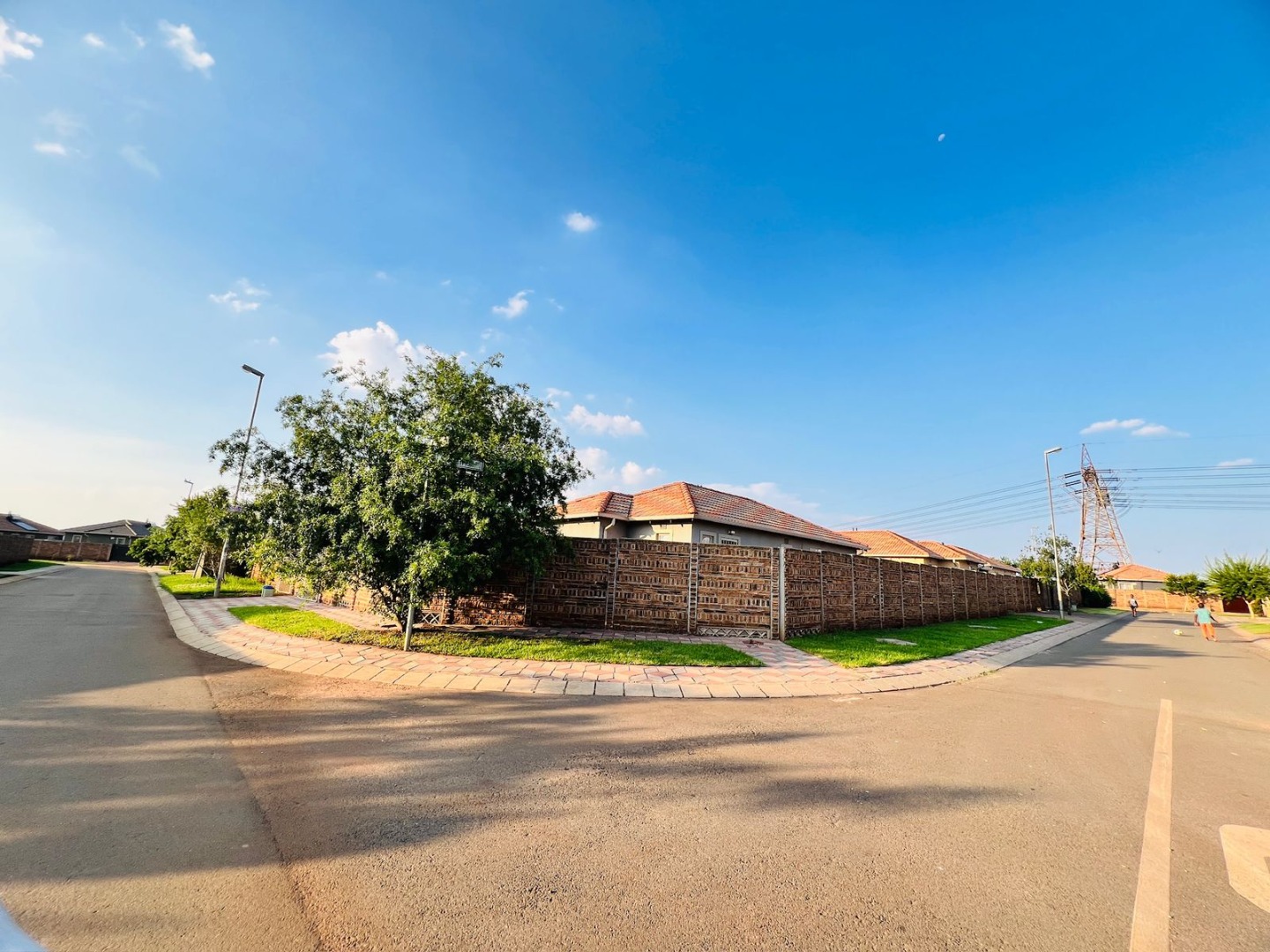 This inviting family home in Sky City, Alberton, offers a blend of modern living and practical features. The interior boasts an open-plan layout, seamlessly connecting the contemporary kitchen to the living and dining areas. The kitchen is a highlight, featuring sleek grey cabinetry, white subway tile backsplash, light countertops, and new large format tiled flooring, creating a fresh and functional space for daily life and entertaining. Neutral wall colours and good natural light enhance the overall ambiance. The residence comprises three well-proportioned bedrooms, each with durable tiled flooring and neutral walls, providing a versatile canvas for personal style. The two bathrooms are practical, featuring neutral tiling, a full bathtub, and a window for natural light and ventilation. A modern, light-colored tiled hallway connects the various living spaces, ensuring a cohesive flow throughout the home. Externally, the property is designed for low maintenance and security. It features an extensive, geometrically patterned paved yard, complemented by small, manicured lawn areas. A covered carport provides sheltered parking, in addition to the three garages. Security is paramount, with burglar bars on windows, a security gate, and high perimeter fencing ensuring peace of mind. The home also benefits from a solar water heater, contributing to energy efficiency. Located in the vibrant Sky City, Alberton, this property offers convenient living in a well-established South African community. Its kerb appeal is enhanced by a well-maintained exterior and a durable tiled roof. Key Features: * 3 Bedrooms, 2 Bathrooms * Modern Open-Plan Kitchen * Extensive Paved Yard * Covered Carport & 3 Garages * Solar Water Heater * Enhanced Security Features * Tiled Flooring Throughout * 350 sqm Erf Size