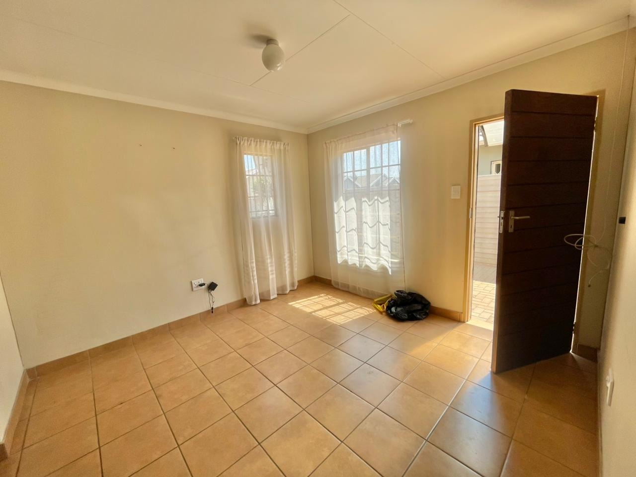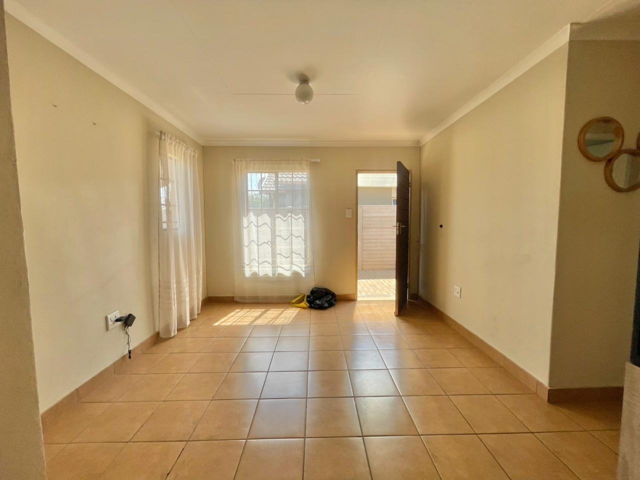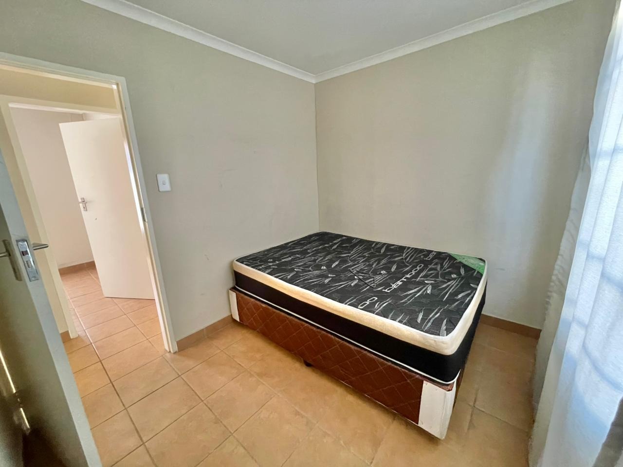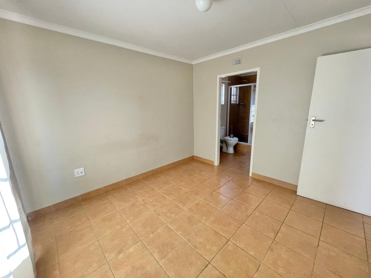 Step inside to discover an open-plan lounge and kitchen area, featuring durable tiled flooring and neutral wall colours throughout, offering a versatile canvas for personal decor. The home includes three comfortable bedrooms and two bathrooms, with one being an en-suite for added convenience. Natural light fills the spaces, and windows are fitted with security bars, reinforcing the home's secure nature.