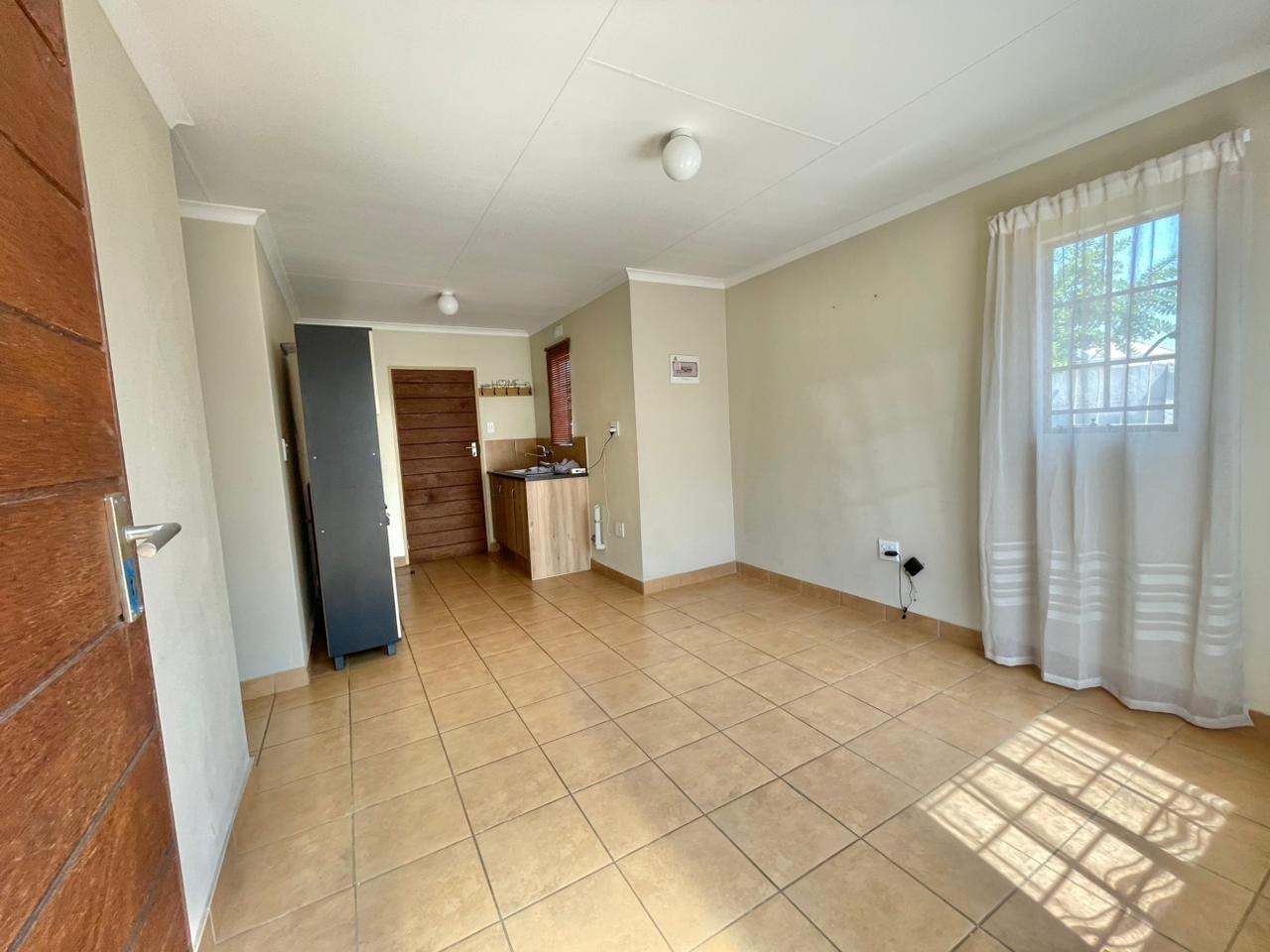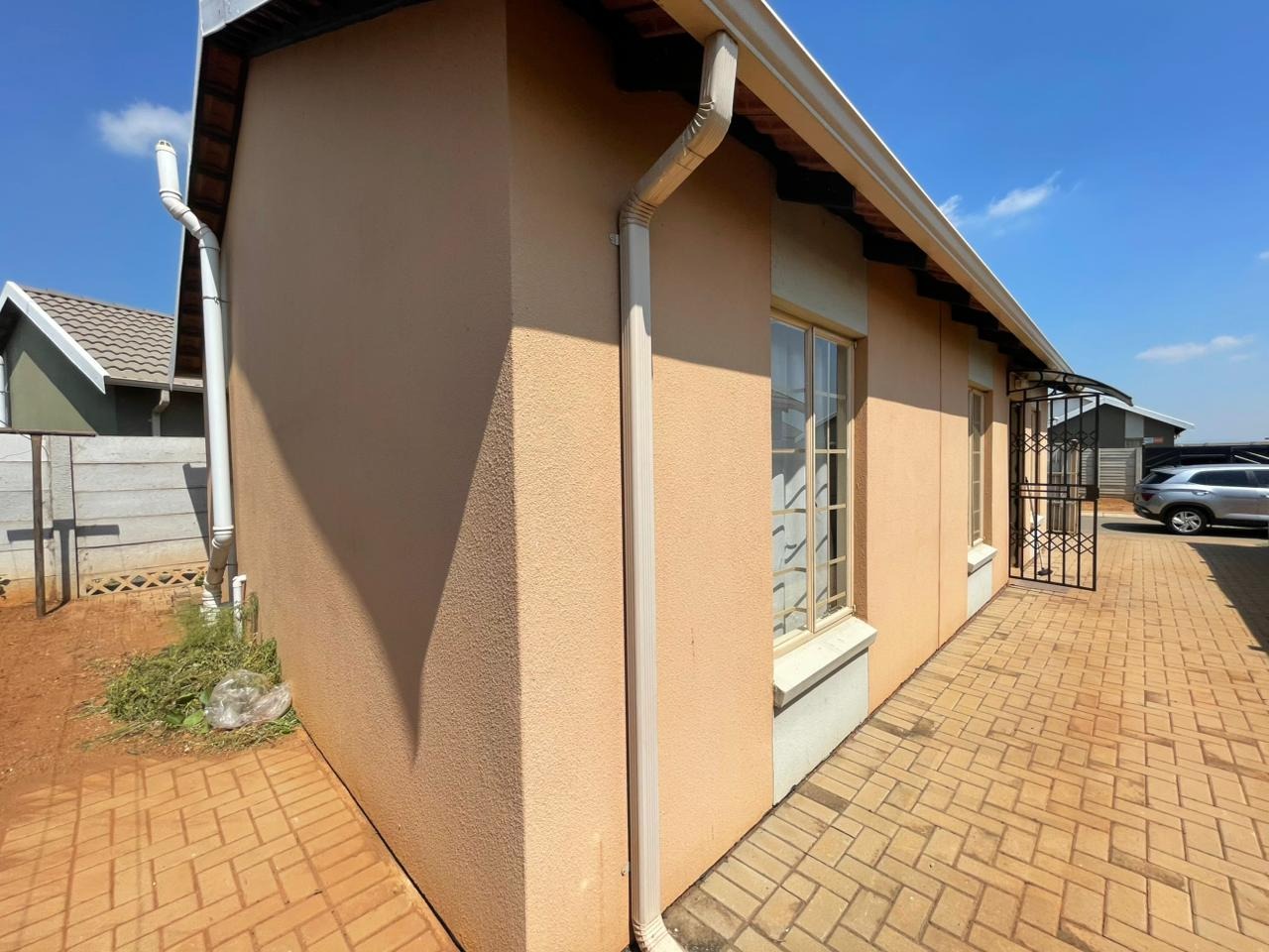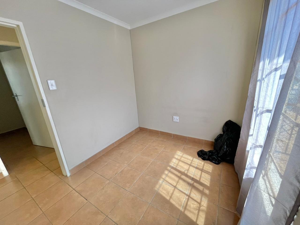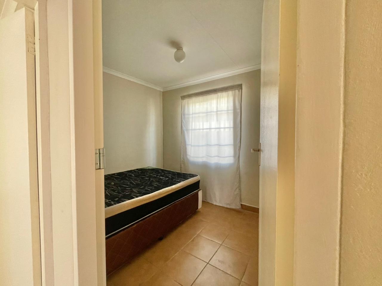 Step inside to discover an open-plan lounge and kitchen area, featuring durable tiled flooring and neutral wall colours throughout, offering a versatile canvas for personal decor. The home includes three comfortable bedrooms and two bathrooms, with one being an en-suite for added convenience. Natural light fills the spaces, and windows are fitted with security bars, reinforcing the home's secure nature.