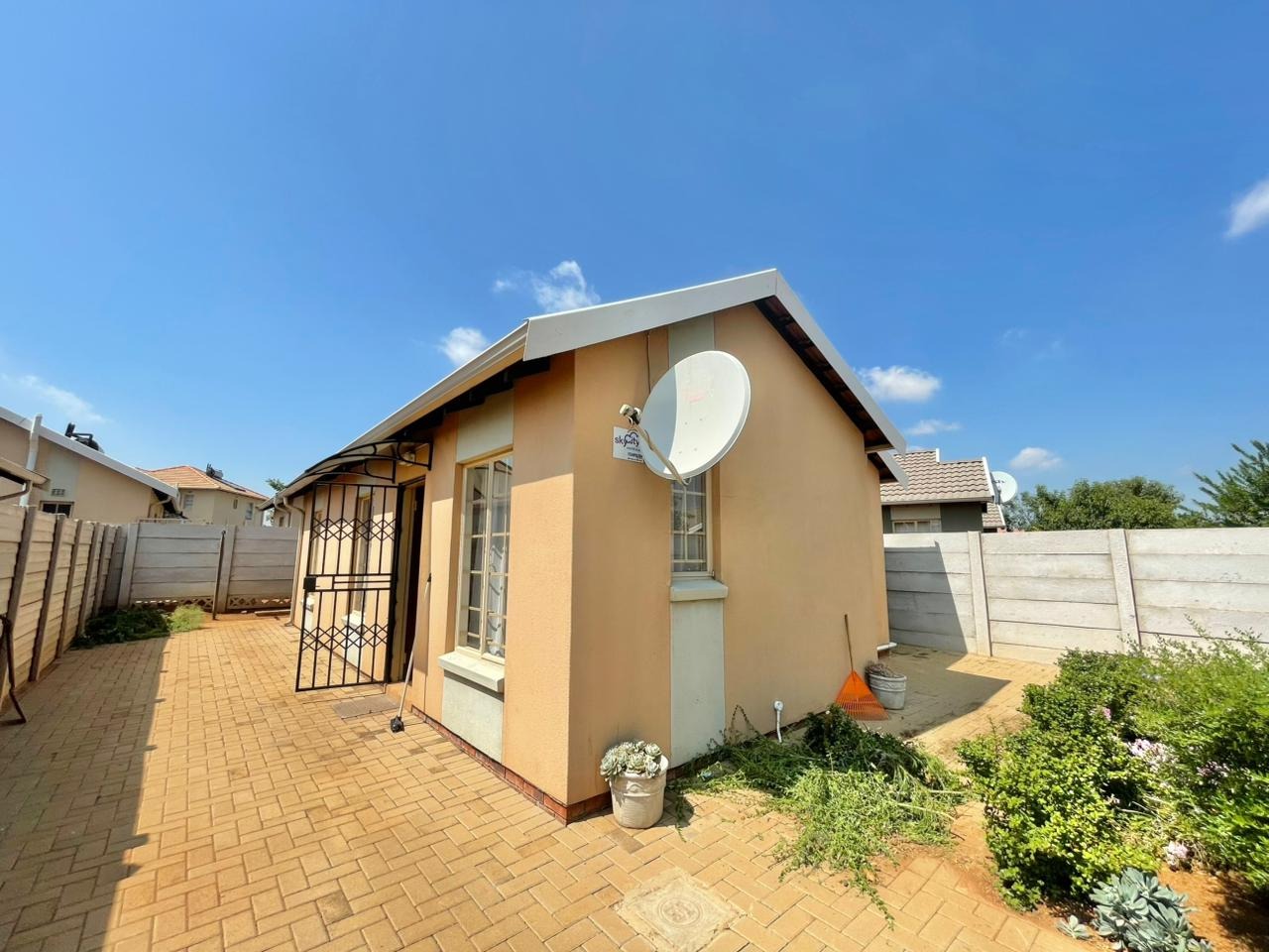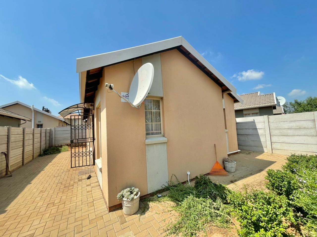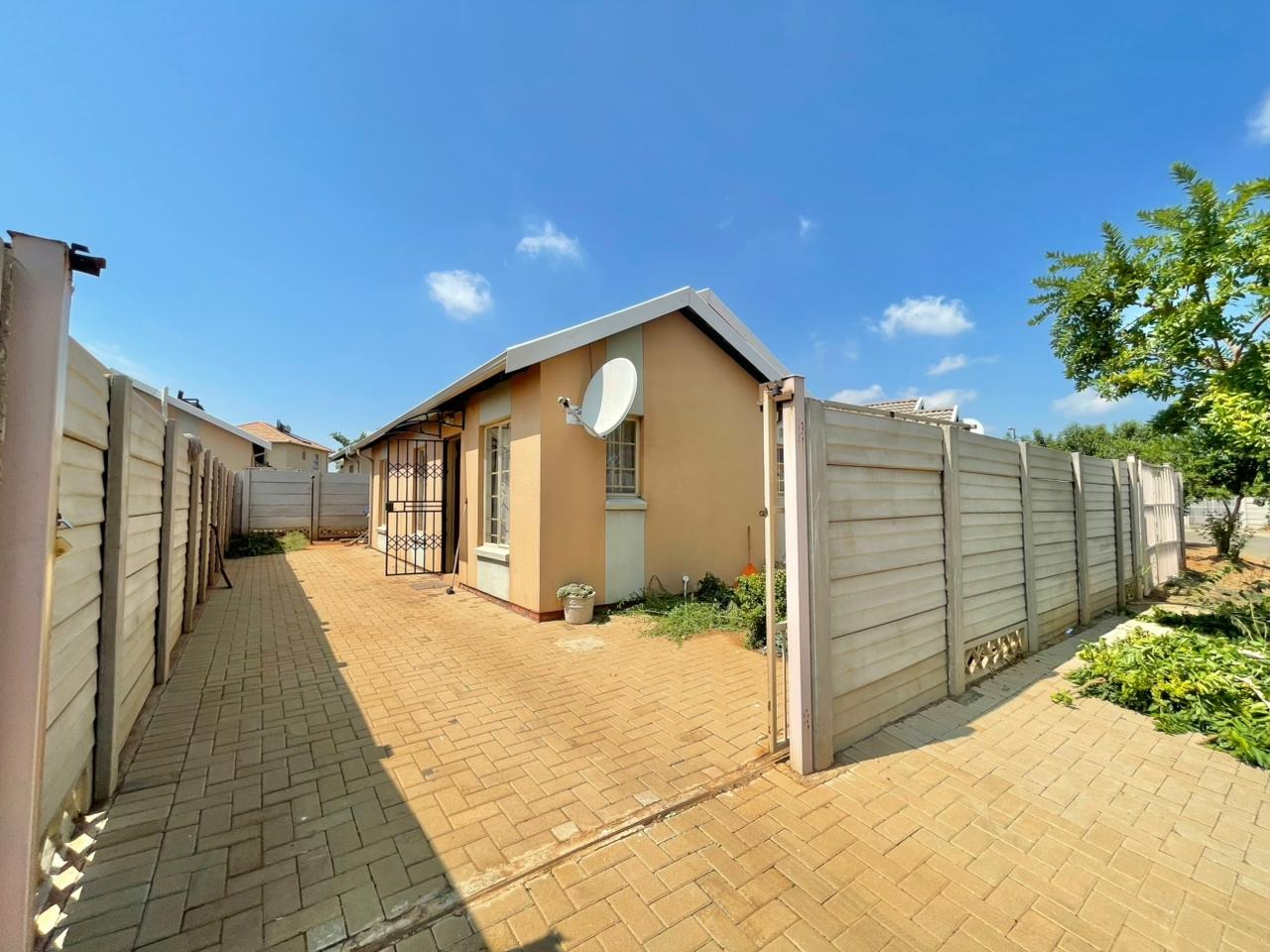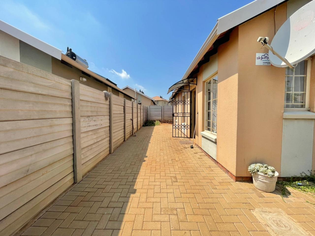 The fully paved exterior extends to a dedicated parking area with space for two vehicles. Security is a key feature, with 24-hour security within the gated community, an access gate, and burglar bars on windows. The property also benefits from a solar water heater, contributing to energy efficiency. The totally walled perimeter ensures a private and safe outdoor space.