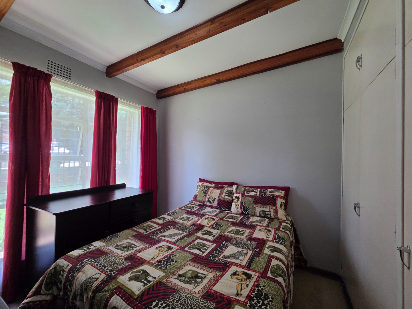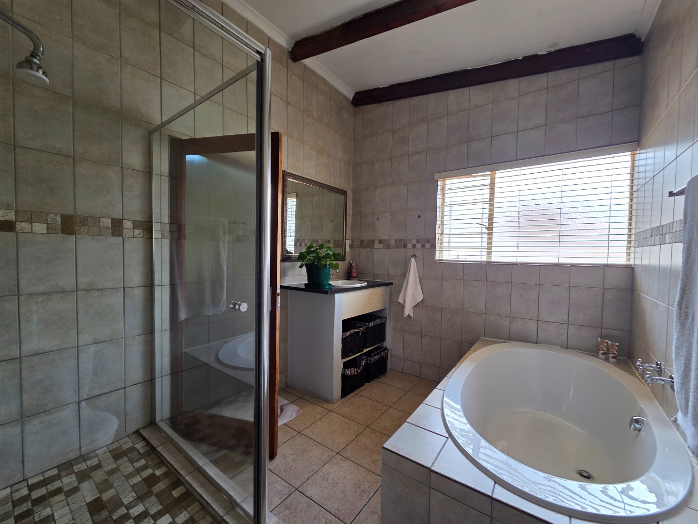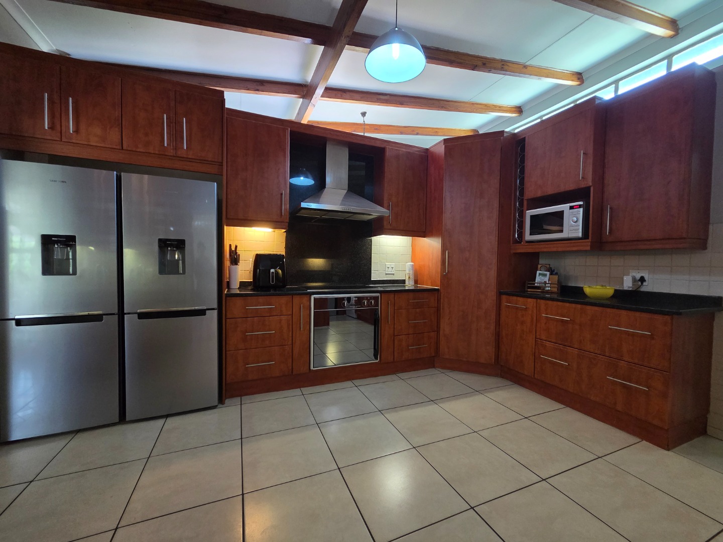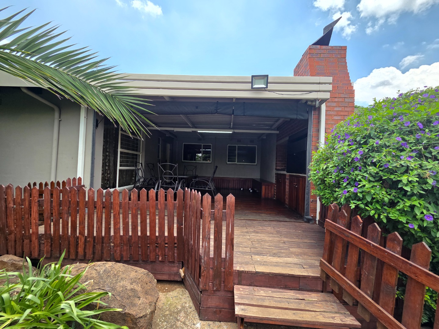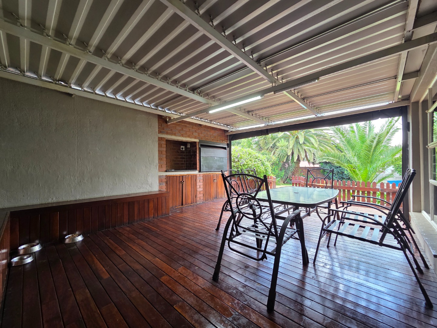 A patio with a built-in braai, complemented by a wooden deck and louvre roof, provides the perfect setting for entertaining guests or enjoying relaxed family time throughout the year.