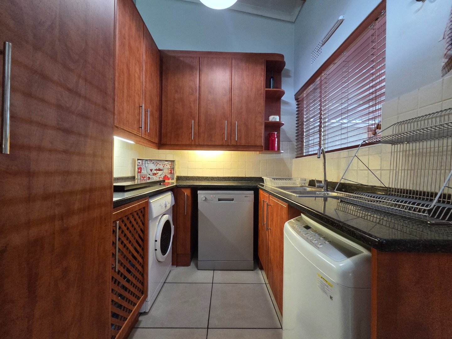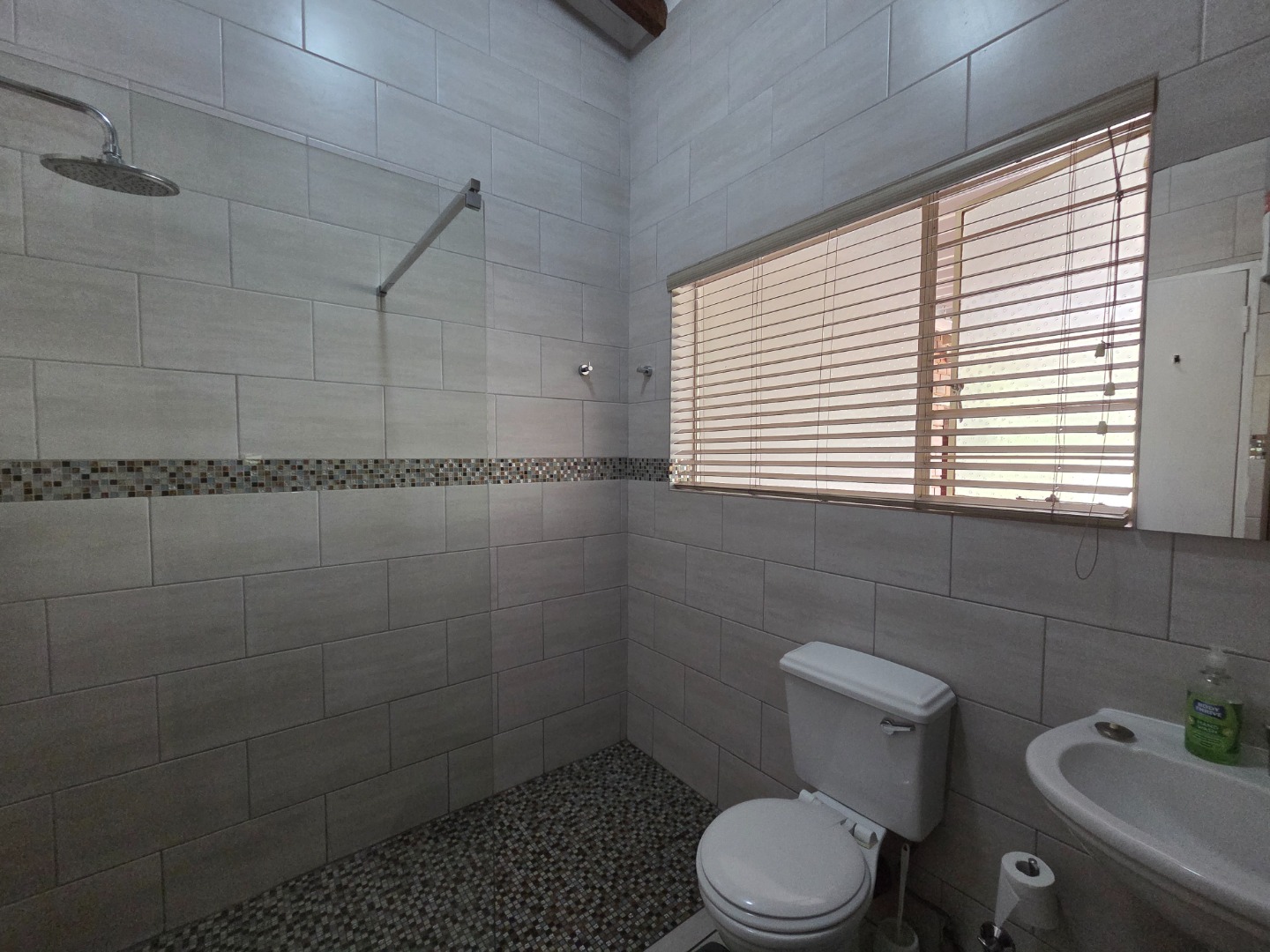 The main house features three well-sized bedrooms, all fitted with built-in cupboards, with the main bedroom offering an en-suite bathroom and a second bathroom. The home includes a stylish and functional kitchen with ample cupboard space, ideal for the home chef, flowing effortlessly into the lounge and dining room to create a welcoming living environment.