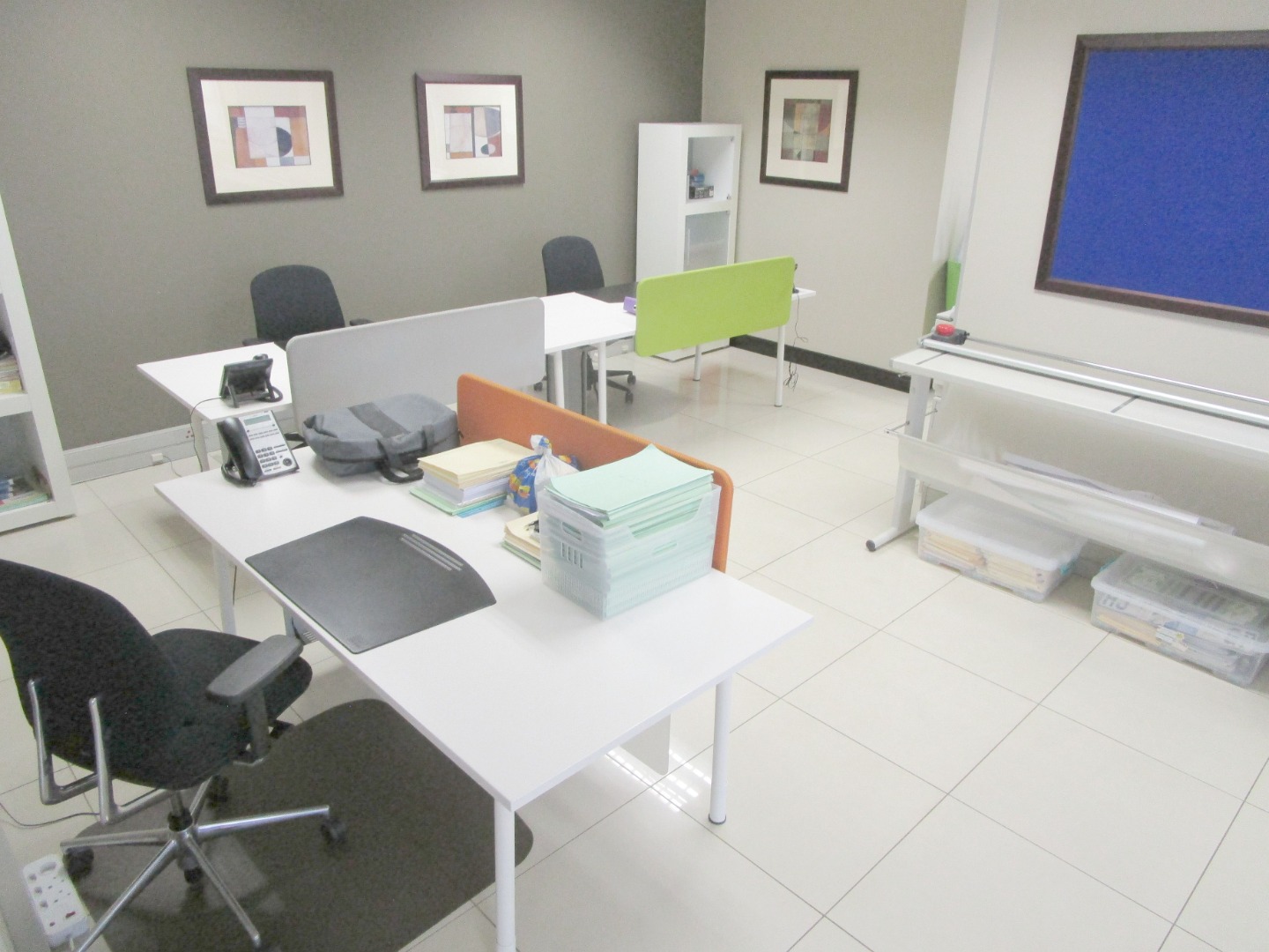 The interior of this sophisticated office space is meticulously designed to foster productivity and collaboration. Featuring a versatile layout, the premises incorporate both open-plan workstations and private, glass-partitioned offices, allowing for adaptable configurations to suit diverse business requirements. Abundant natural light permeates the area through large windows, complemented by modern roller blinds for optimal light control and recessed ceiling lights for consistent illumination. The flooring comprises stylish laminate wood and glossy tiles, contributing to a professional and easily maintainable environment.