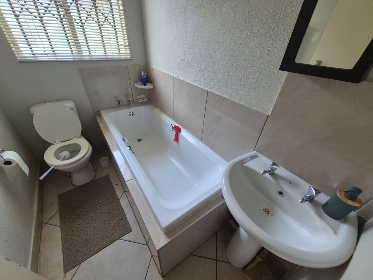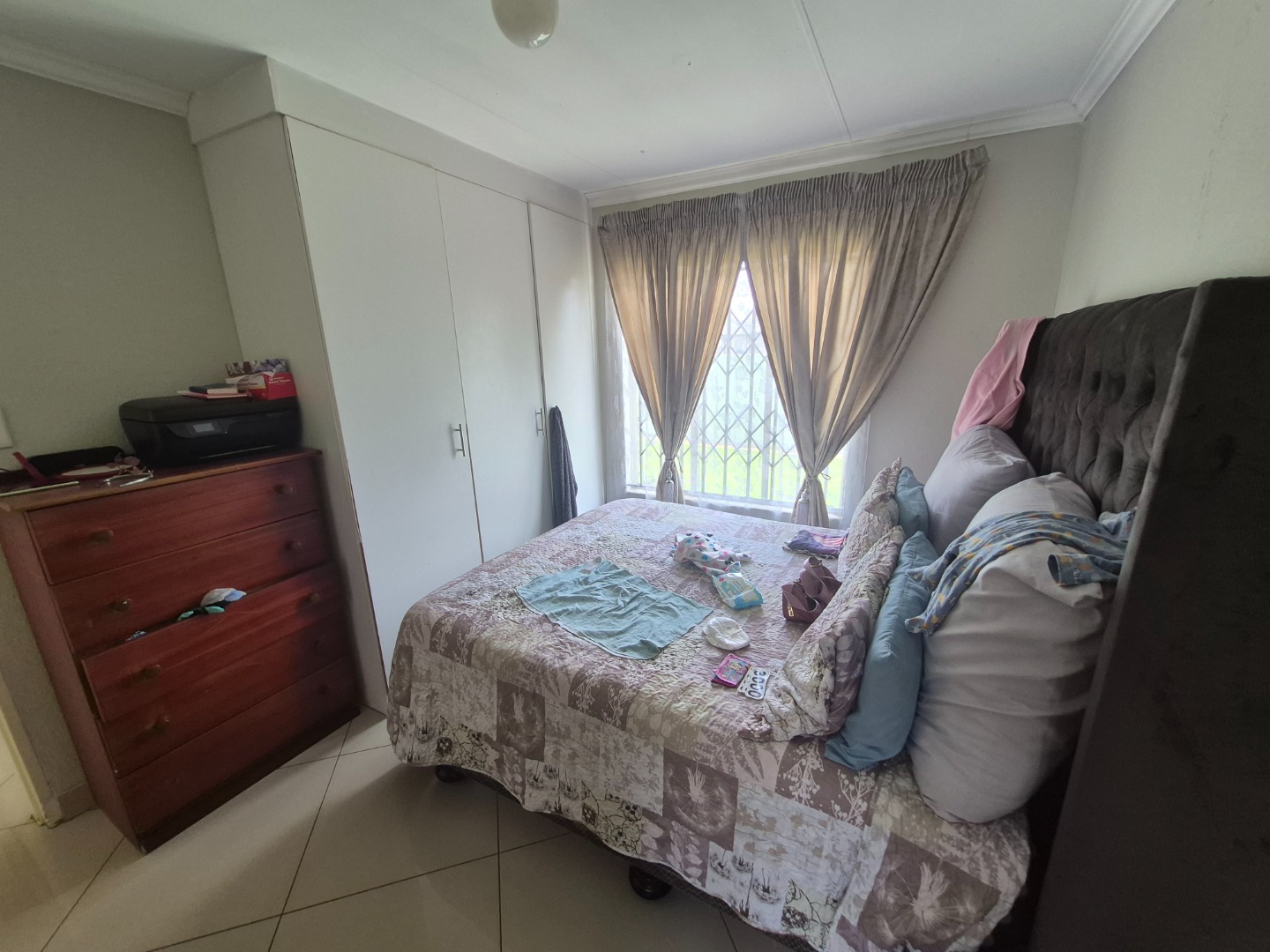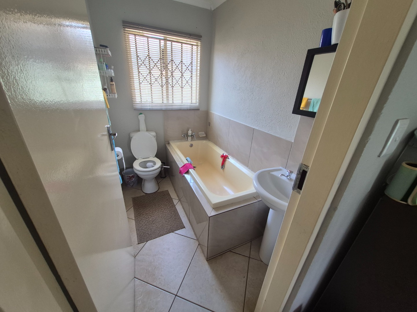 The home comprises three comfortable bedrooms, each with tiled flooring and built-in wardrobes for practical storage. The main bedroom includes a private en-suite bathroom, while a second well-appointed bathroom serves the remaining rooms. All windows are secured with burglar bars, enhancing peace of mind.