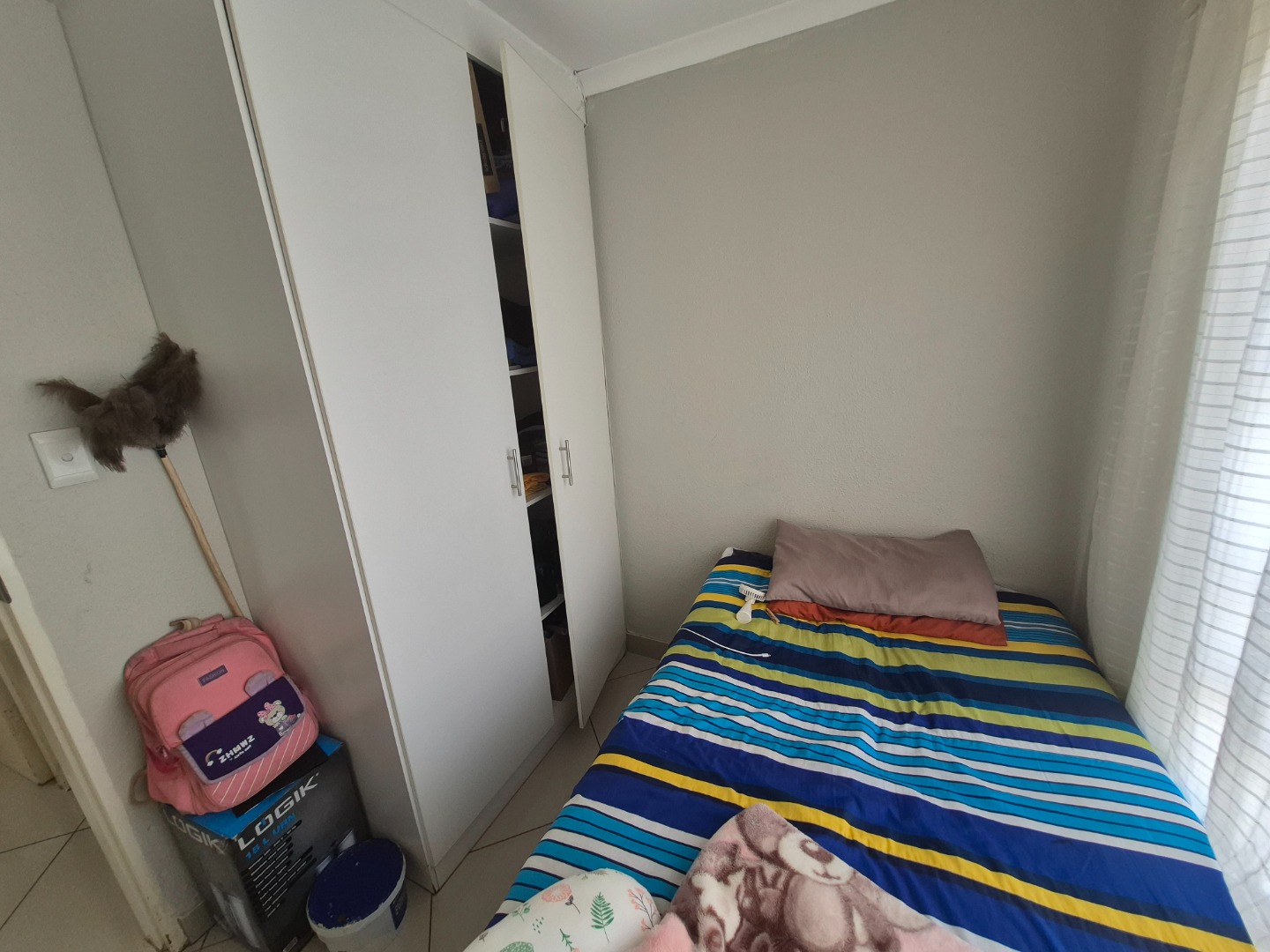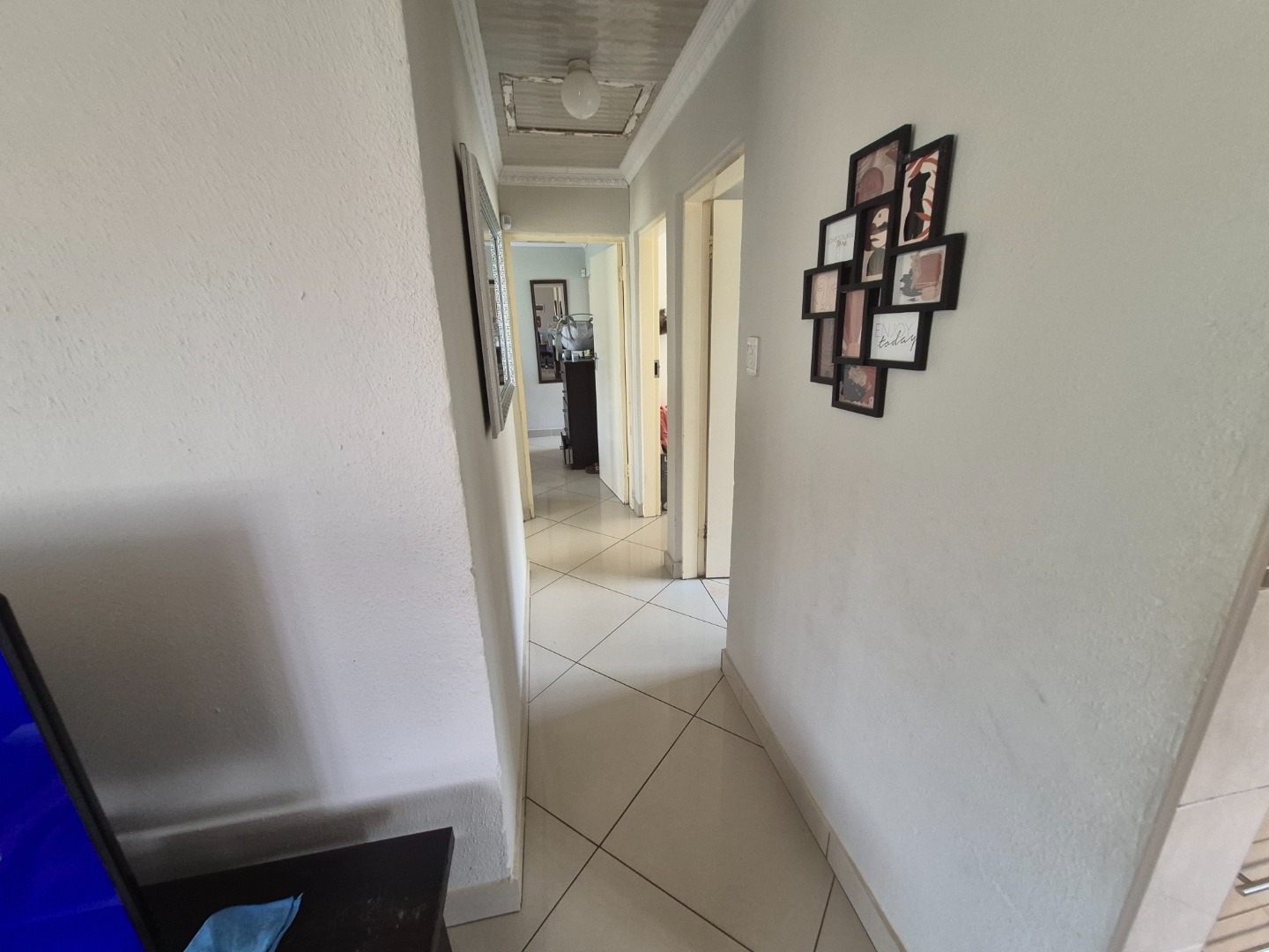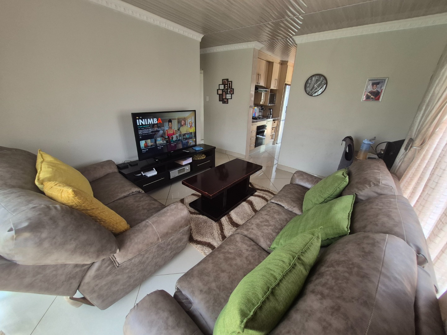The home comprises three comfortable bedrooms, each with tiled flooring and built-in wardrobes for practical storage. The main bedroom includes a private en-suite bathroom, while a second well-appointed bathroom serves the remaining rooms. All windows are secured with burglar bars, enhancing peace of mind.