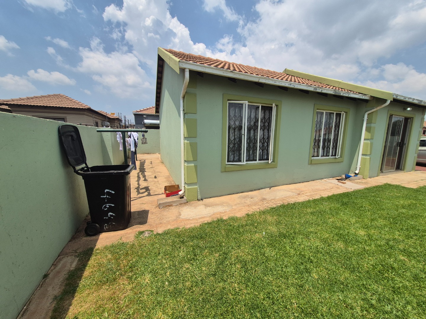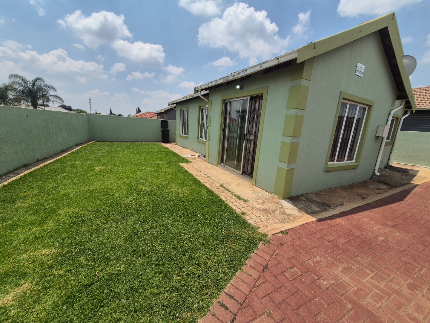 Outside, the property is totally walled and features extensive paving, providing six dedicated parking spaces. Security is paramount, with burglar bars on all windows and sliding doors, an access gate, and its location within a gated community. Fibre connectivity is available.