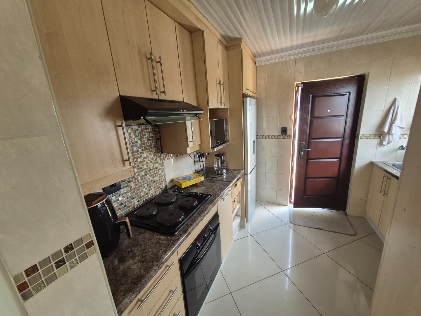 Step inside to an inviting open-plan living area, featuring tiled flooring and ample natural light from large windows fitted with security gates. The modern kitchen is a highlight, boasting light wooden cabinetry, speckled dark countertops, and a mosaic tiled backsplash. It comes equipped with built-in appliances including a stove, oven, extractor fan, microwave, and an integrated washing machine.