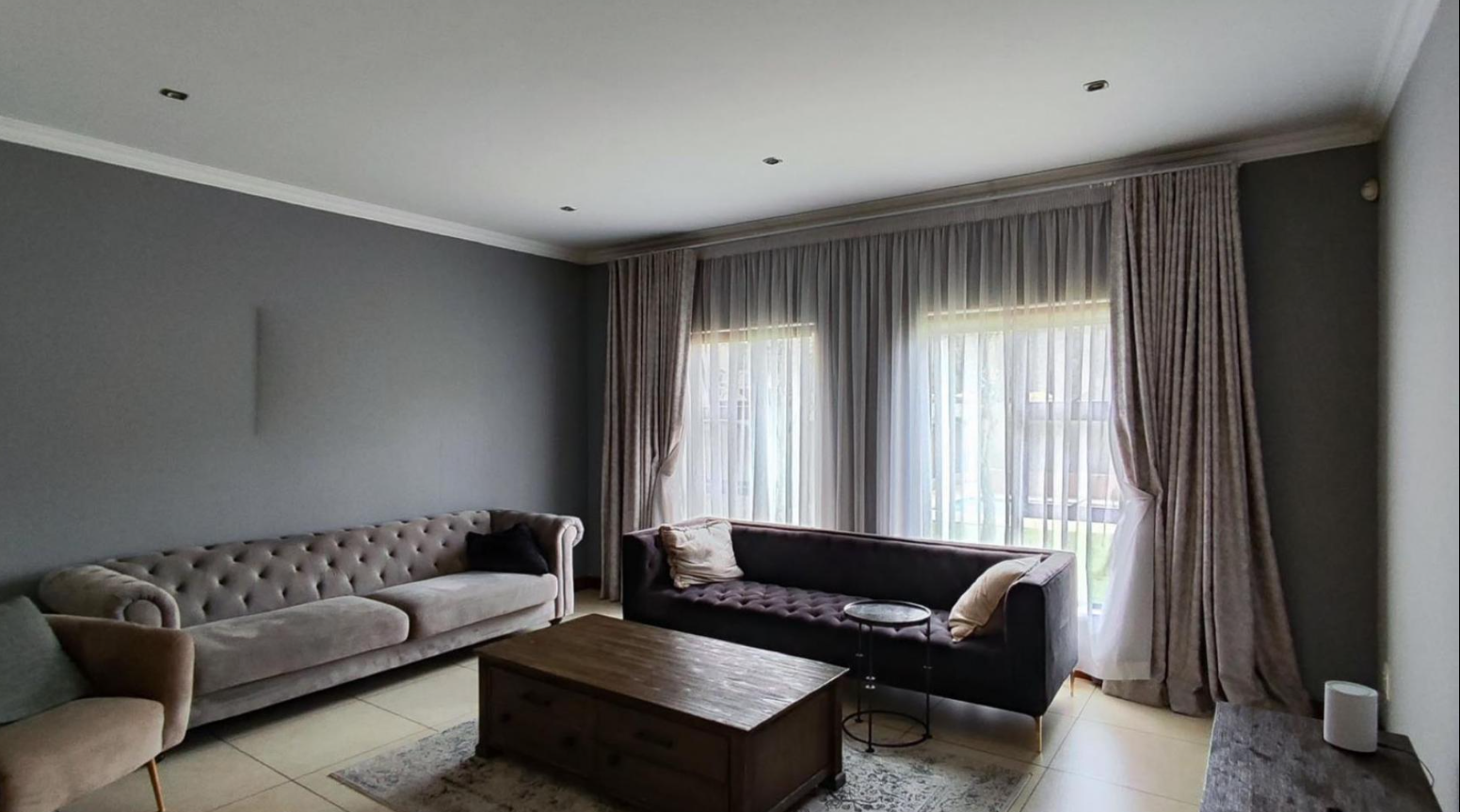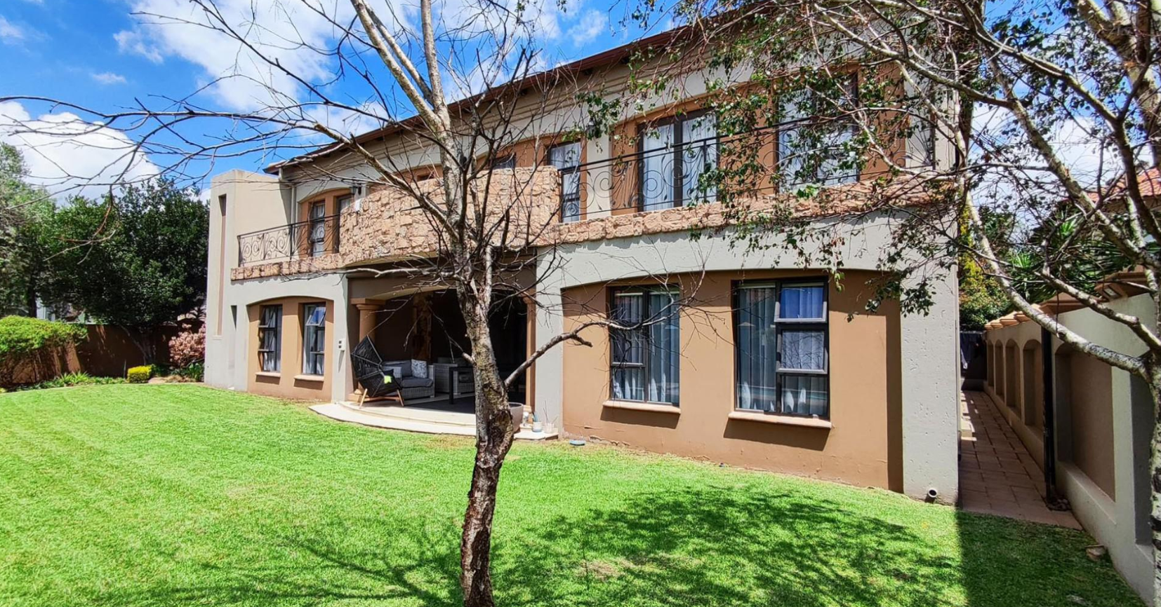 Discover this magnificent family residence nestled within a secure estate in Sunward Park, Boksburg. Boasting a grand, modern architectural design, the home immediately impresses with its elegant stone cladding, prominent pillars, and a decorative entrance gate leading to a spacious paved driveway. The property's well-maintained desert-style landscaping complements its sophisticated facade, offering a striking first impression.