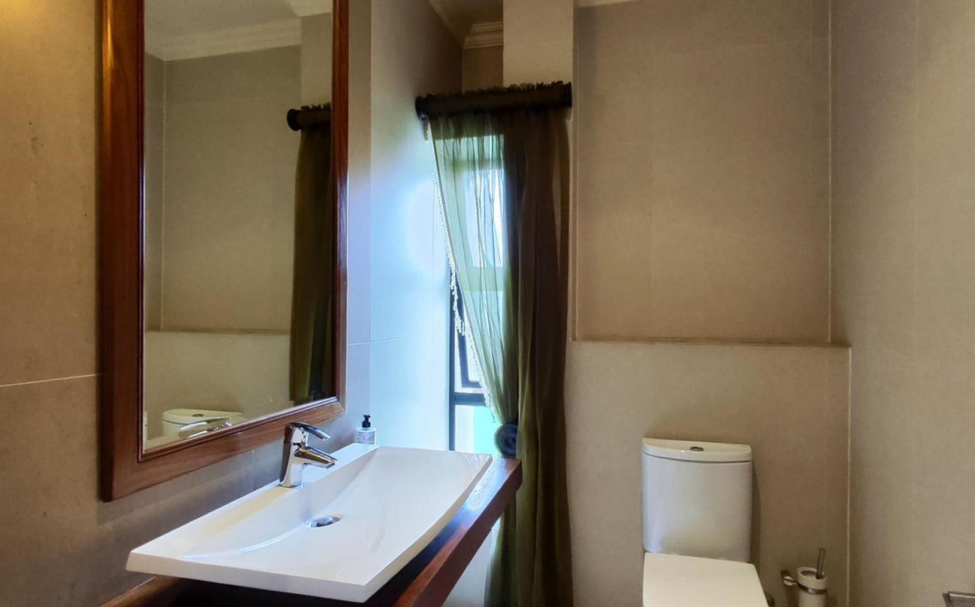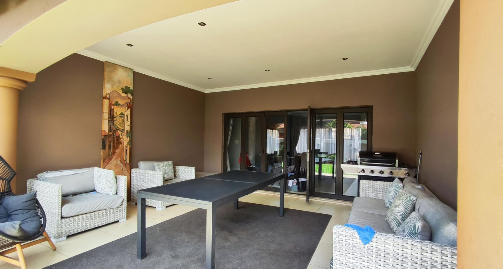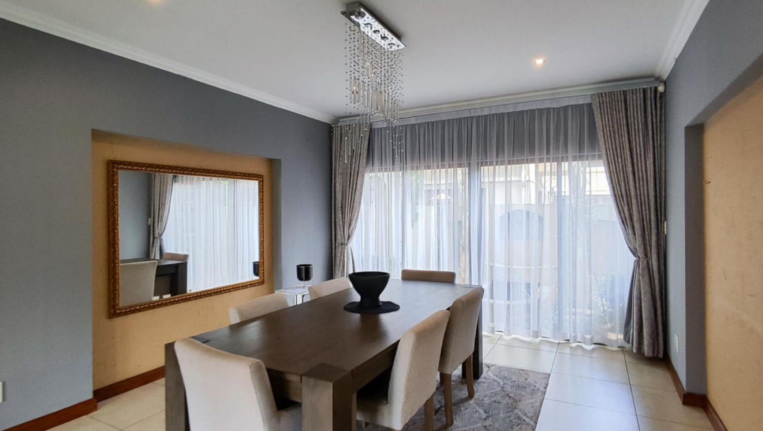 Step inside to an inviting interior featuring an open-plan design that seamlessly connects living and dining areas. The heart of the home is a modern kitchen, equipped with ample dark wood cabinetry, durable granite countertops, and integrated appliances including a gas hob. A stylish breakfast bar with contemporary pendant lighting provides a casual dining spot, while a built-in display cabinet adds both functionality and elegance. The property offers two spacious lounges and a dedicated dining room, all adorned with clean tiled flooring, recessed lighting, and elegant crown molding, creating a comfortable and sophisticated atmosphere. Large windows throughout ensure abundant natural light.