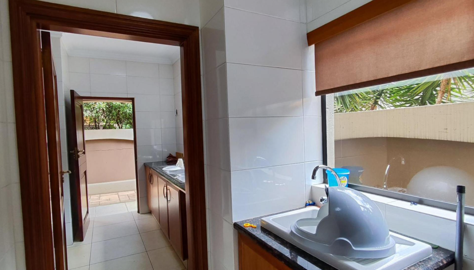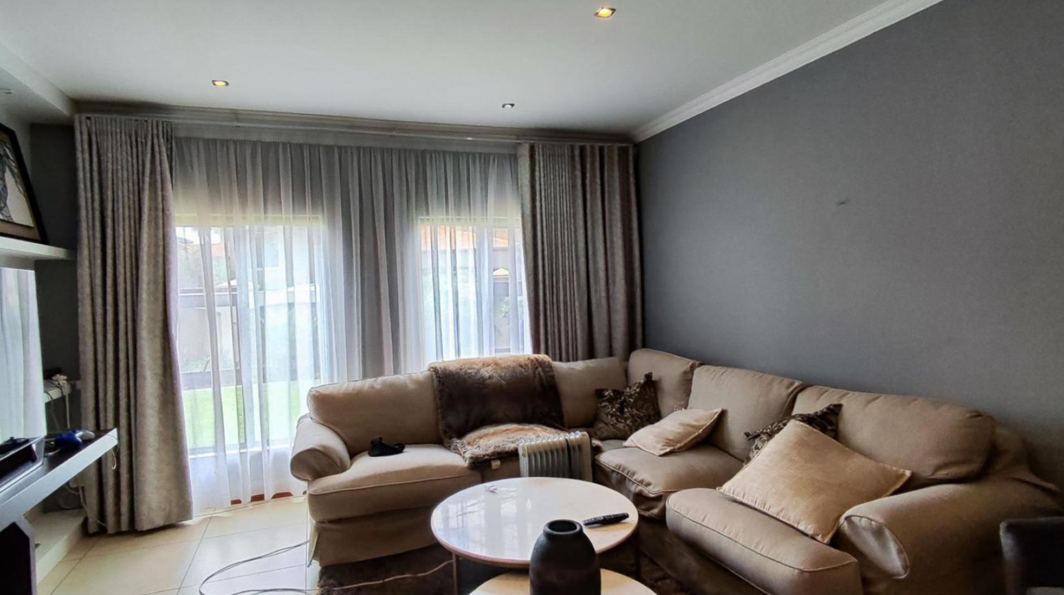 Step inside to an inviting interior featuring an open-plan design that seamlessly connects living and dining areas. The heart of the home is a modern kitchen, equipped with ample dark wood cabinetry, durable granite countertops, and integrated appliances including a gas hob. A stylish breakfast bar with contemporary pendant lighting provides a casual dining spot, while a built-in display cabinet adds both functionality and elegance. The property offers two spacious lounges and a dedicated dining room, all adorned with clean tiled flooring, recessed lighting, and elegant crown molding, creating a comfortable and sophisticated atmosphere. Large windows throughout ensure abundant natural light.