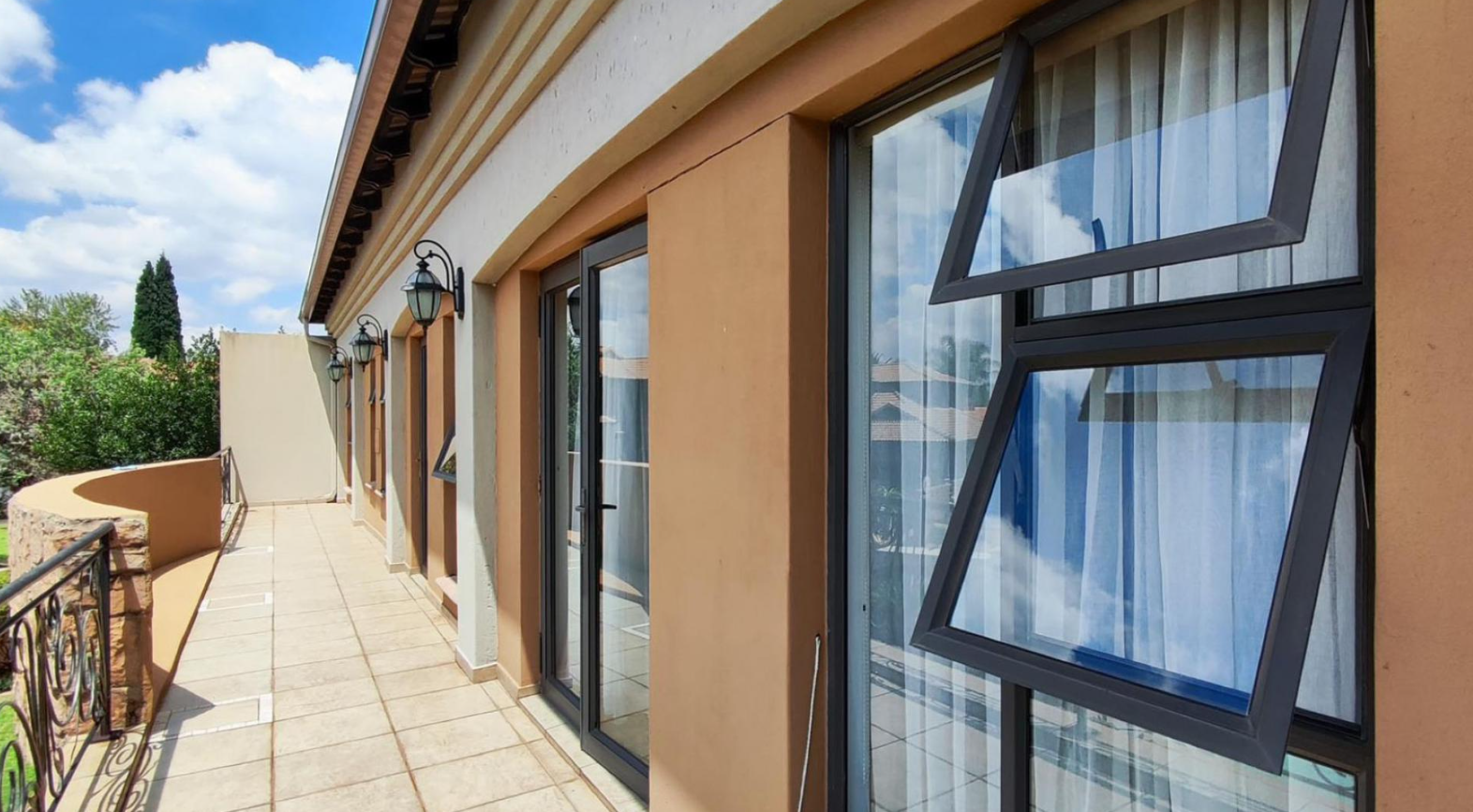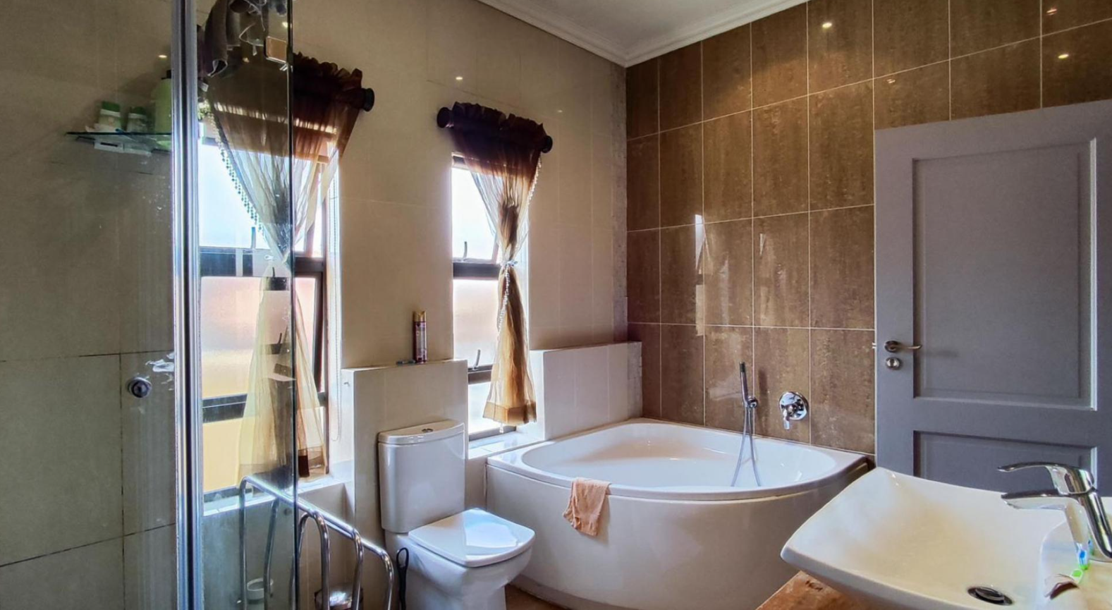 Discover this magnificent family residence nestled within a secure estate in Sunward Park, Boksburg. Boasting a grand, modern architectural design, the home immediately impresses with its elegant stone cladding, prominent pillars, and a decorative entrance gate leading to a spacious paved driveway. The property's well-maintained desert-style landscaping complements its sophisticated facade, offering a striking first impression.