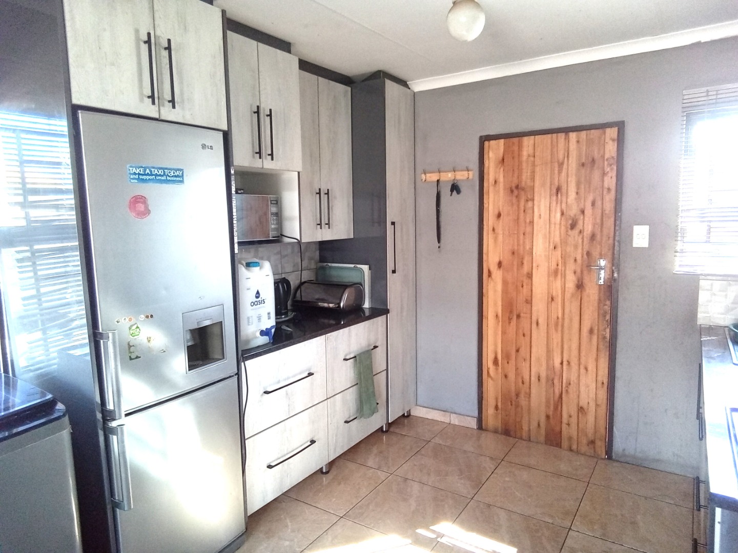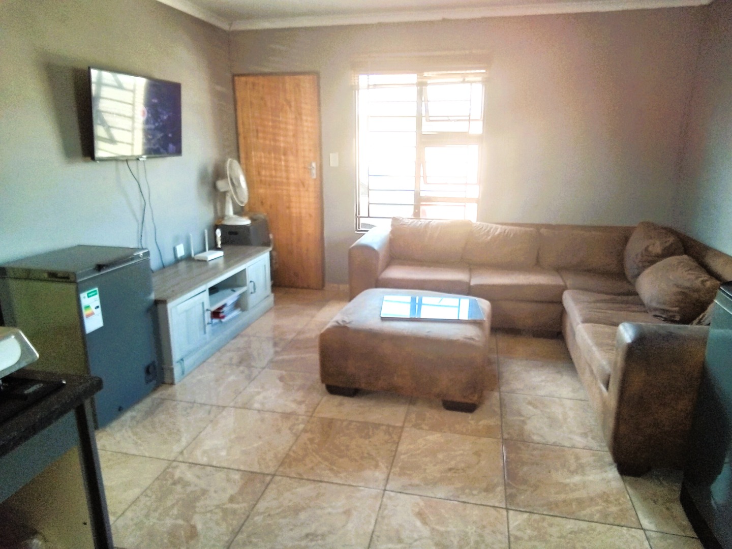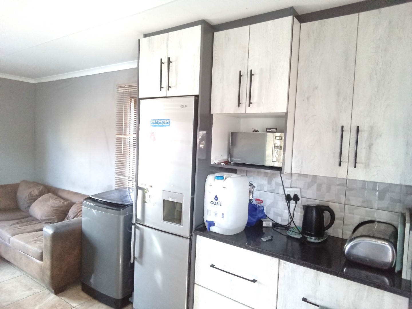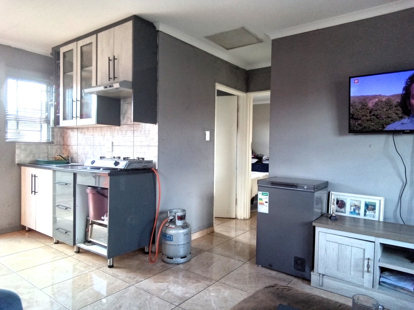 This compact, single-story house in Windmill Park, Boksburg, presents a neat kerb appeal with its light brown exterior and tiled roof. Situated on a 286 sqm erf, the property features a multi-colored brick paved driveway, offering ample parking, alongside a small, well-maintained lawn. Security is enhanced by a concrete boundary wall and additional fencing. An energy-efficient solar water heater is also installed. Step inside to discover a thoughtfully designed open-plan living and kitchen area. The modern kitchen boasts contemporary light-colored cabinetry with dark handles, sleek dark countertops, and a stylish grey tiled backsplash, providing ample storage. It is equipped with a large refrigerator, a built-in hob, and a range hood. The comfortable living space features tiled flooring and a wall-mounted TV. The home comprises two comfortable bedrooms, offering private retreats. A well-appointed bathroom serves the household, designed for functionality. The practical outdoor space includes extensive paved areas accommodating up to five vehicles, complemented by a small, private lawn. The property is fully enclosed by secure perimeter walls and fencing, ensuring a safe environment. The solar water heater contributes to sustainable living. Located in the metropolitan and suburban area of Windmill Park, this property offers convenient access to local amenities and transport routes, ideal for those seeking a comfortable and secure home. Key Features: * Two comfortable bedrooms * One functional bathroom * Modern open-plan kitchen * Spacious lounge area * Ample parking for 5 vehicles * Secure perimeter fencing * Energy-efficient solar water heater * Paved driveway and small lawn * Located in Windmill Park, Boksburg