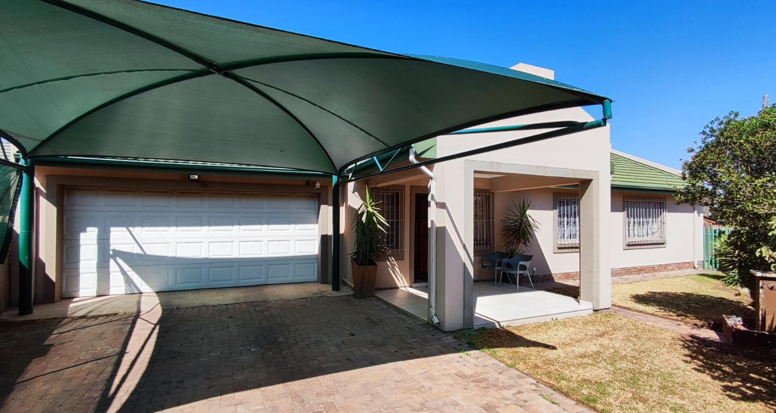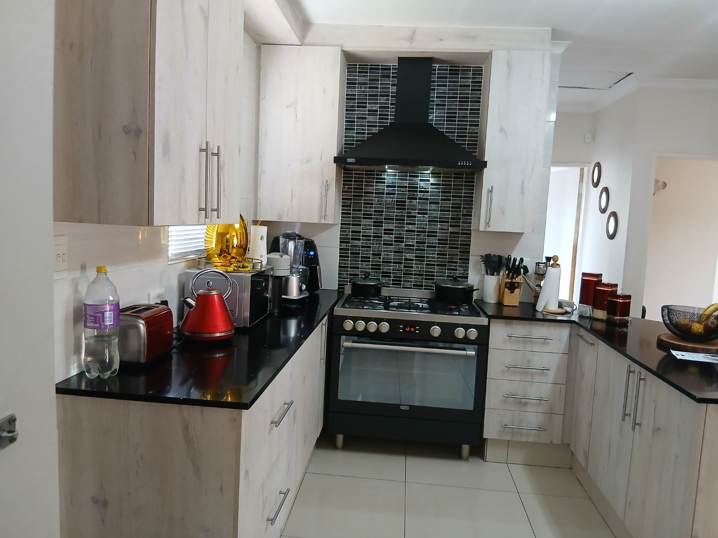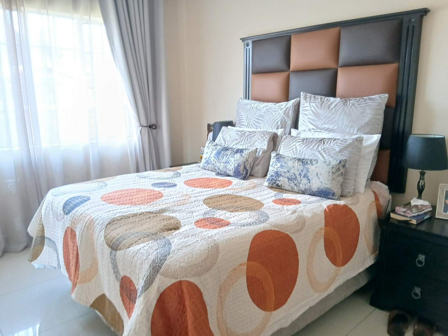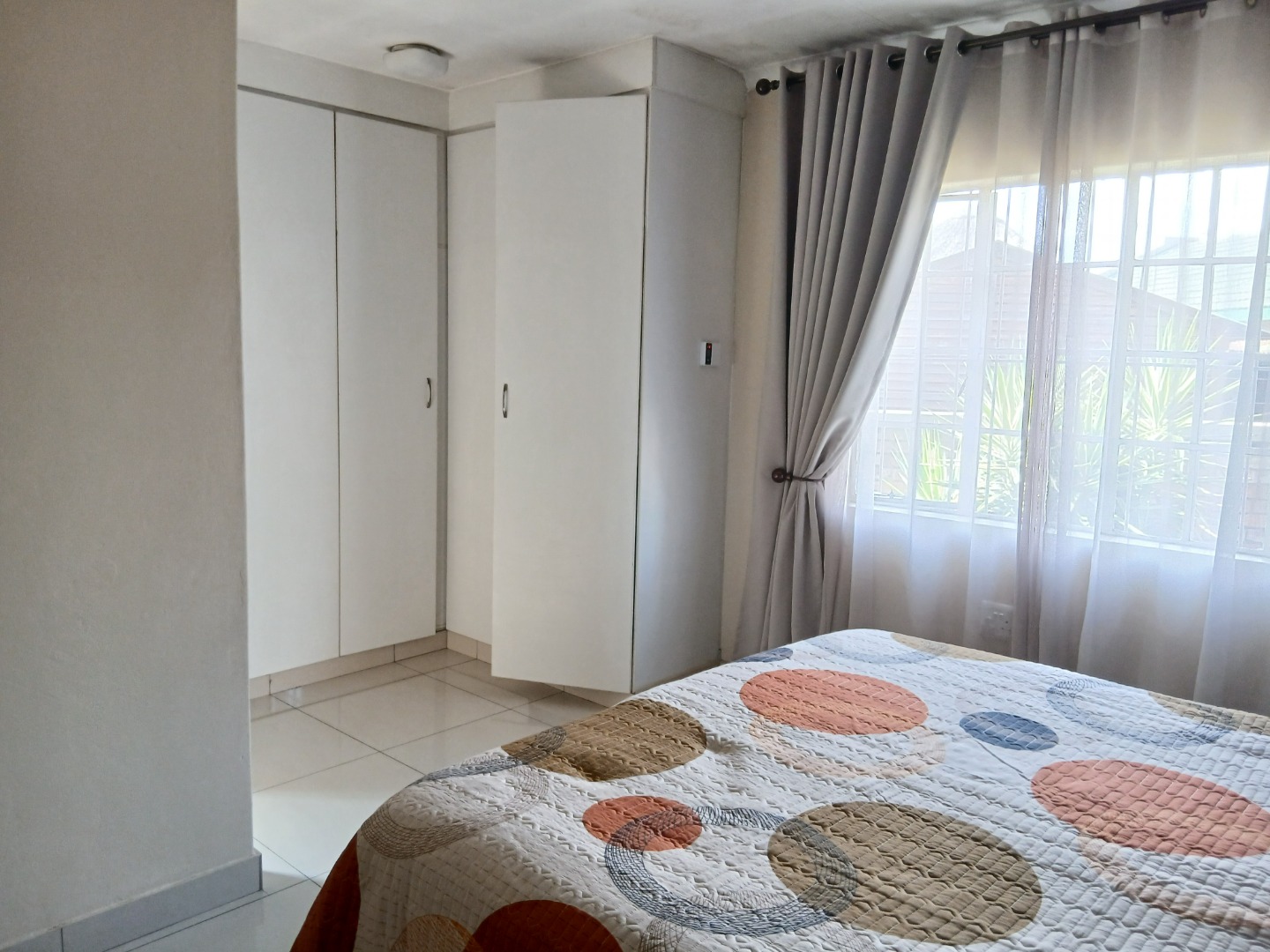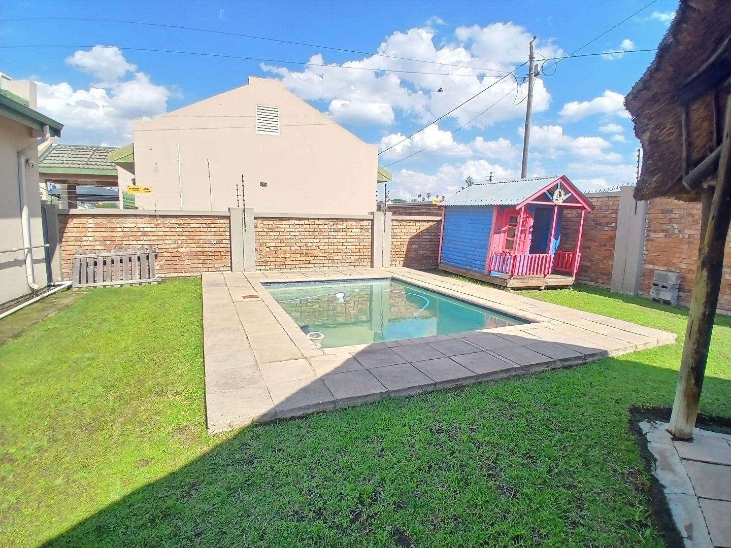 Accommodation comprises three well-proportioned bedrooms and two bathrooms, including a private en-suite, providing comfort and privacy. Externally, the property offers a covered patio overlooking a swimming pool and a well-maintained garden, complemented by a lapa, paving, and a wendy house. Practical amenities include a double garage with additional parking. Security is paramount, with an alarm system, burglar bars, security gates, and 24-hour security within the gated community, ensuring peace of mind for residents and their pets.