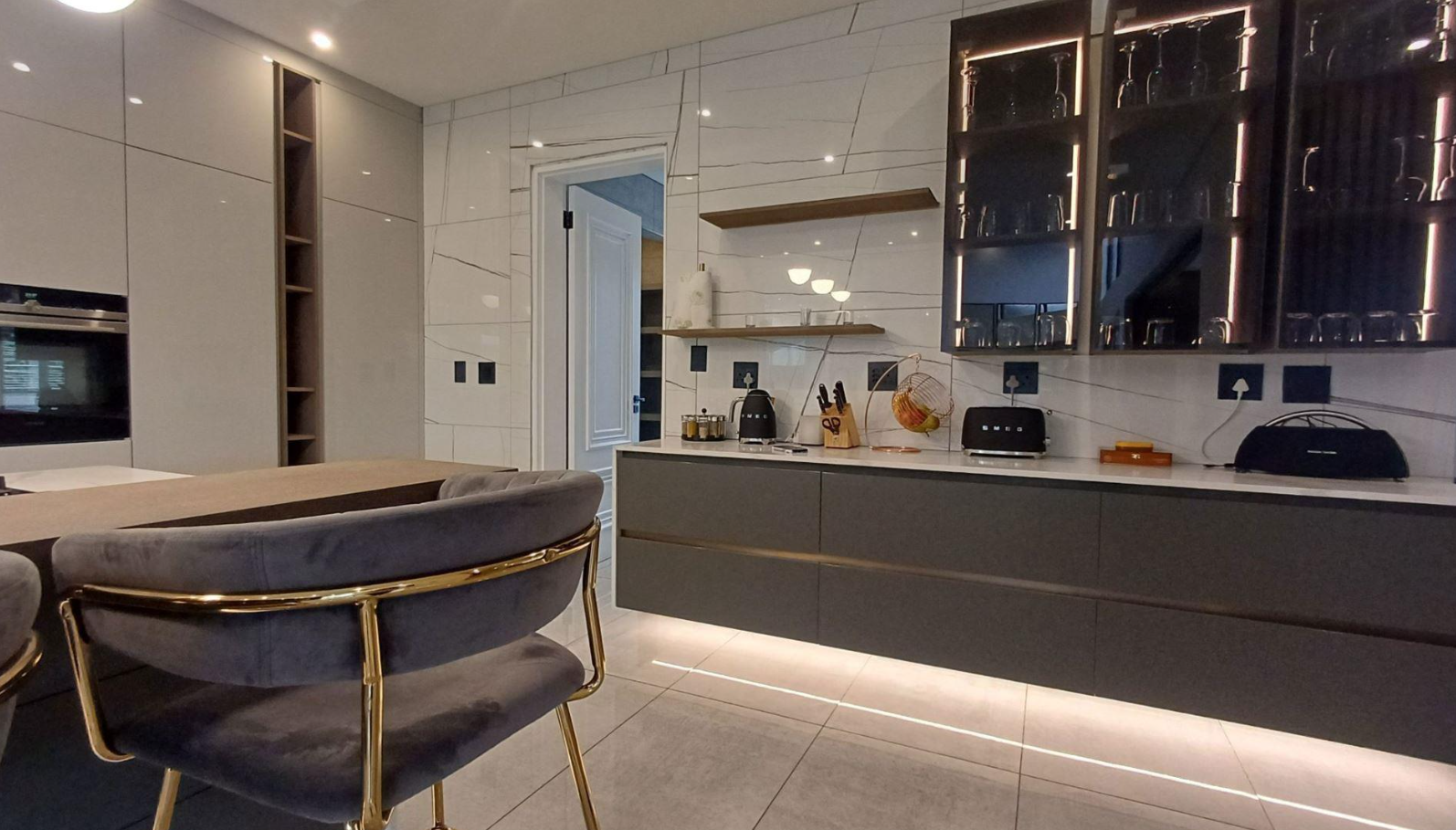 Step inside to discover a grand open-concept interior, where double-volume spaces and soaring high ceilings create an immediate sense of expansive elegance. Abundant natural light floods the living, dining, and state-of-the-art kitchen areas, enhanced by sophisticated recessed lighting and large tiled floors that reflect a refined aesthetic. The seamless flow extends to the outdoors through expansive sliding glass doors, blurring the lines between indoor comfort and al fresco indulgence. The gourmet kitchen is a culinary dream, featuring a substantial island, integrated high-end appliances, sleek grey and white cabinetry, and luxurious marble-look countertops. A distinctive glass-enclosed wine cellar stands as a testament to sophisticated entertaining, complemented by a practical pantry.
