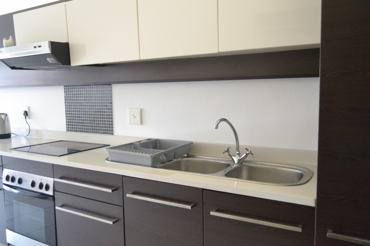Step inside and you're greeted by a bright, open-plan living space with cool, light-colored tiled floors that flow seamlessly. The modern kitchen is a real highlight, boasting sleek dark wood-grain cabinetry, white countertops, and integrated appliances like a hob, oven, and extractor fan – perfect for whipping up your favourite meals. The living area also features large windows and a sliding door that opens up to your own private balcony, letting in loads of natural light and fresh air.