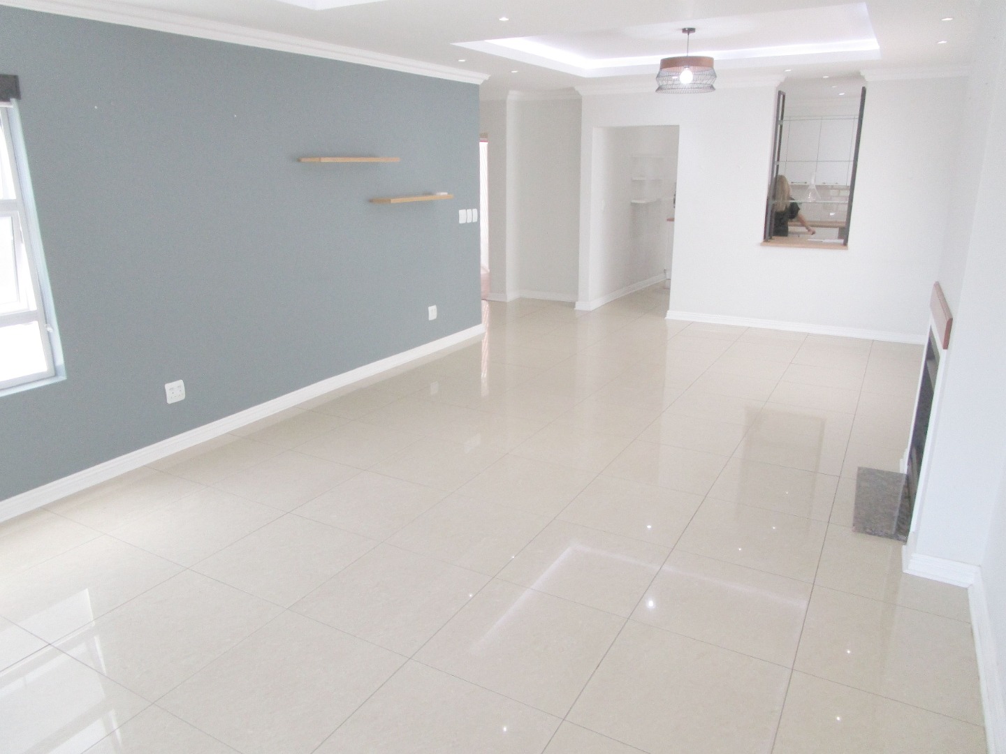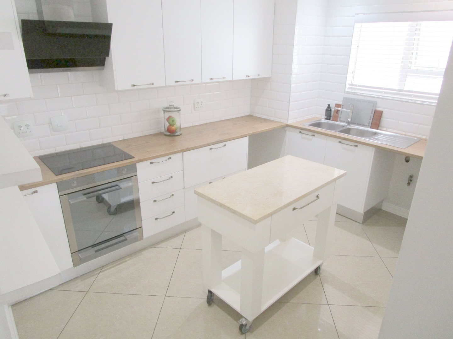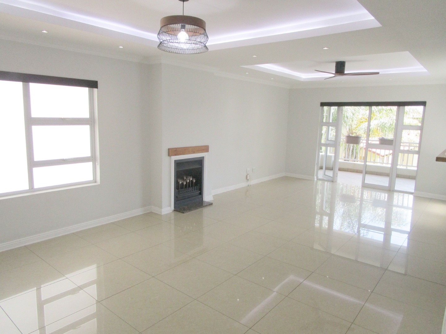 The heart of this home is its spacious, open-plan living area, perfect for chilling out or entertaining friends. It boasts sleek tiled floors, stylish tray ceilings with cool recessed lighting, and even a decorative fireplace for that extra touch of ambiance. Large glass doors open up to a private balcony via the living room and a second balcony to the main bedroom letting in loads of natural light and offering a nice spot to relax. The modern kitchen is a dream, featuring crisp white cabinetry, warm wood-look countertops, for possible integrated appliances. Plus, there's a handy movable kitchen island on wheels and a pantry for all your cooking needs.