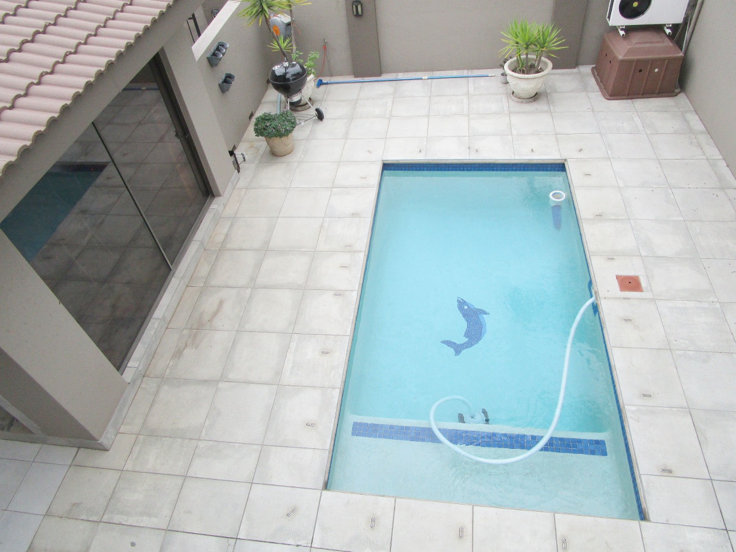 The striking modern architecture, with its clean lines and contemporary grey façade, immediately captivates. Inside, an open-plan design flows effortlessly across light wood-look flooring, highlighted by a sleek stainless steel staircase and a unique built-in marine aquarium in the grand entrance hall. A sophisticated lounge seamlessly connects to a gourmet kitchen, boasting light wood-grain cabinetry, integrated double ovens, a gas hob, and air conditioning. Expansive sliding glass doors invite the outdoors in, where a private swimming pool, chic paved patio, outdoor lounge, built-in braai, and charming two balconies await.