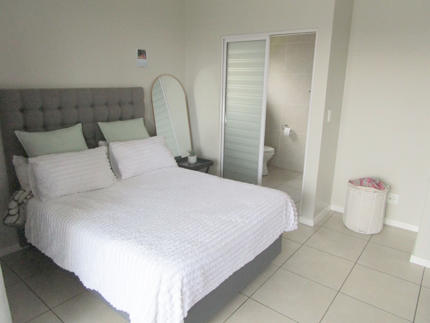 The spacious bedroom is a cozy retreat, featuring a modern grey upholstered bed and practical built-in dark grey wardrobes for all your storage needs. It also enjoys direct access to the balcony, letting in plenty of natural light and fresh air. The en-suite bathroom is just as modern, with light-colored tiles, a wall-mounted vanity, and a refreshing shower, ensuring a clean and stylish start to your day.