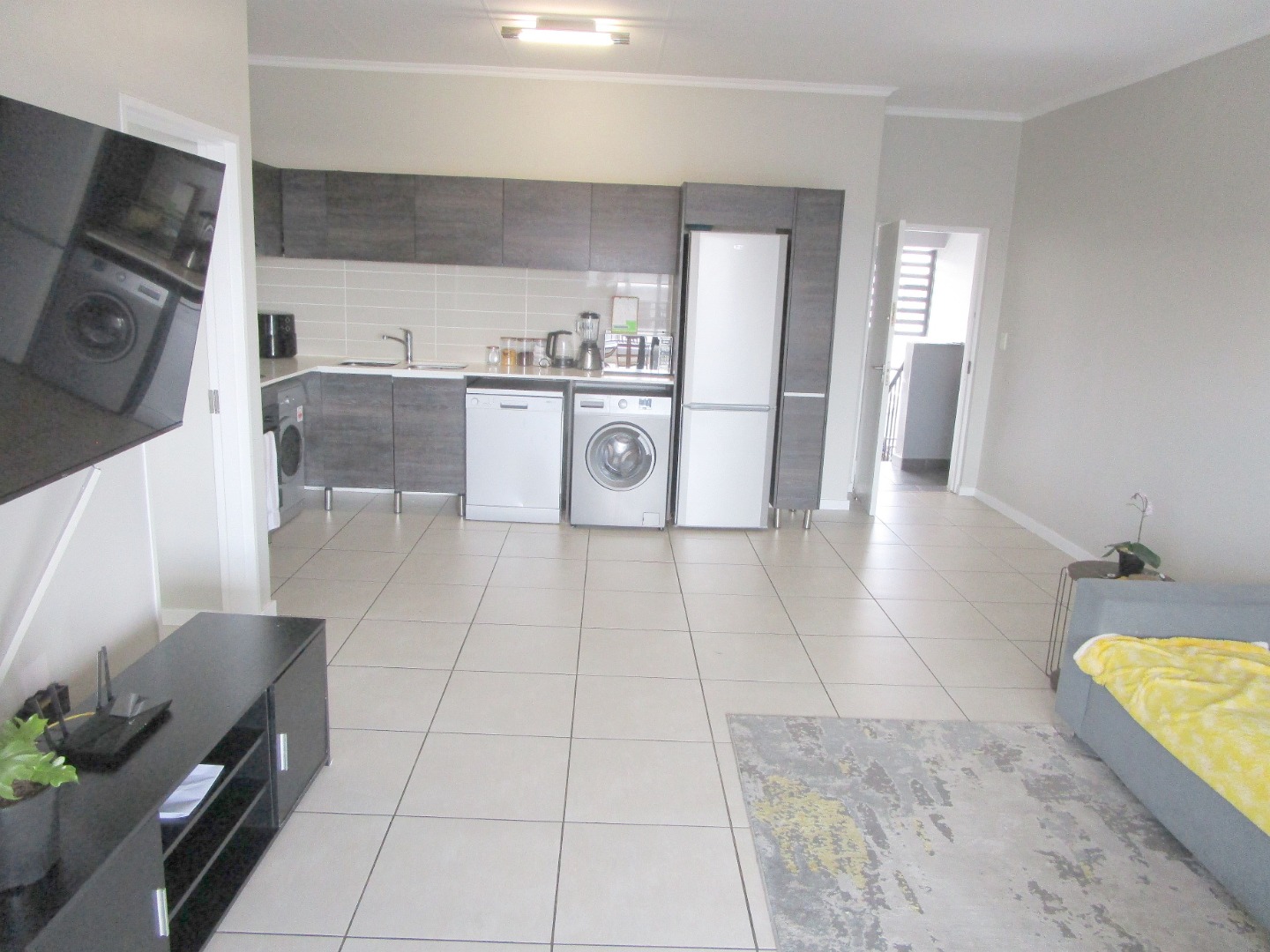 The kitchen is a real highlight, boasting modern grey cabinetry and light countertops. It’s well-equipped with essential appliances like a gas hob, under-counter oven, fridge, dishwasher, tumble-dryer and even a washing machine, making daily chores a breeze. The seamless flow from the kitchen to the lounge means you’re always part of the action, whether you’re cooking up a storm or just relaxing.