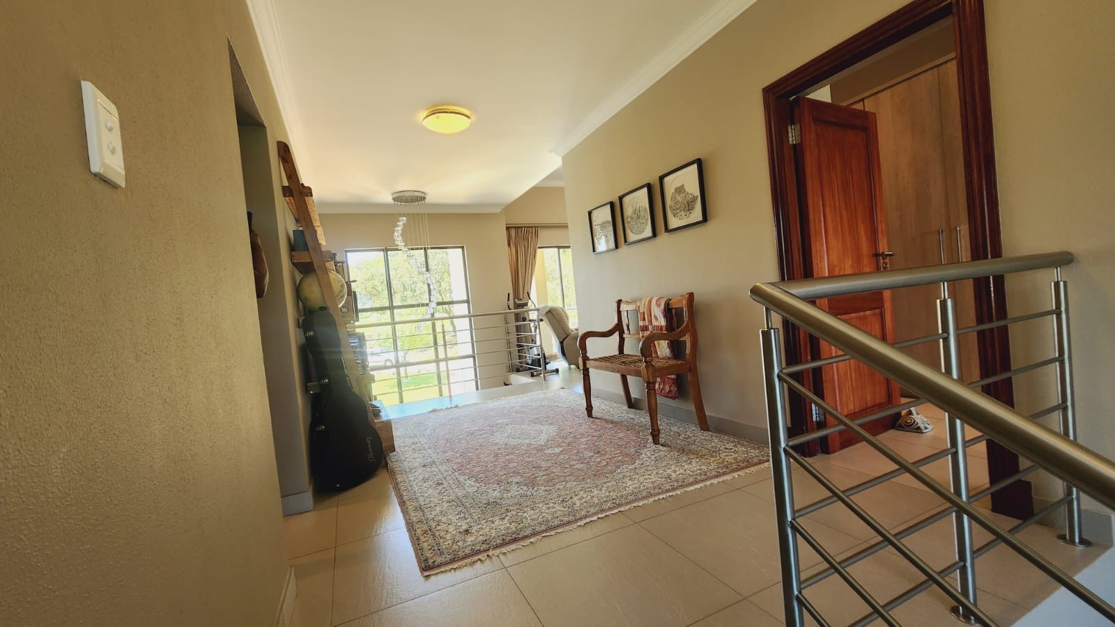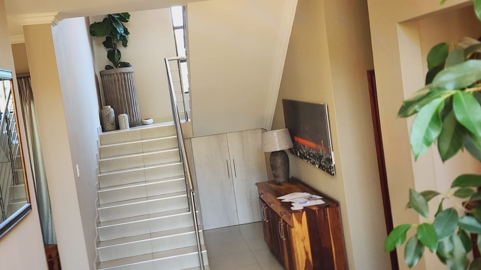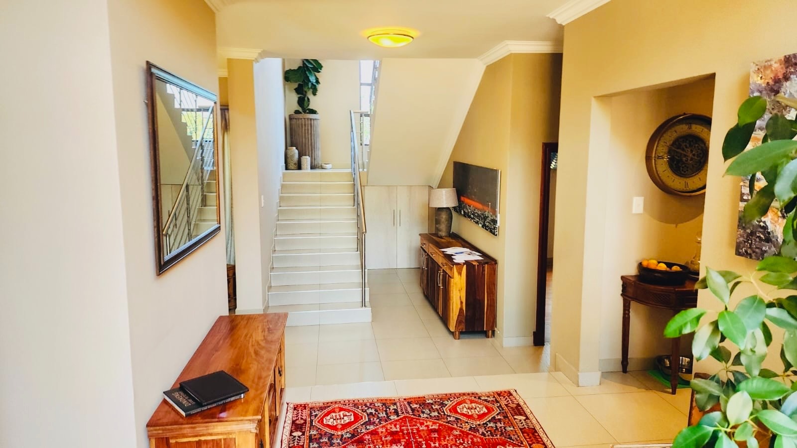 Step inside to a spacious and brightly lit entryway, featuring pristine tiled flooring that extends throughout the main living areas. A modern staircase with sleek metal railings serves as a striking architectural focal point, while integrated under-stair storage offers practical space solutions. The home provides a dedicated lounge and a separate dining room, ensuring ample space for both relaxation and entertaining.