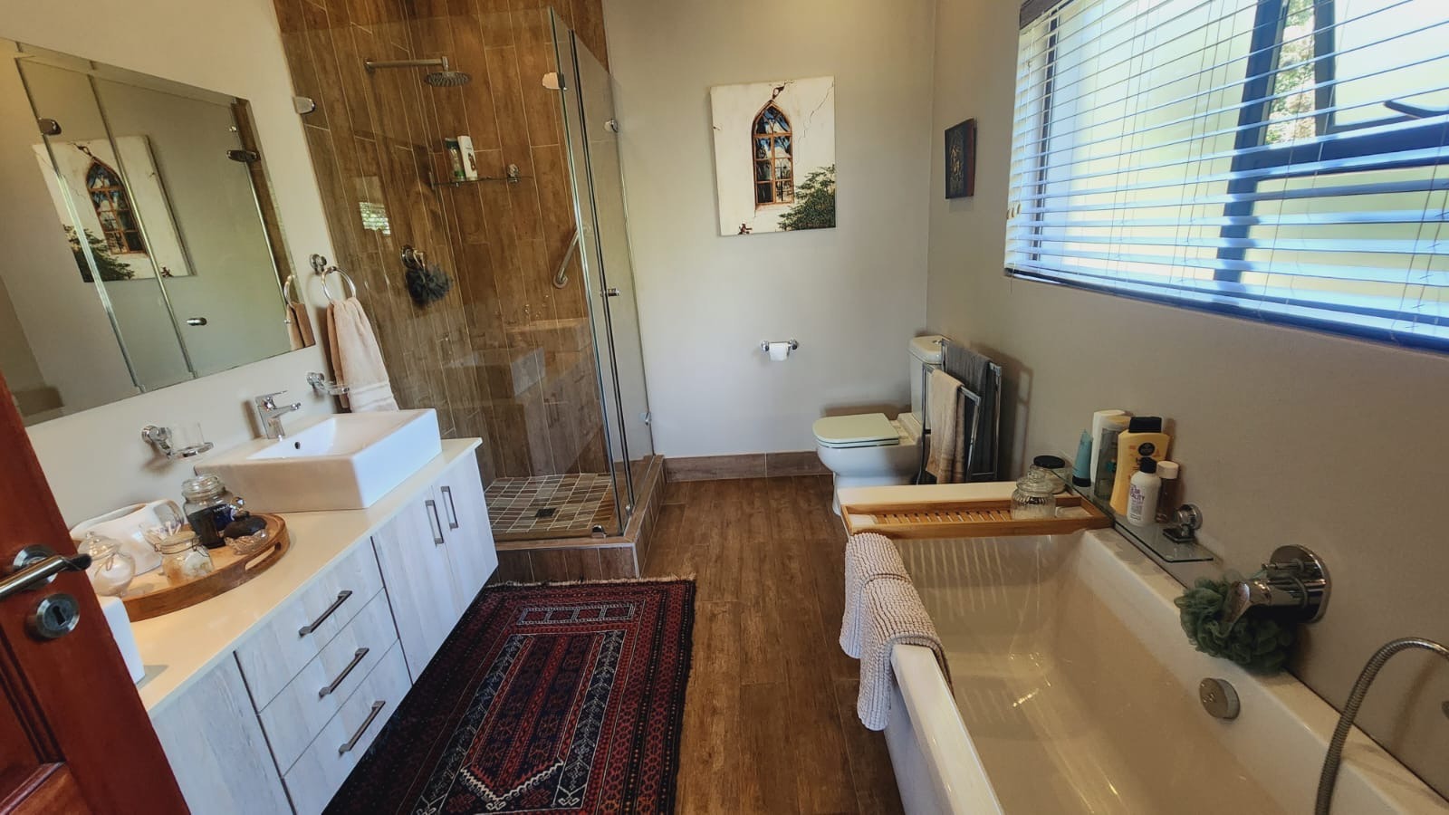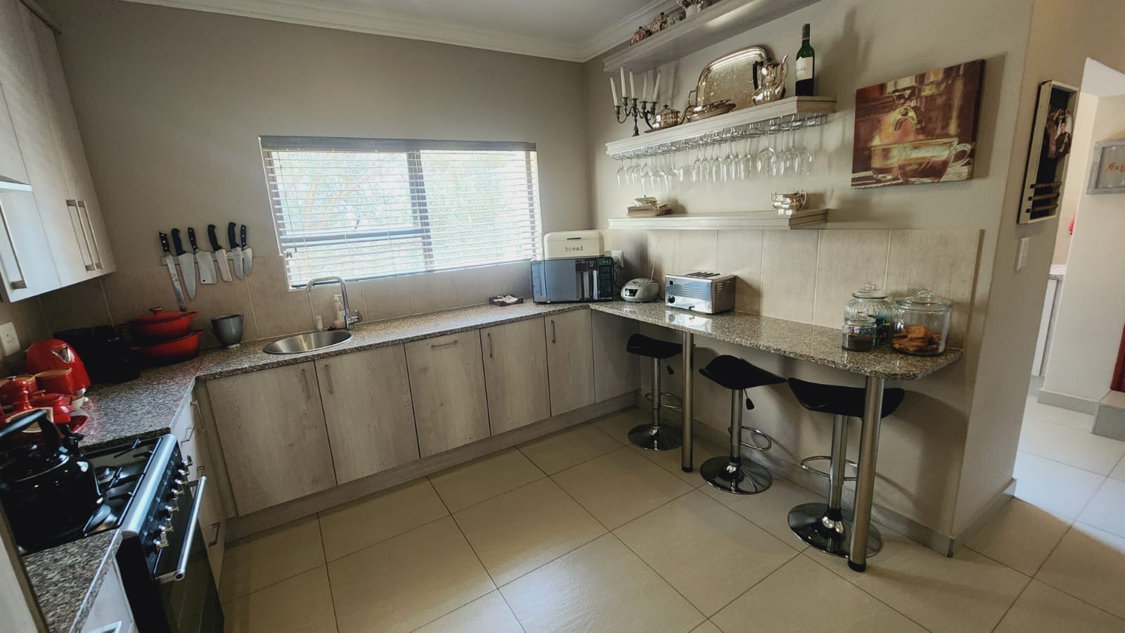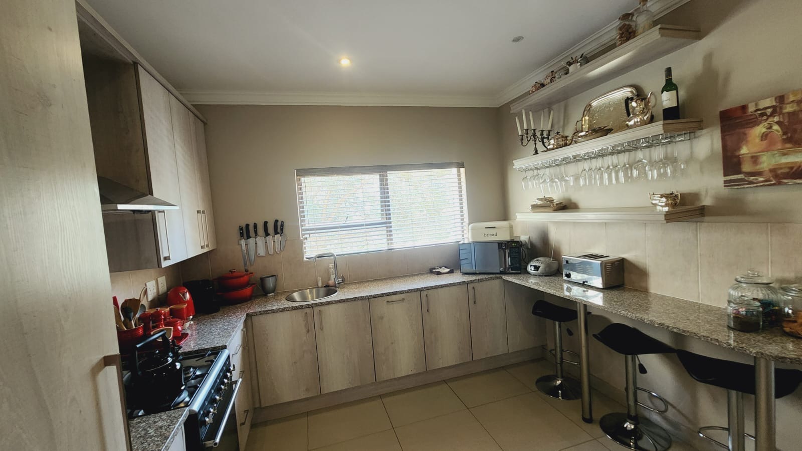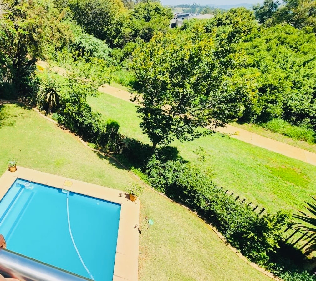 This residence boasts four comfortable bedrooms and three contemporary bathrooms. Each bathroom is thoughtfully designed with a modern vessel sink, chrome faucet, granite countertop, and light wood-grain cabinetry, reflecting a commitment to quality finishes. Practical built-in wardrobes in the bedrooms provide essential storage. The house also has a sparkling pool. Set on a generous 829.00 sqm erf, the property offers a double garage and three additional parking spaces, catering to all vehicle needs. The surrounding lush natural environment of the estate contributes to a tranquil and private setting, perfect for family life.