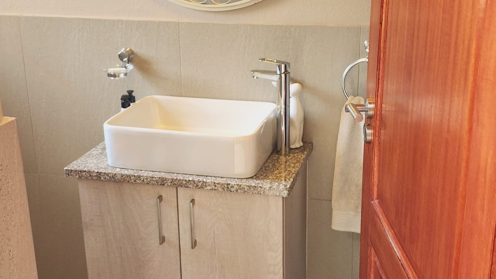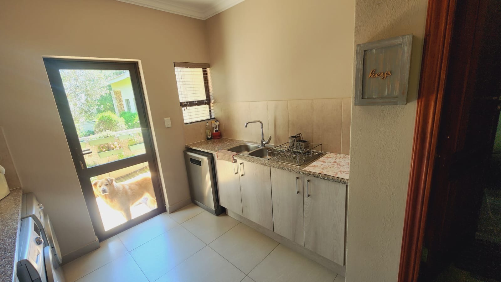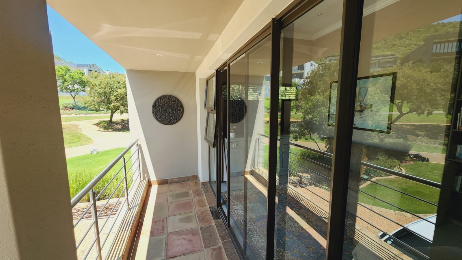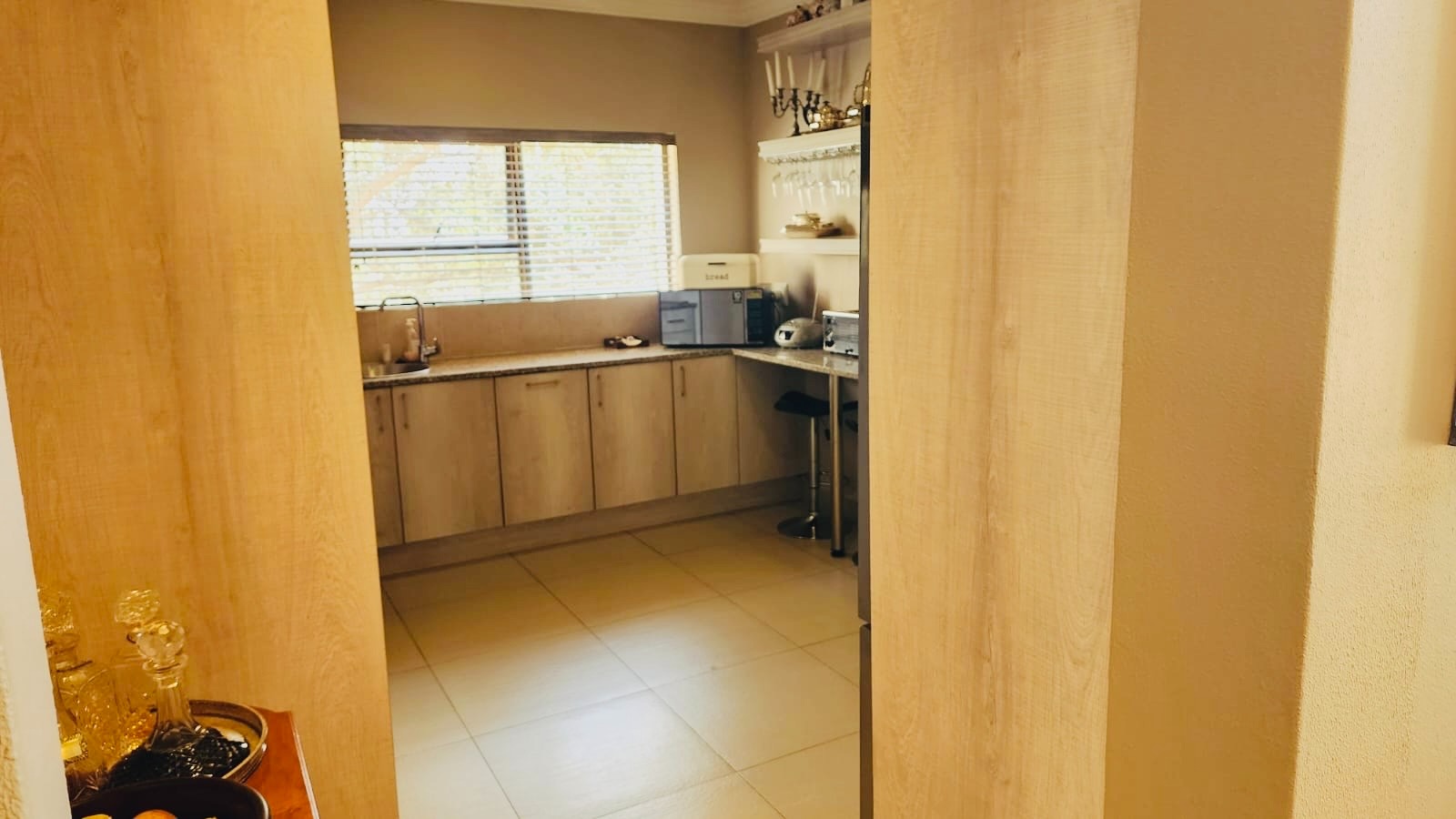 This residence boasts four comfortable bedrooms and three contemporary bathrooms. Each bathroom is thoughtfully designed with a modern vessel sink, chrome faucet, granite countertop, and light wood-grain cabinetry, reflecting a commitment to quality finishes. Practical built-in wardrobes in the bedrooms provide essential storage. The house also has a sparkling pool. Set on a generous 829.00 sqm erf, the property offers a double garage and three additional parking spaces, catering to all vehicle needs. The surrounding lush natural environment of the estate contributes to a tranquil and private setting, perfect for family life.