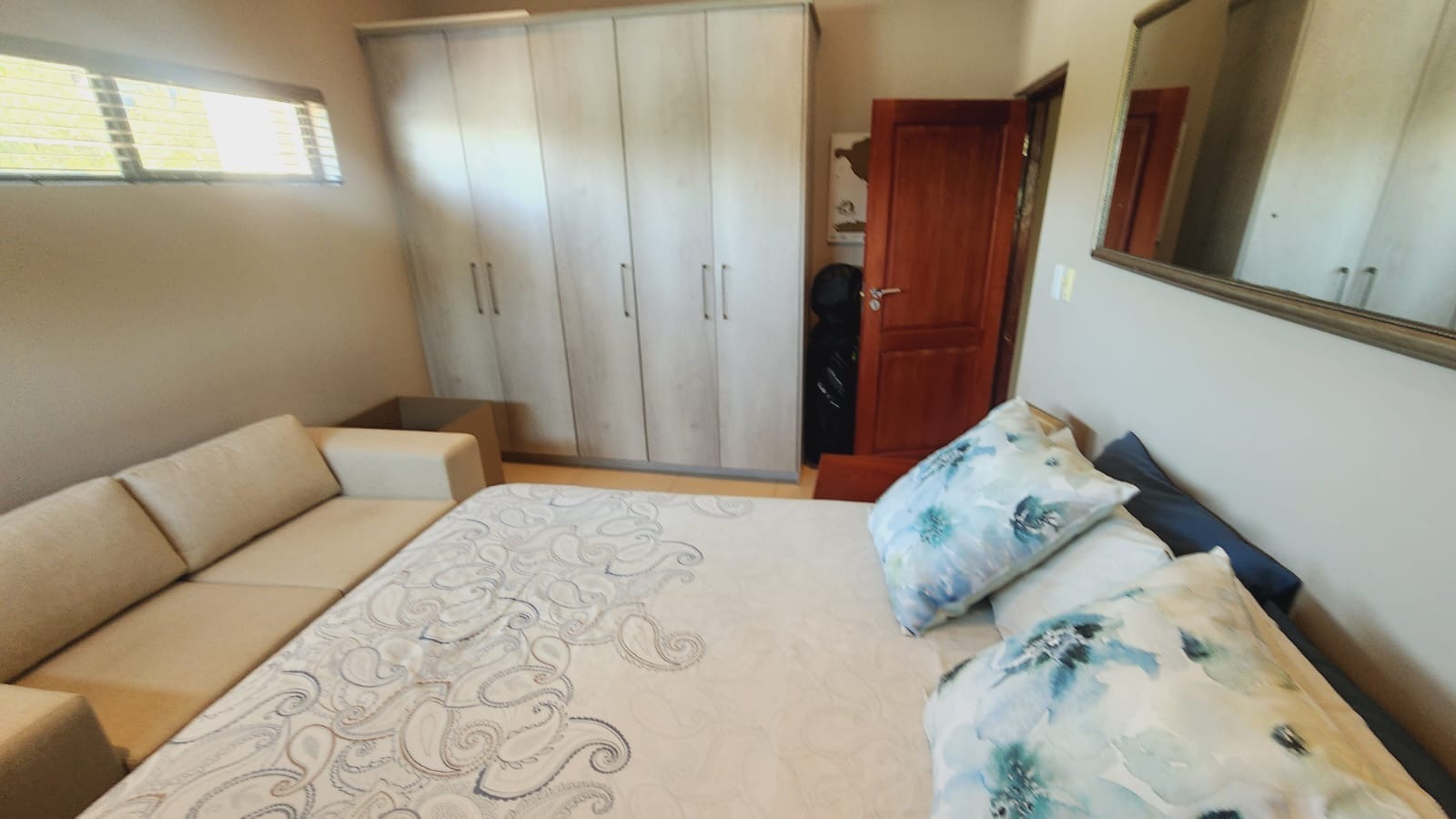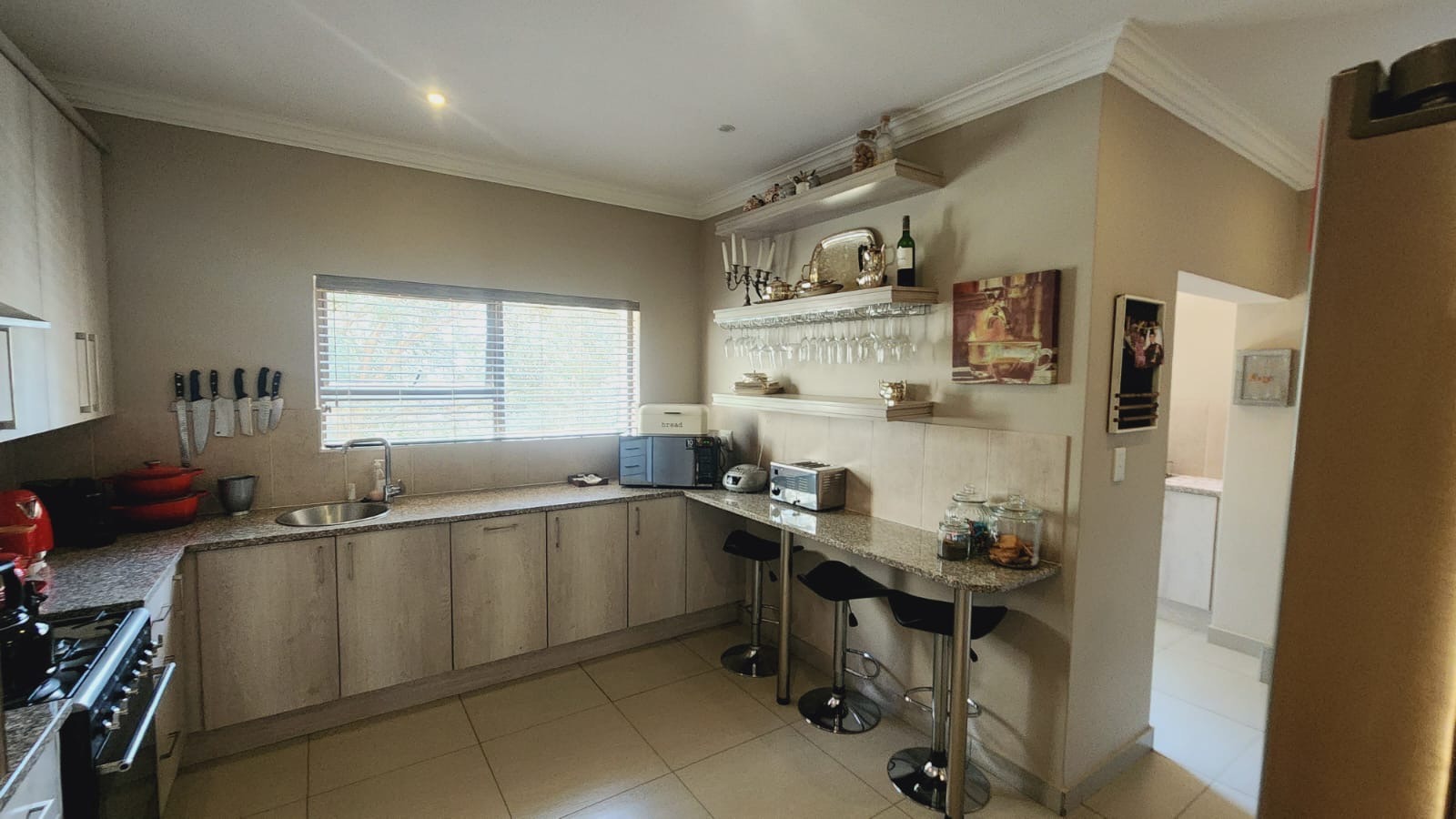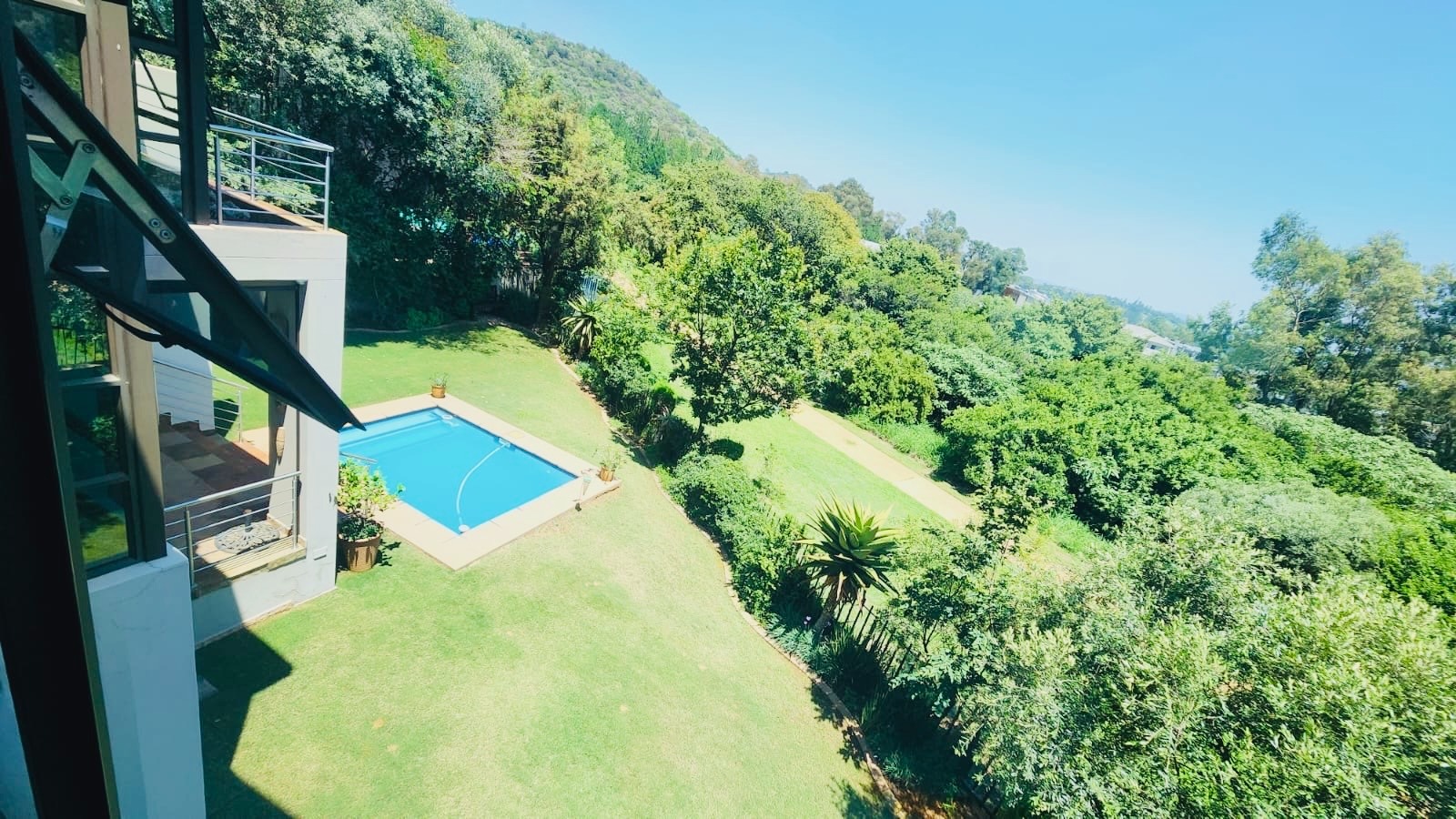 This residence boasts four comfortable bedrooms and three contemporary bathrooms. Each bathroom is thoughtfully designed with a modern vessel sink, chrome faucet, granite countertop, and light wood-grain cabinetry, reflecting a commitment to quality finishes. Practical built-in wardrobes in the bedrooms provide essential storage. The house also has a sparkling pool. Set on a generous 829.00 sqm erf, the property offers a double garage and three additional parking spaces, catering to all vehicle needs. The surrounding lush natural environment of the estate contributes to a tranquil and private setting, perfect for family life.