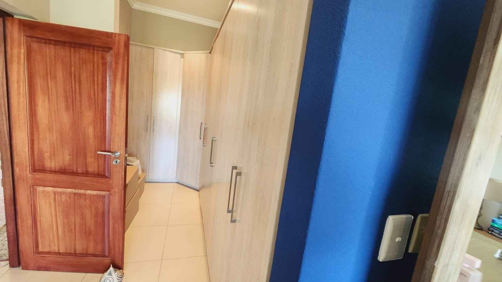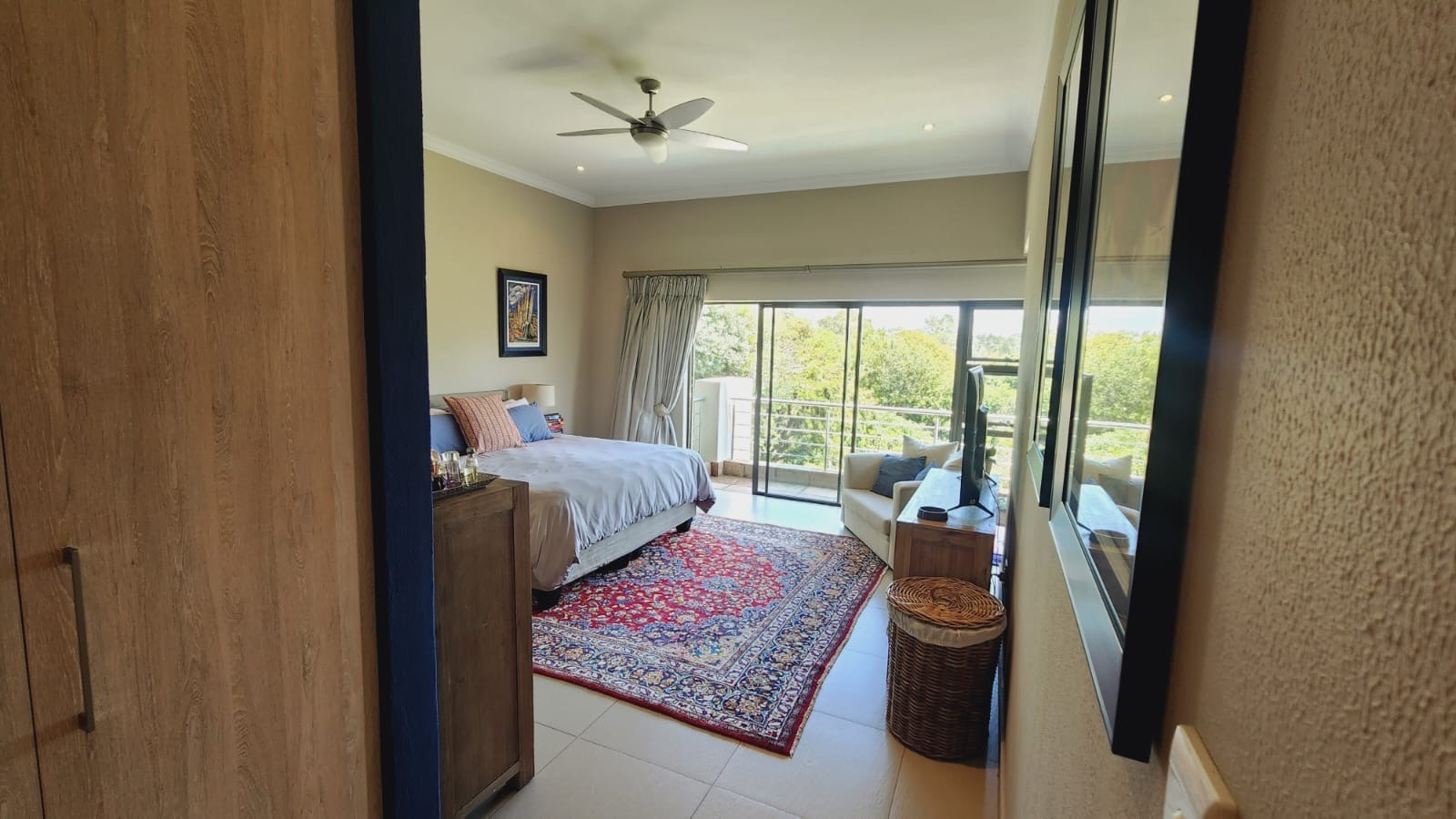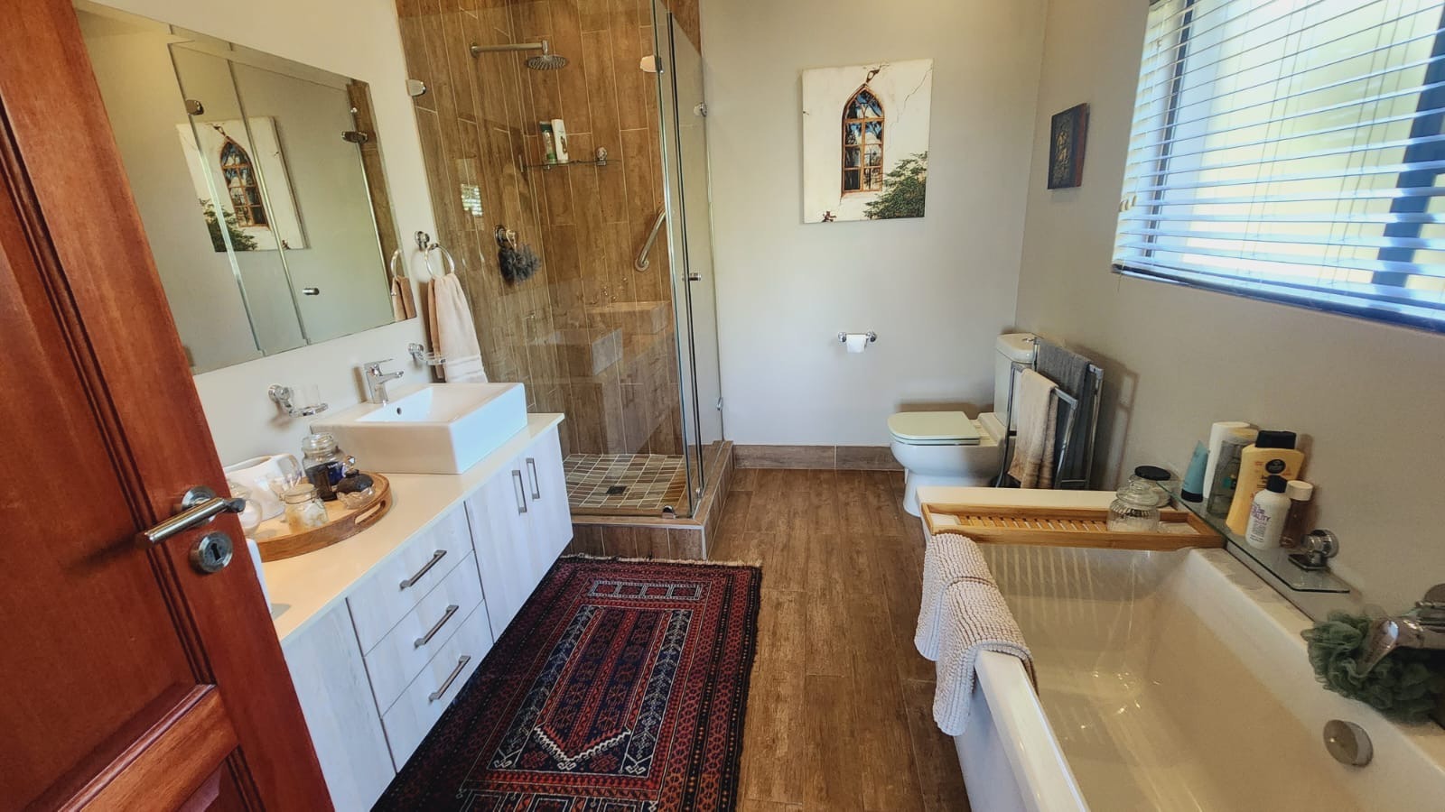 This residence boasts four comfortable bedrooms and three contemporary bathrooms. Each bathroom is thoughtfully designed with a modern vessel sink, chrome faucet, granite countertop, and light wood-grain cabinetry, reflecting a commitment to quality finishes. Practical built-in wardrobes in the bedrooms provide essential storage. The house also has a sparkling pool. Set on a generous 829.00 sqm erf, the property offers a double garage and three additional parking spaces, catering to all vehicle needs. The surrounding lush natural environment of the estate contributes to a tranquil and private setting, perfect for family life.