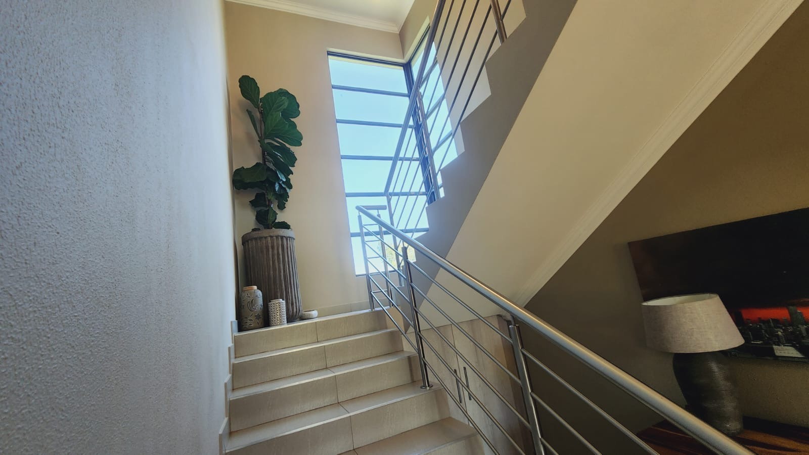 Step inside to a spacious and brightly lit entryway, featuring pristine tiled flooring that extends throughout the main living areas. A modern staircase with sleek metal railings serves as a striking architectural focal point, while integrated under-stair storage offers practical space solutions. The home provides a dedicated lounge and a separate dining room, ensuring ample space for both relaxation and entertaining.