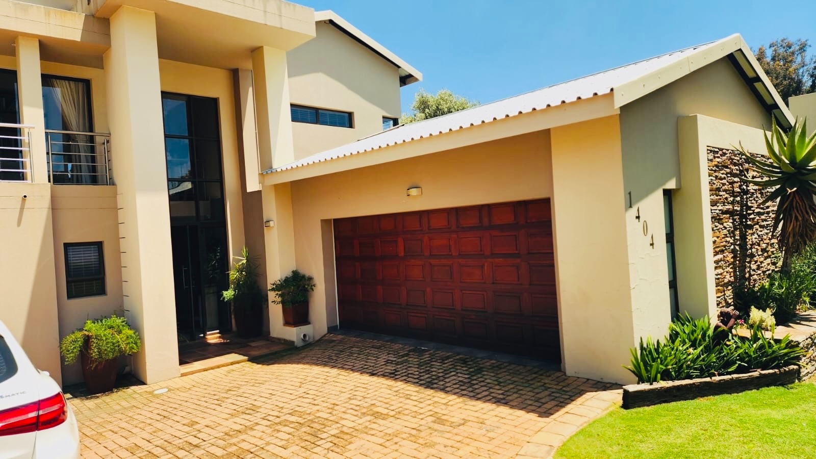 Discover contemporary living in this meticulously designed home, nestled within the esteemed Eye Of Africa Estate in Eikenhof, South Africa. The property immediately impresses with its modern architectural design, characterised by clean lines, elegant stone cladding, and a rendered facade. A prominent glass entrance and large windows invite abundant natural light, complementing the well-maintained green lawn and paved driveway that enhance its kerb appeal.