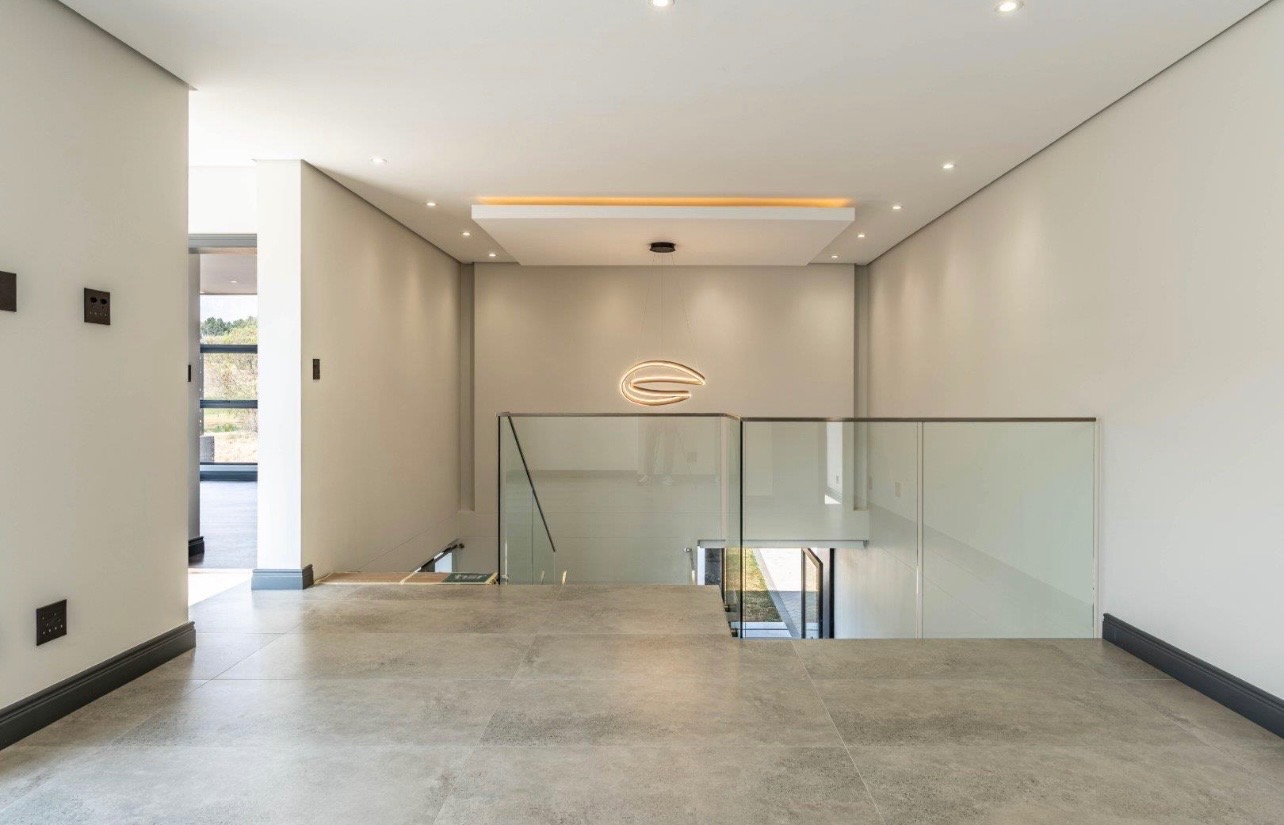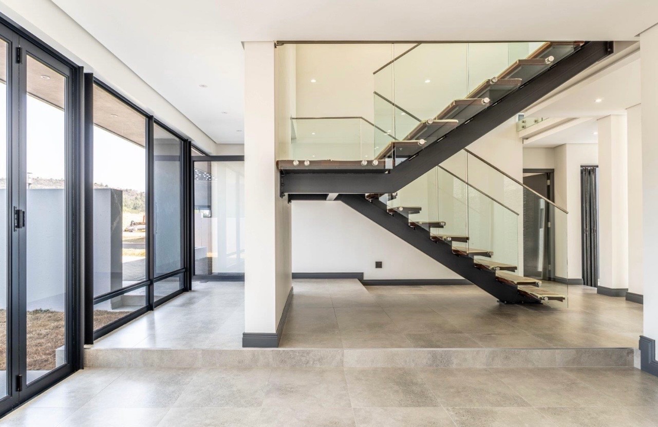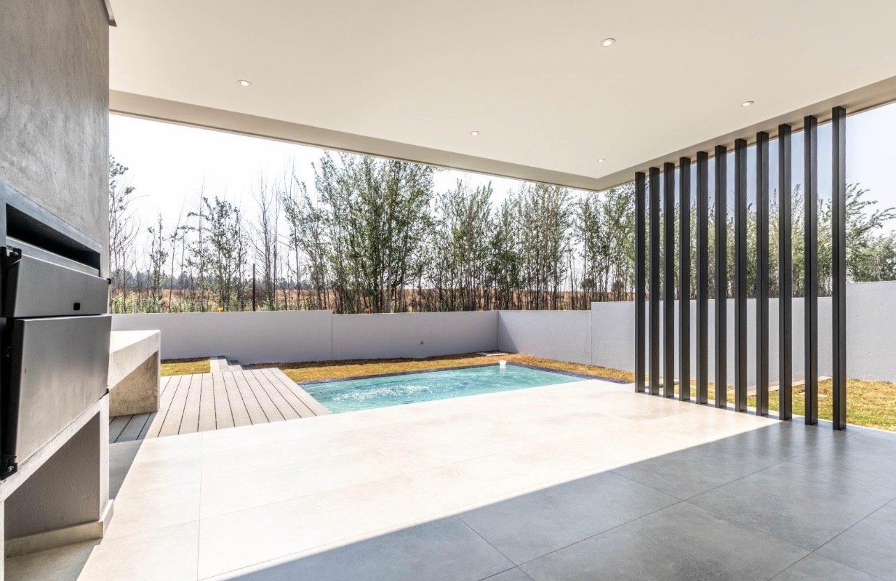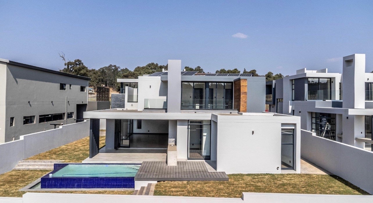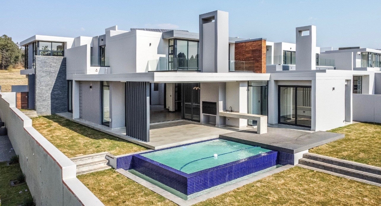 Discover contemporary luxury within the prestigious Eye Of Africa Estate, a premier golf estate in Eikenhof. This striking modern residence immediately impresses with its clean lines, stylish grey and white exterior, and elegant wood accents. Situated in a secure environment, the property benefits from 24-hour security and controlled access, offering peace of mind. Step inside to an expansive open-plan layout, bathed in natural light from large windows and sliding glass doors. High ceilings and recessed lighting enhance the spacious feel across two generous lounges and a dedicated dining area. The heart of the home is a sophisticated kitchen, boasting high-end integrated appliances, a luxurious marble island with a gas hob, and ample storage including a pantry. A striking floating staircase with glass railings serves as a modern architectural focal point. The home features four well-appointed bedrooms and four modern bathrooms, ensuring comfort and privacy. Embrace an exceptional outdoor lifestyle with a private pool, a spacious patio perfect for entertaining, and a built-in braai. The property includes a well-maintained garden, enjoys scenic views, and complements the estate's golf course amenities. A triple integrated garage provides secure parking. Committed to modern living, this home is equipped with solar panels and a solar geyser, promoting energy efficiency. Fibre connectivity ensures high-speed internet access, catering to contemporary demands. Key Features: * 4 Bedrooms, 4 Bathrooms * 3 Garages * Luxurious Kitchen with Integrated Appliances & Marble Island * Private Pool & Patio with Built-in Braai * Open-Plan Living with 2 Lounges & Dining Area * Modern Architecture & High-End Finishes * Solar Panels & Solar Geyser * Fibre Ready * Located in Eye Of Africa Golf Estate with 24-Hour Security