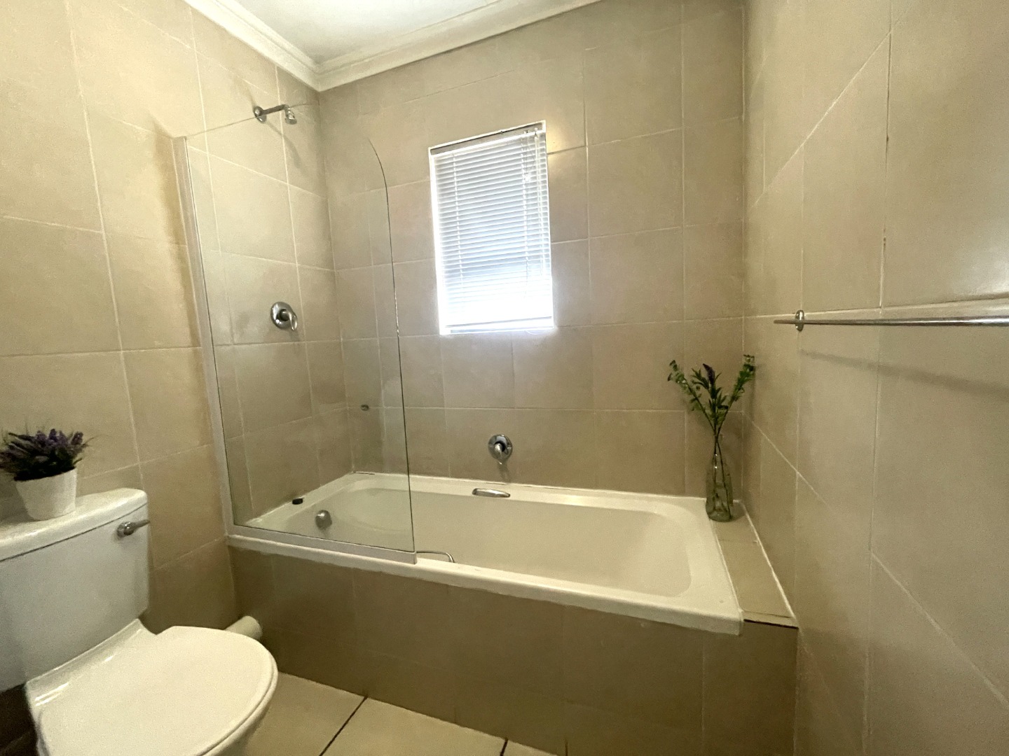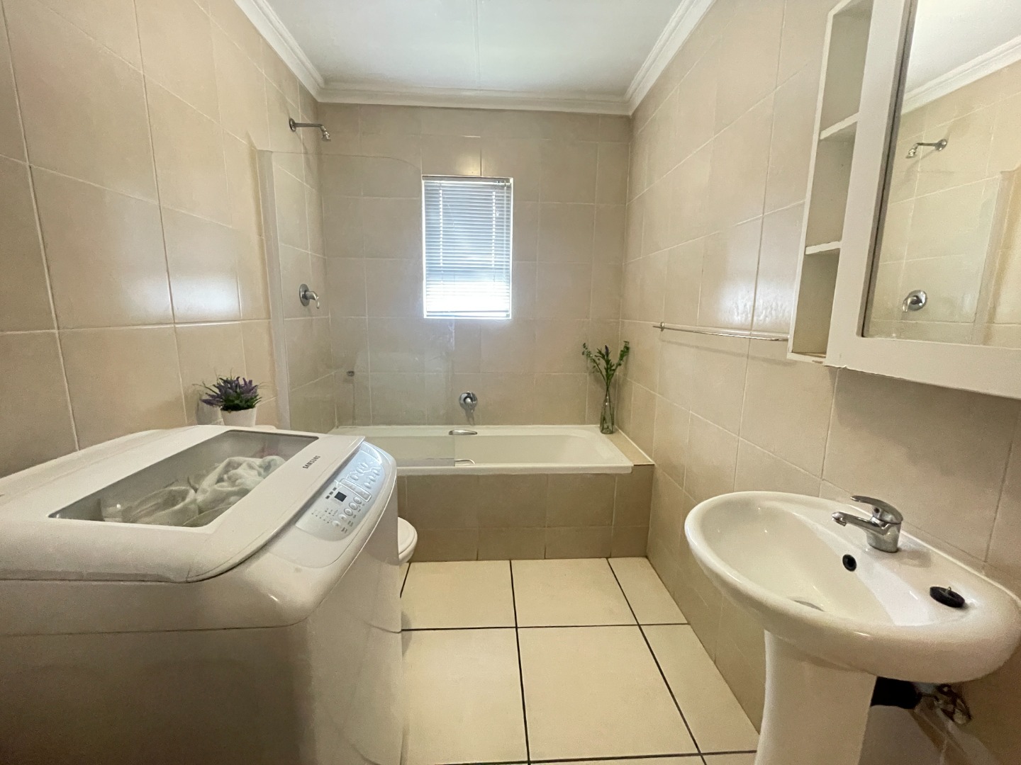 The second bathroom features a bath with an overhead shower and glass divider, basin, toilet, wall-mounted cupboard, and practical space for a washing machine—perfect for day-to-day living.