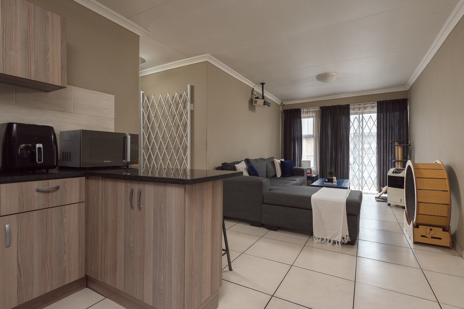 The lounge and kitchen areas are open plan. It is complete with tiled flooring and neutral walls which provides a versatile space for relaxation and entertainment, enhanced by a sliding and security door leading to the balcony with stunning mountain views. It is complimented by cupboards that open in the lounge to enjoy all your snacks whilst relaxing.