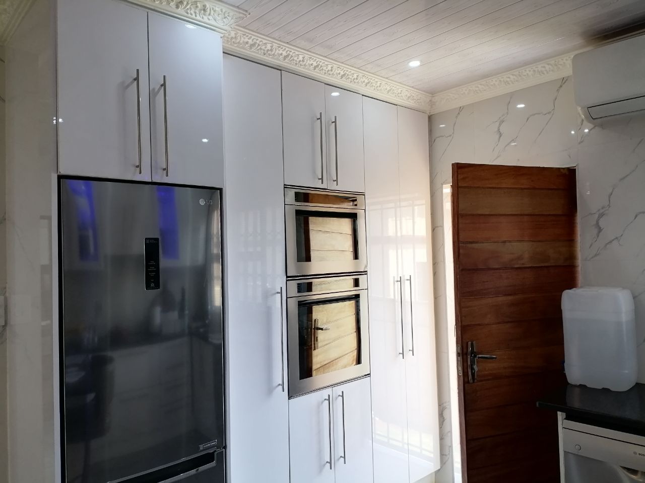 The spacious lounge area is a highlight, featuring an abundant natural light filtering through a wide window. The modern kitchen is a culinary delight, boasting sleek white cabinetry, dark countertops, and a stylish marble-look backsplash. It comes equipped with a washing machine point, and benefits from an air conditioning unit for year-round comfort. A practical breakfast bar with seating adds to its functionality.