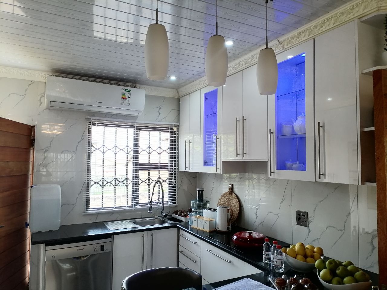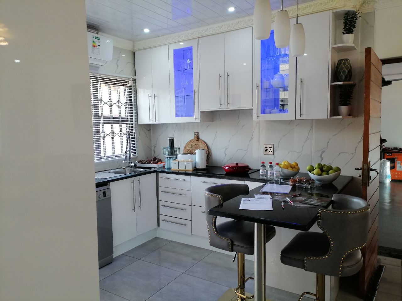 The spacious lounge area is a highlight, featuring an abundant natural light filtering through a wide window. The modern kitchen is a culinary delight, boasting sleek white cabinetry, dark countertops, and a stylish marble-look backsplash. It comes equipped with a washing machine point, and benefits from an air conditioning unit for year-round comfort. A practical breakfast bar with seating adds to its functionality.