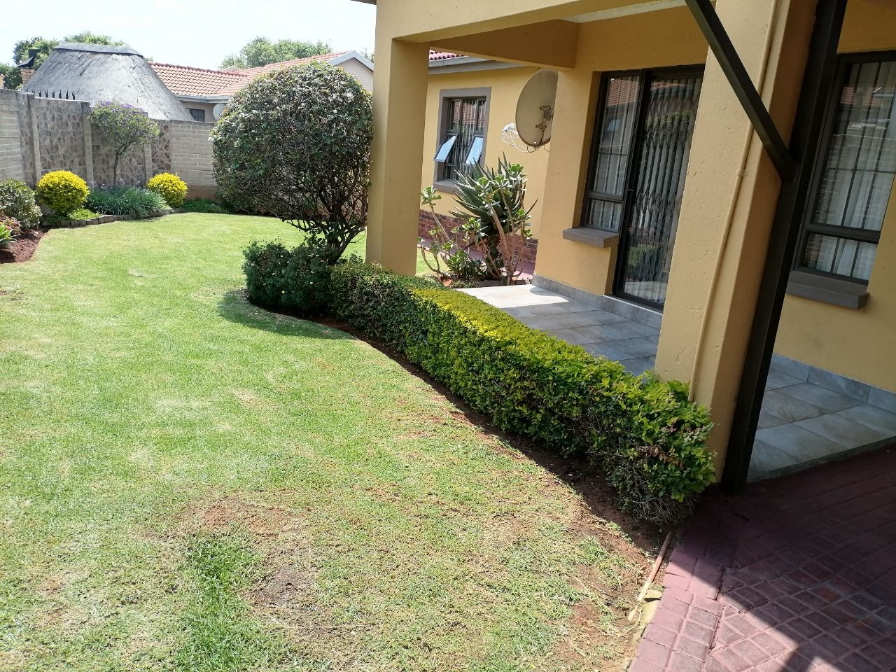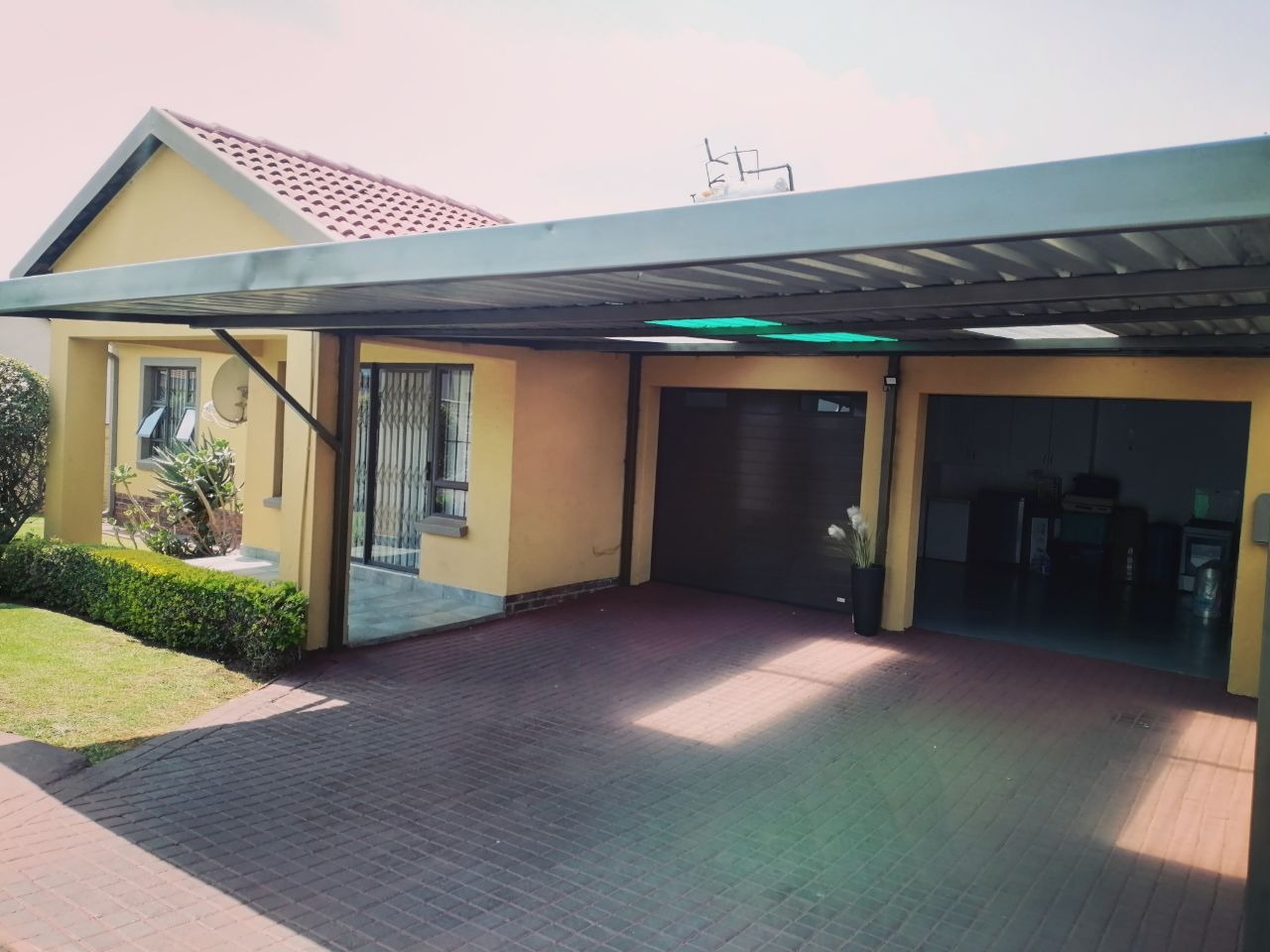 Nestled within a desirable complex in Albemarle, Germiston, this charming residential property offers a blend of comfort and modern living. The exterior presents welcoming kerb appeal with its well-maintained yellow facade, classic red tiled roof, and an established green lawn and garden. A paved driveway leads to a substantial garage, providing ample secure parking for residents and guests. Security is enhanced with visible bars on all windows, ensuring peace of mind.