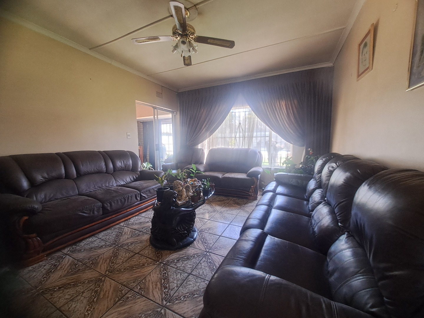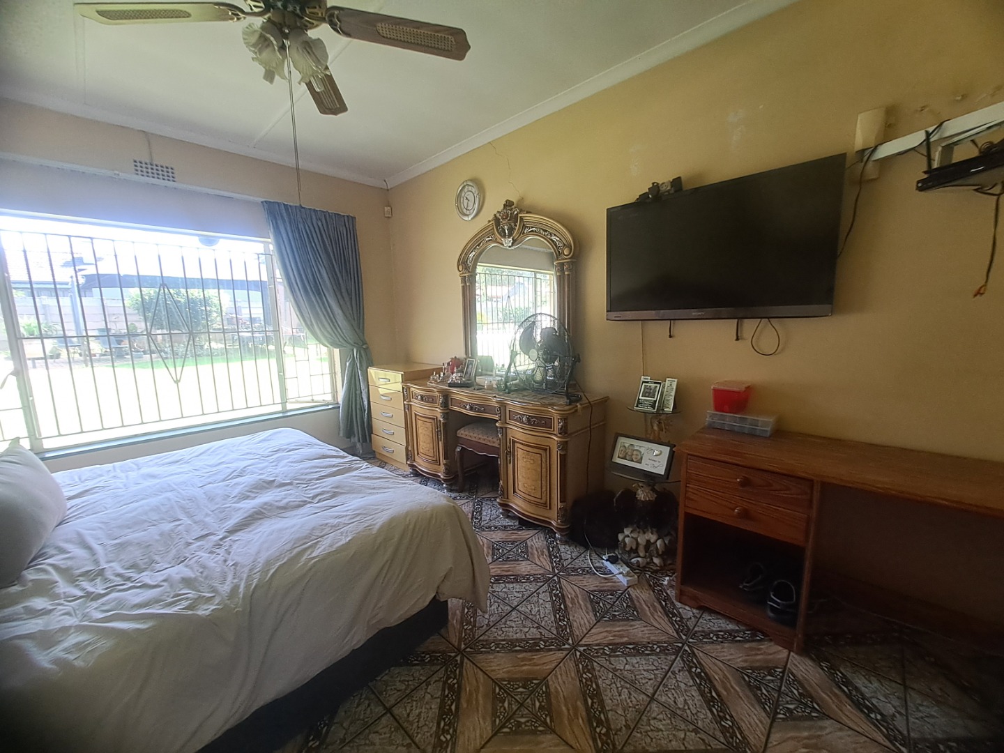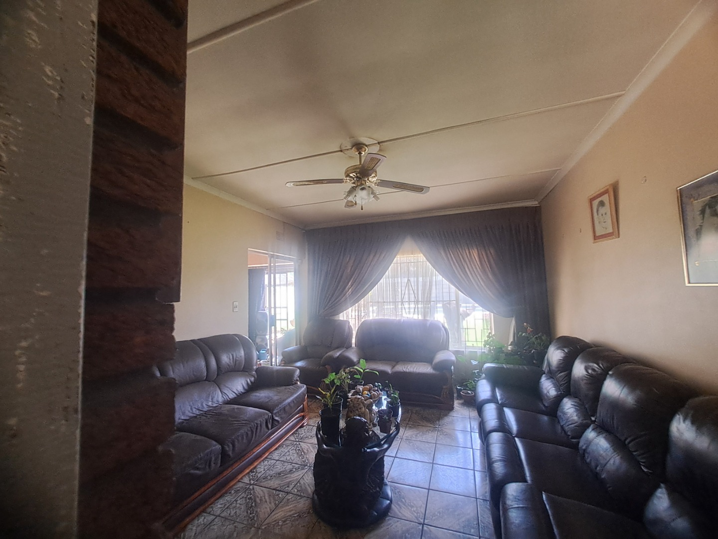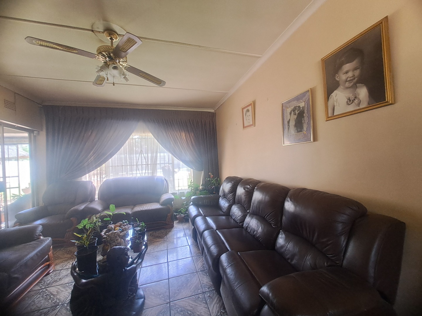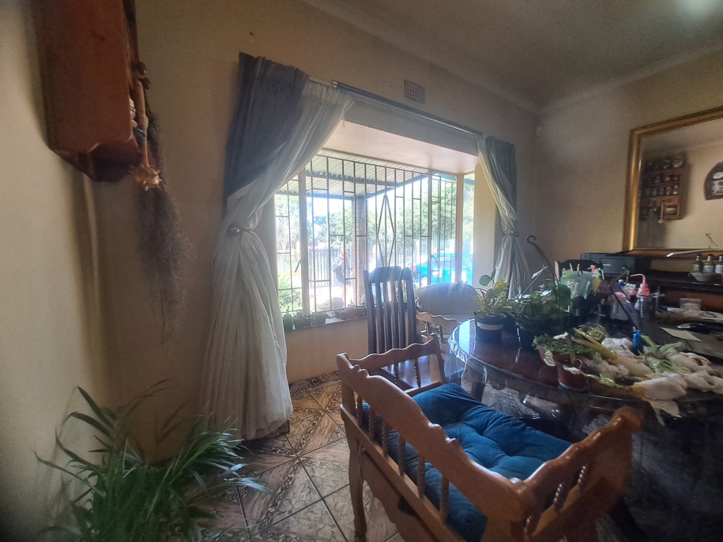 The home features three well-proportioned bedrooms and two bathrooms, catering to family needs. While the interior spaces, including the living areas seen in the photos, present a lived-in charm with textured walls and tiled flooring, they offer a fantastic canvas for new owners to infuse their personal style and undertake modern updates. Natural light streams through large windows, many fitted with security bars, enhancing the bright atmosphere.
