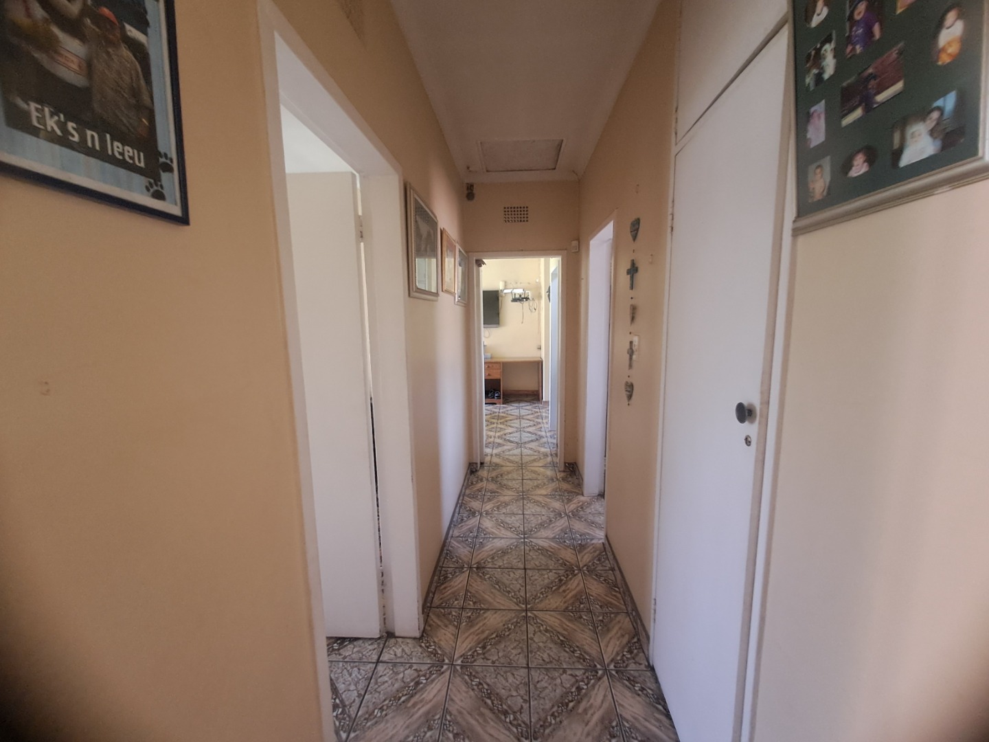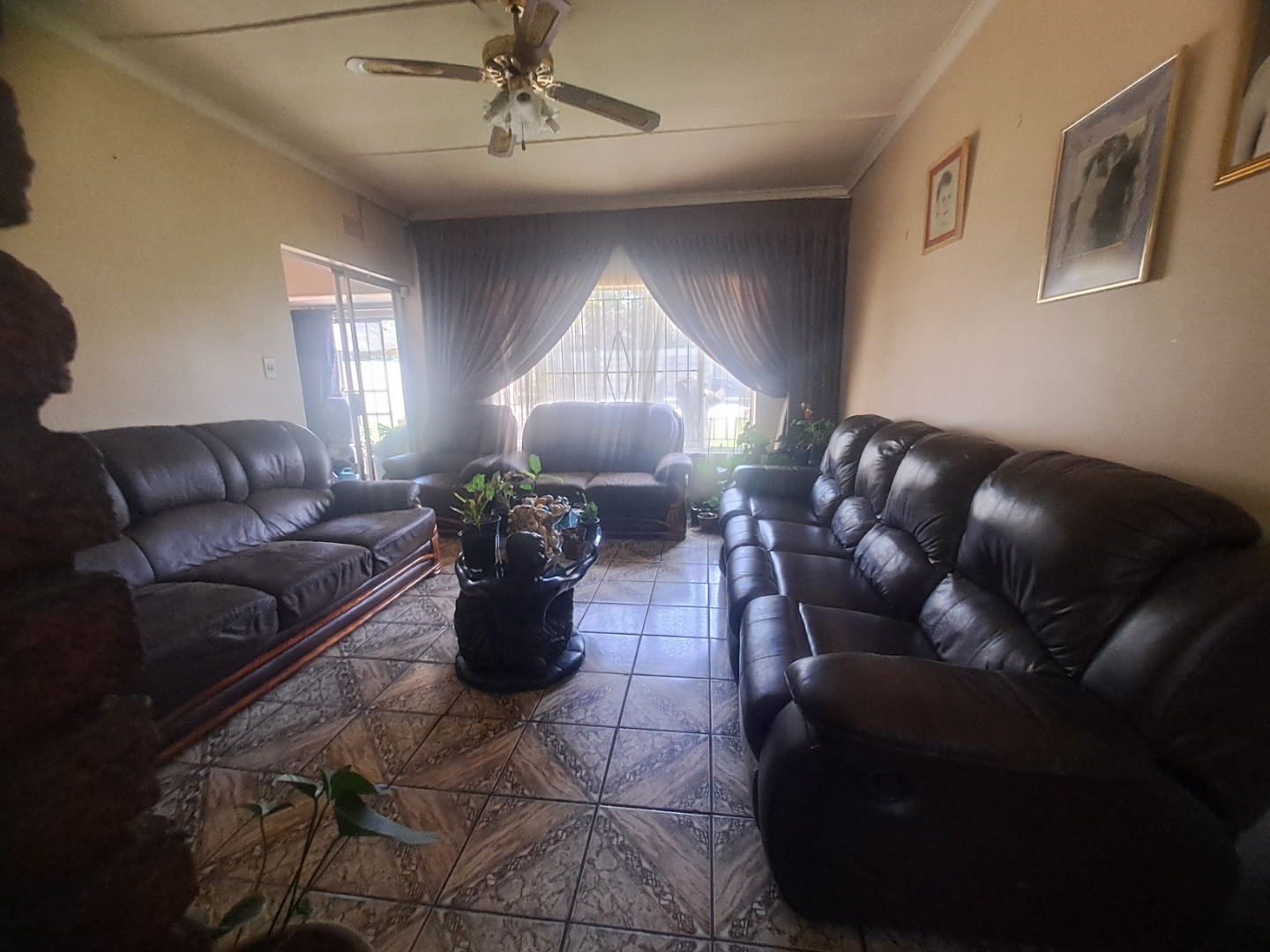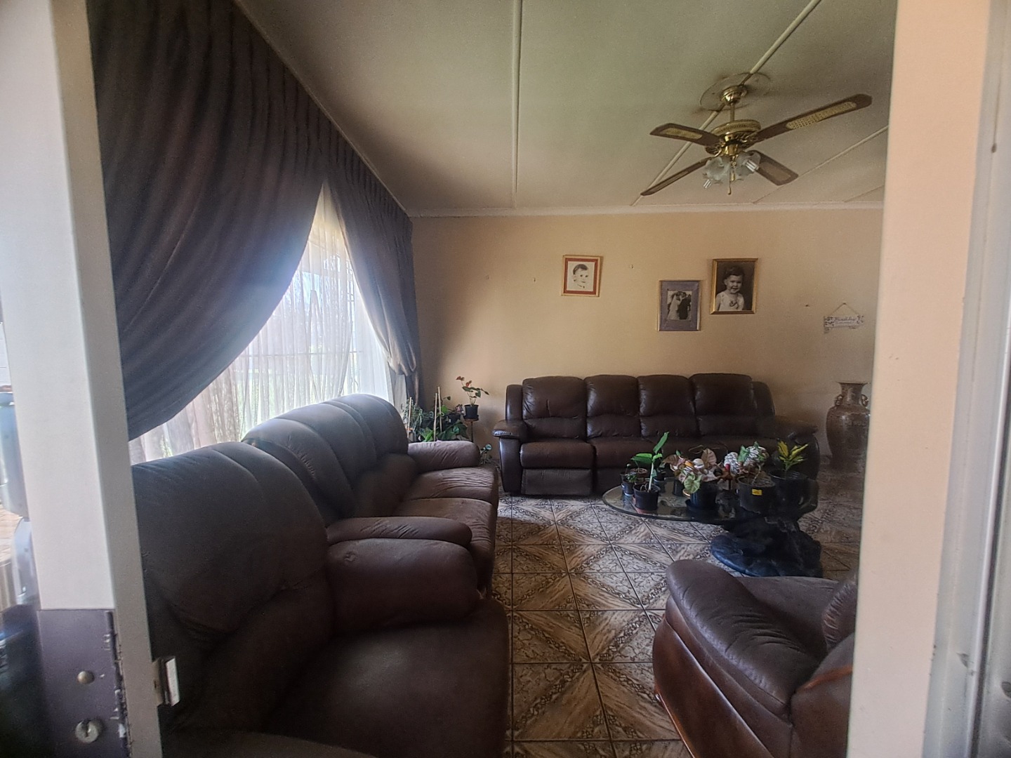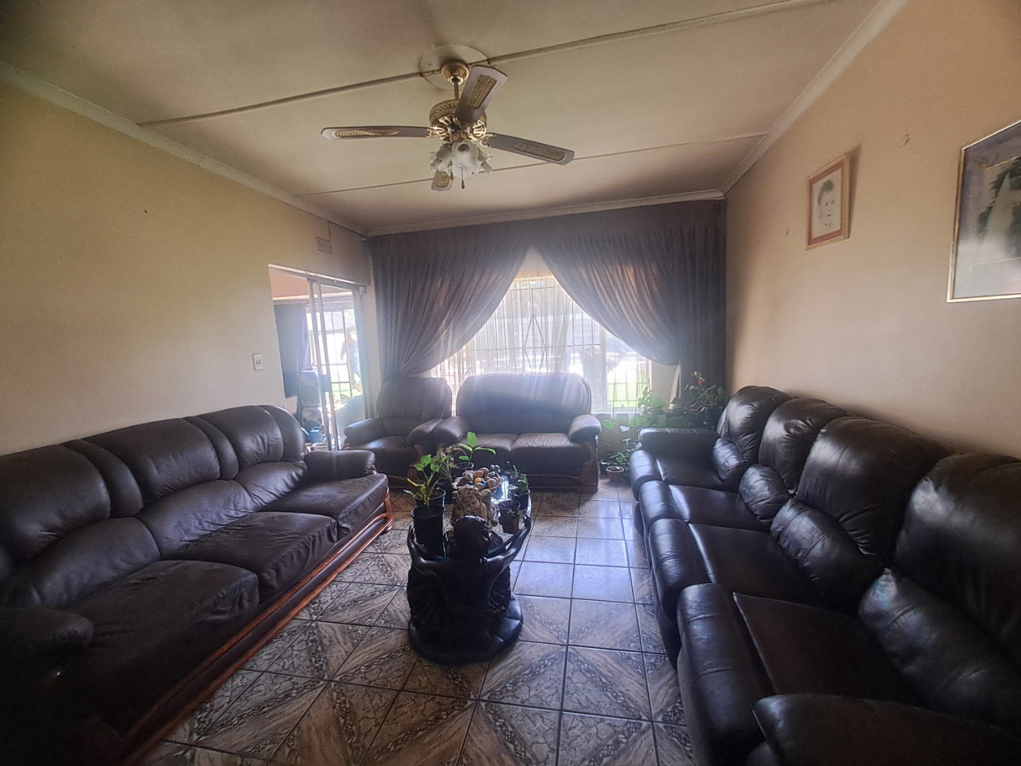 The home features three well-proportioned bedrooms and two bathrooms, catering to family needs. While the interior spaces, including the living areas seen in the photos, present a lived-in charm with textured walls and tiled flooring, they offer a fantastic canvas for new owners to infuse their personal style and undertake modern updates. Natural light streams through large windows, many fitted with security bars, enhancing the bright atmosphere.