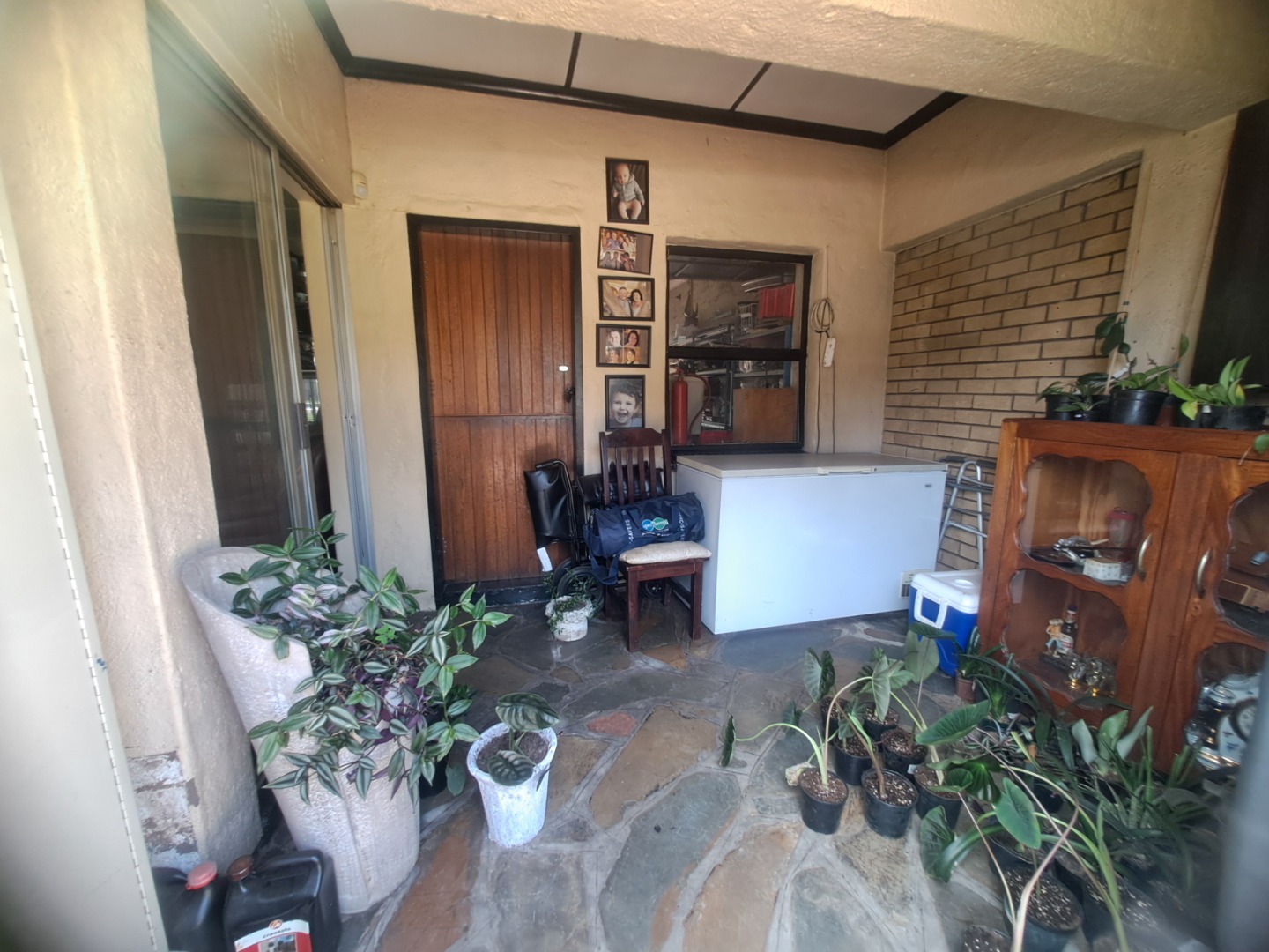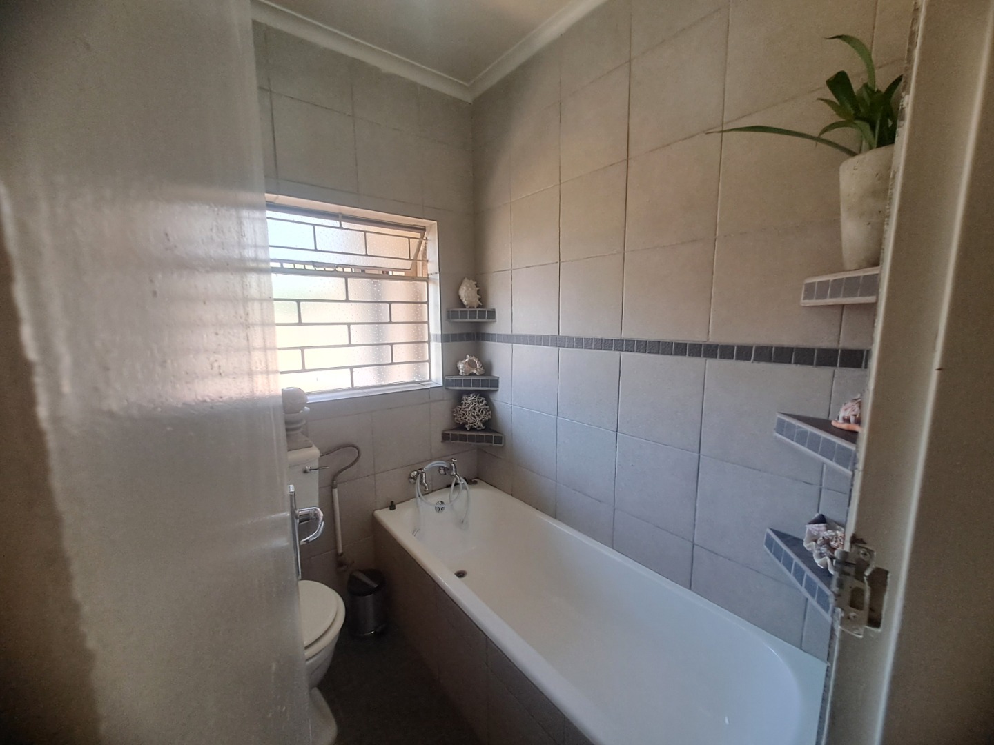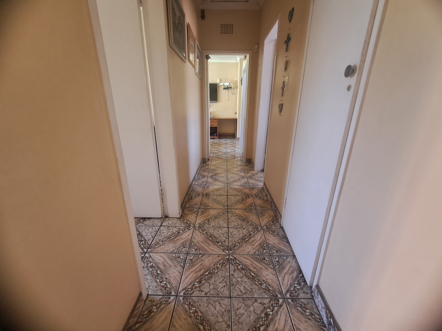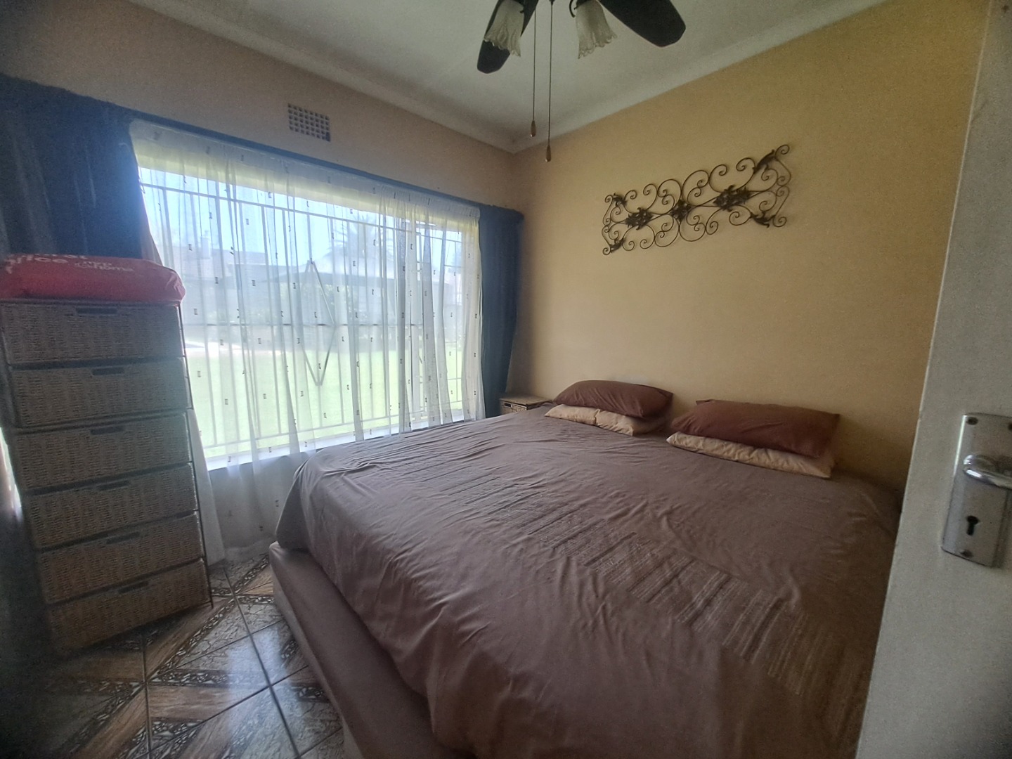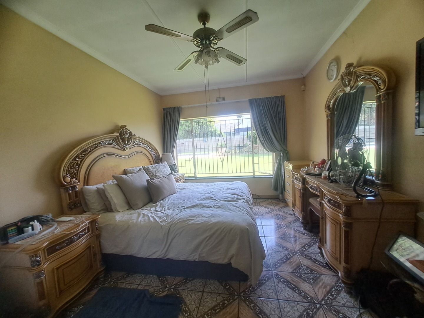 The home features three well-proportioned bedrooms and two bathrooms, catering to family needs. While the interior spaces, including the living areas seen in the photos, present a lived-in charm with textured walls and tiled flooring, they offer a fantastic canvas for new owners to infuse their personal style and undertake modern updates. Natural light streams through large windows, many fitted with security bars, enhancing the bright atmosphere.