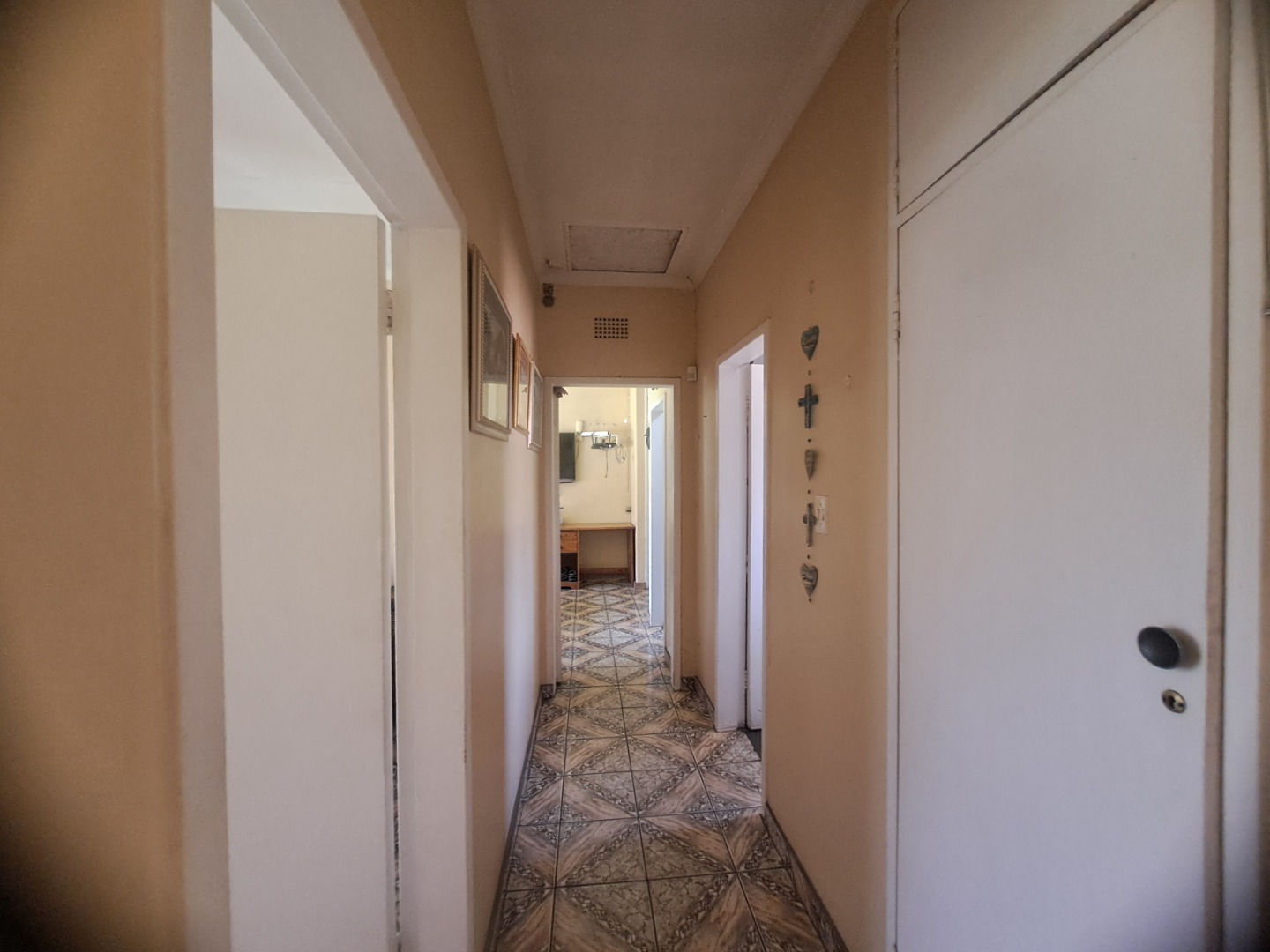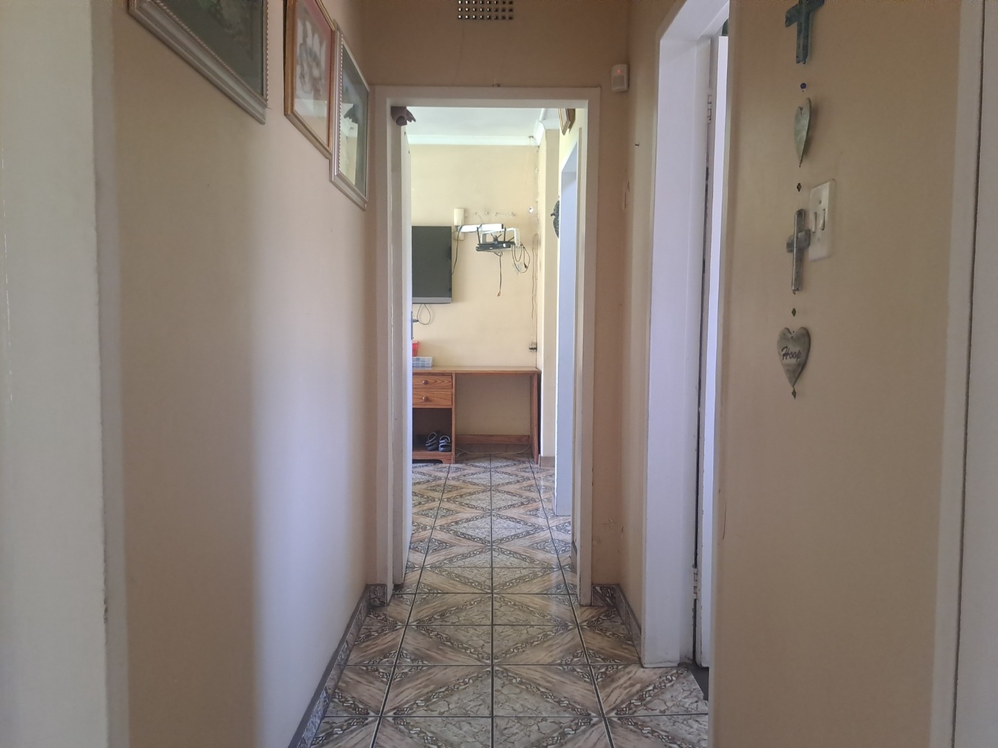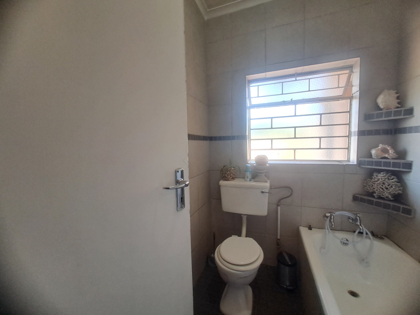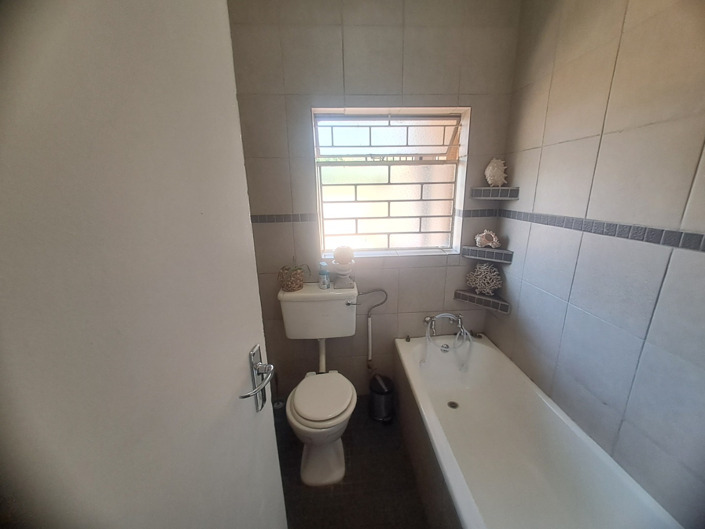 The home features three well-proportioned bedrooms and two bathrooms, catering to family needs. While the interior spaces, including the living areas seen in the photos, present a lived-in charm with textured walls and tiled flooring, they offer a fantastic canvas for new owners to infuse their personal style and undertake modern updates. Natural light streams through large windows, many fitted with security bars, enhancing the bright atmosphere.