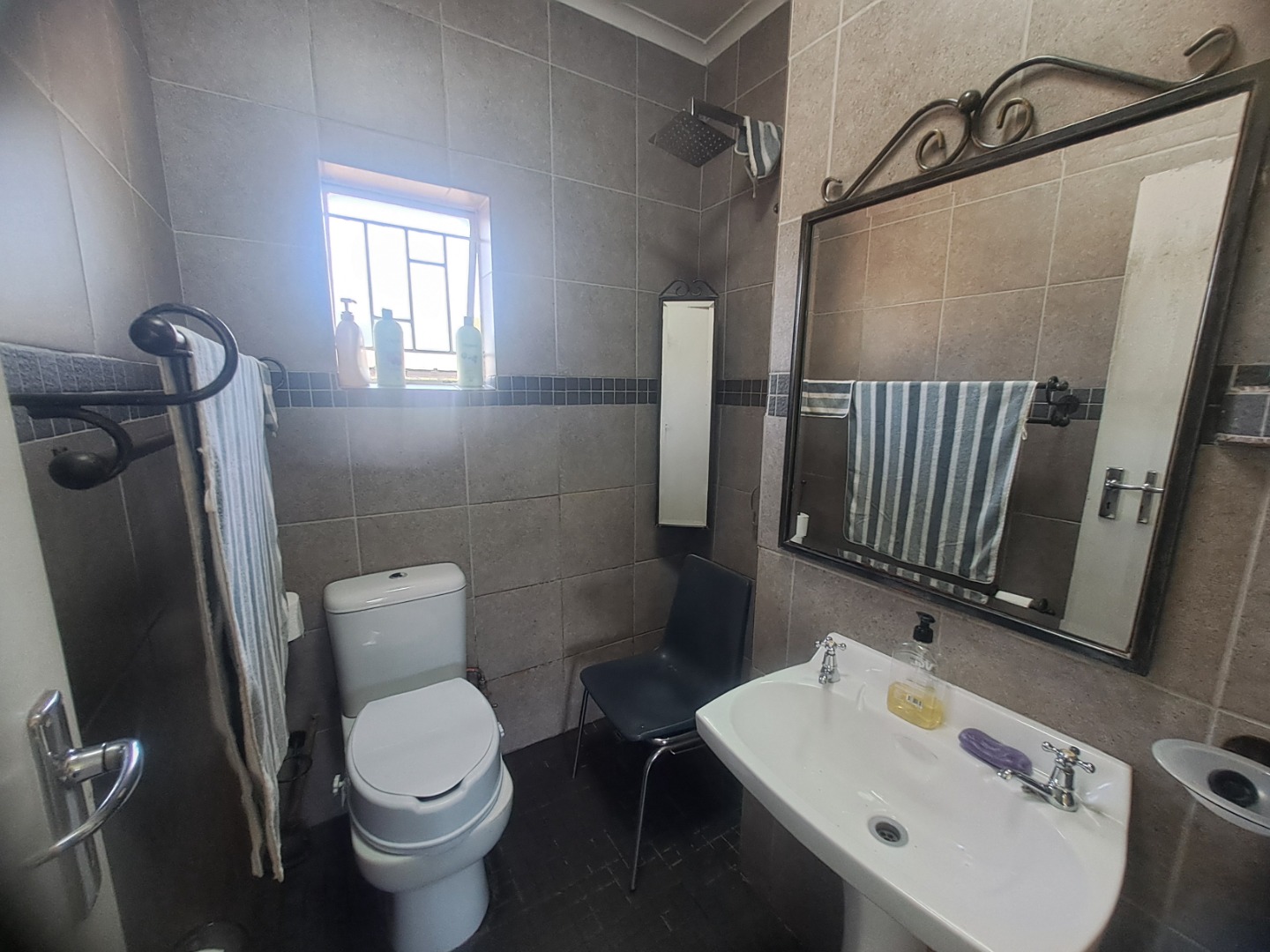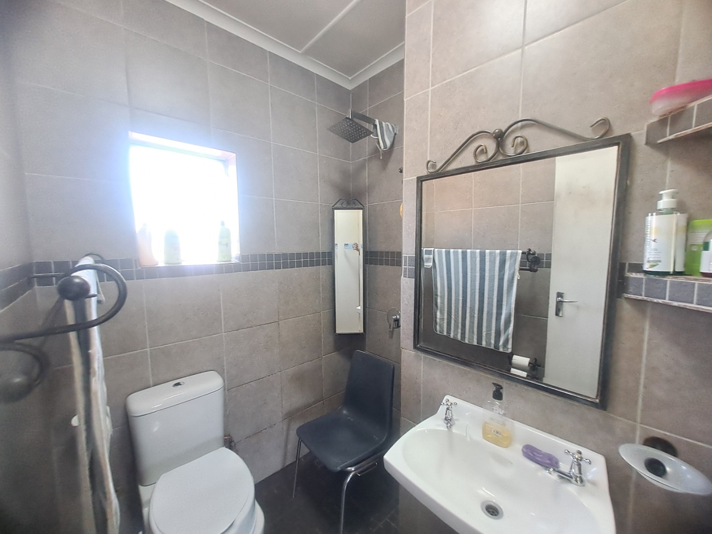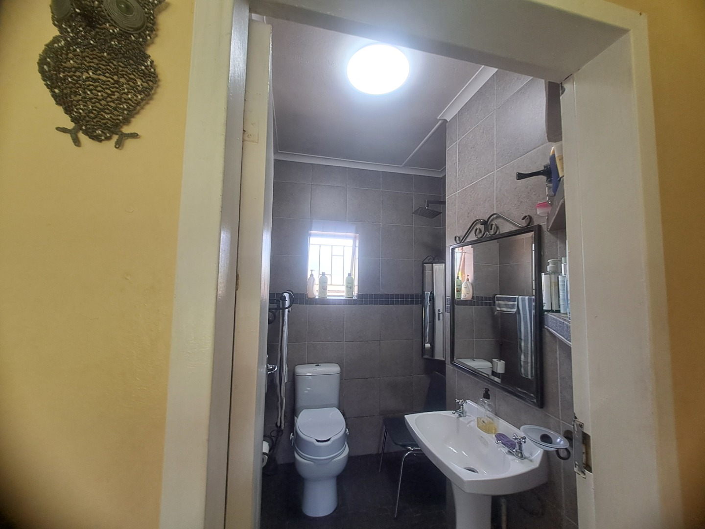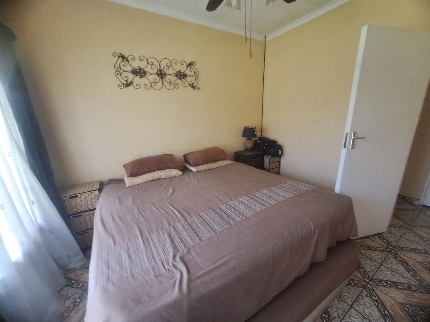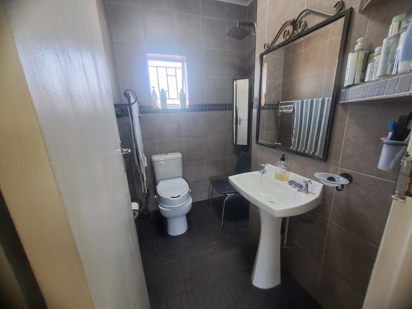 The home features three well-proportioned bedrooms and two bathrooms, catering to family needs. While the interior spaces, including the living areas seen in the photos, present a lived-in charm with textured walls and tiled flooring, they offer a fantastic canvas for new owners to infuse their personal style and undertake modern updates. Natural light streams through large windows, many fitted with security bars, enhancing the bright atmosphere.