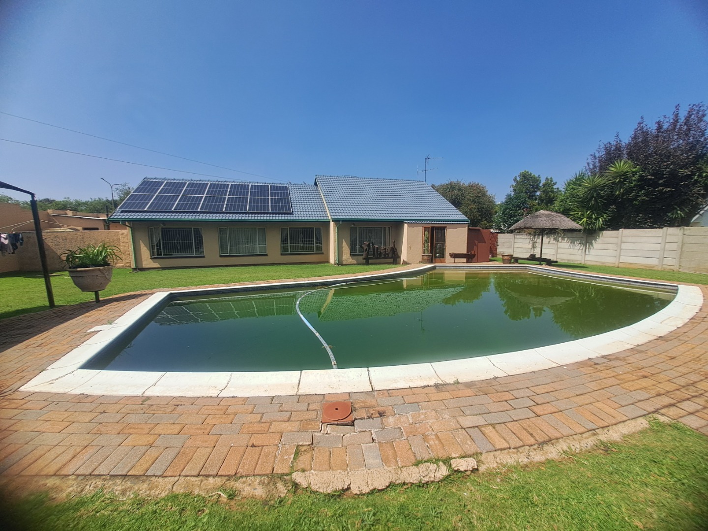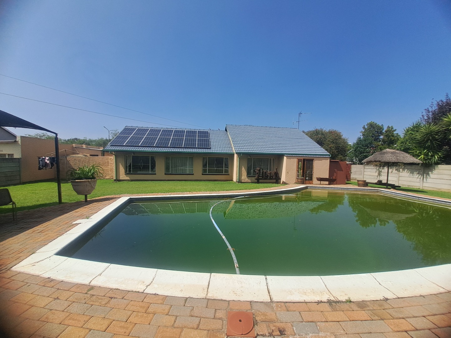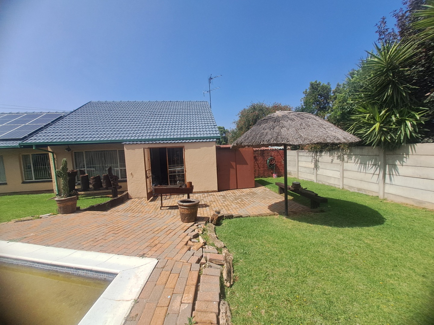 Security and sustainability are considered, with an access gate and burglar bars providing peace of mind. The inclusion of solar panels offers energy efficiency benefits, contributing to lower utility costs. The property is totally walled, ensuring privacy and security, and is pet-friendly.