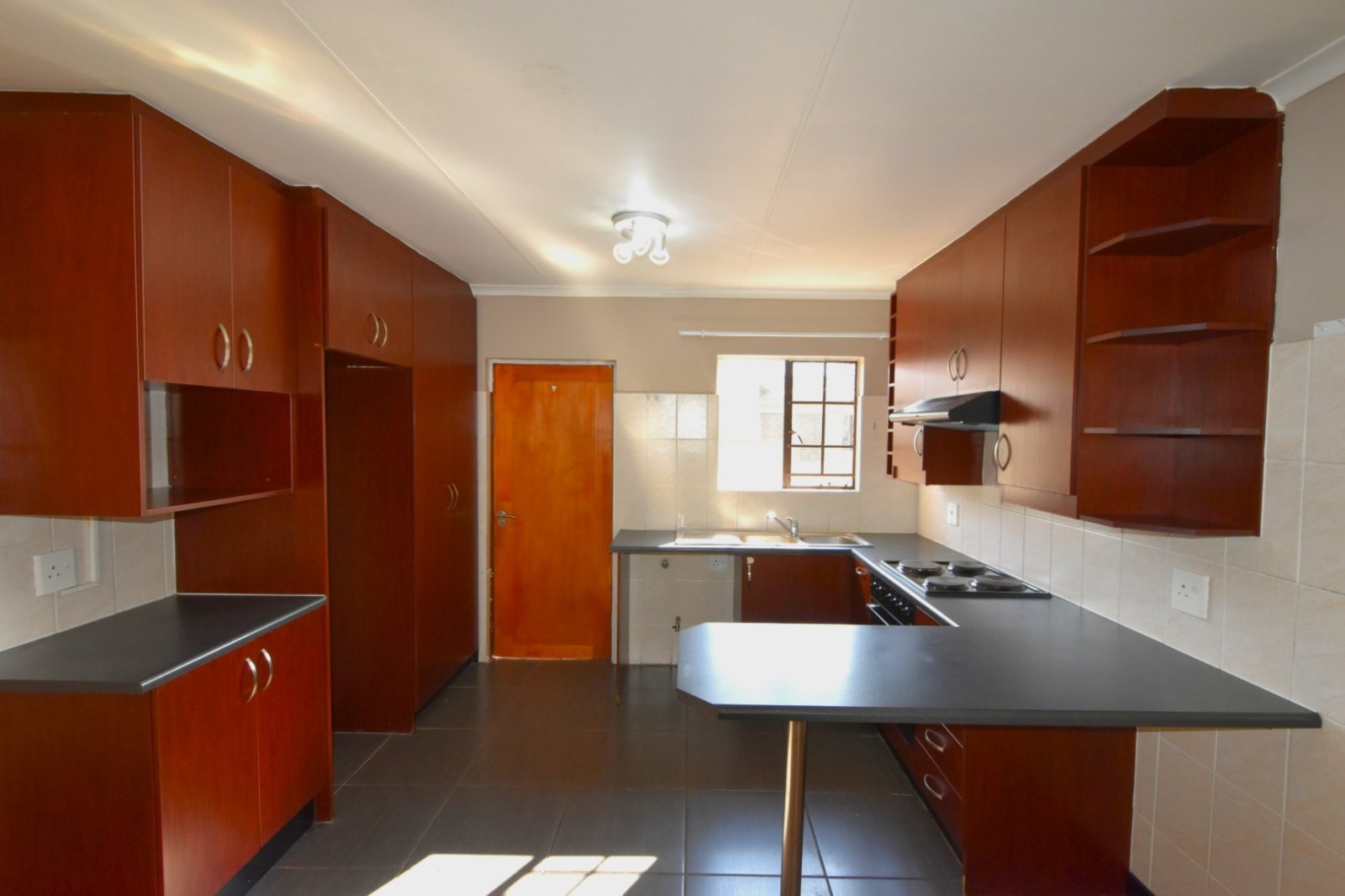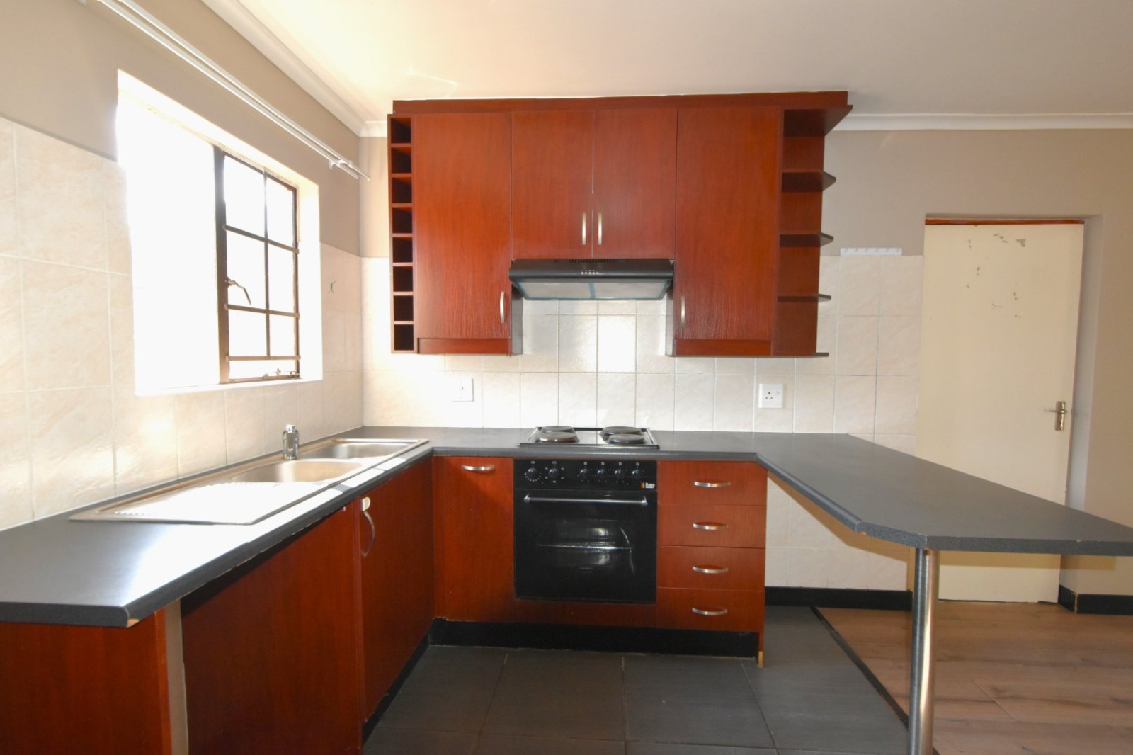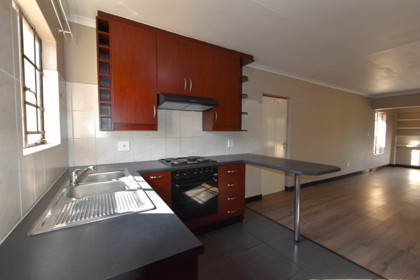 Discover this inviting 3-bedroom, 2-bathroom residence situated within a secure complex in Albemarle, Germiston. Designed for practical living, the home features an open-plan layout seamlessly connecting the kitchen and living areas, bathed in natural light from well-placed windows. The functional kitchen is equipped with dark wood cabinetry, offering ample storage, an integrated wine rack, a convenient breakfast bar, and essential built-in appliances including a stove, oven, and extractor fan. Tiled flooring in the kitchen transitions smoothly to laminate in the adjacent living space, which also benefits from built-in shelving.
